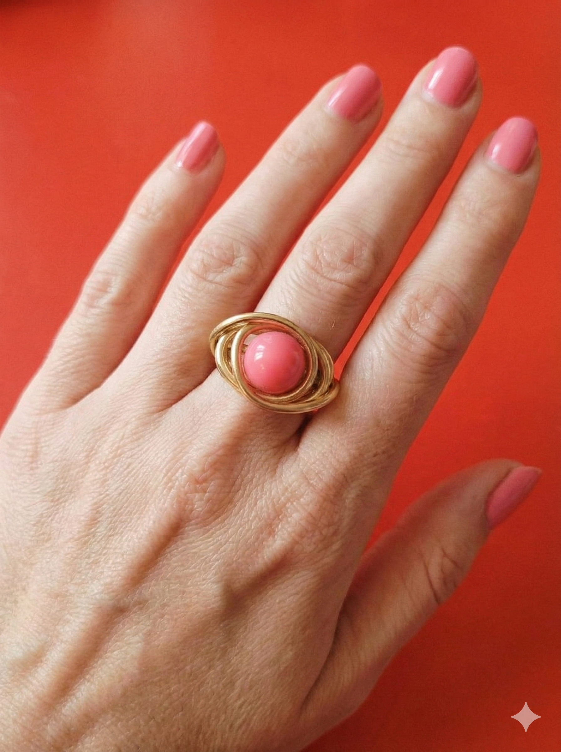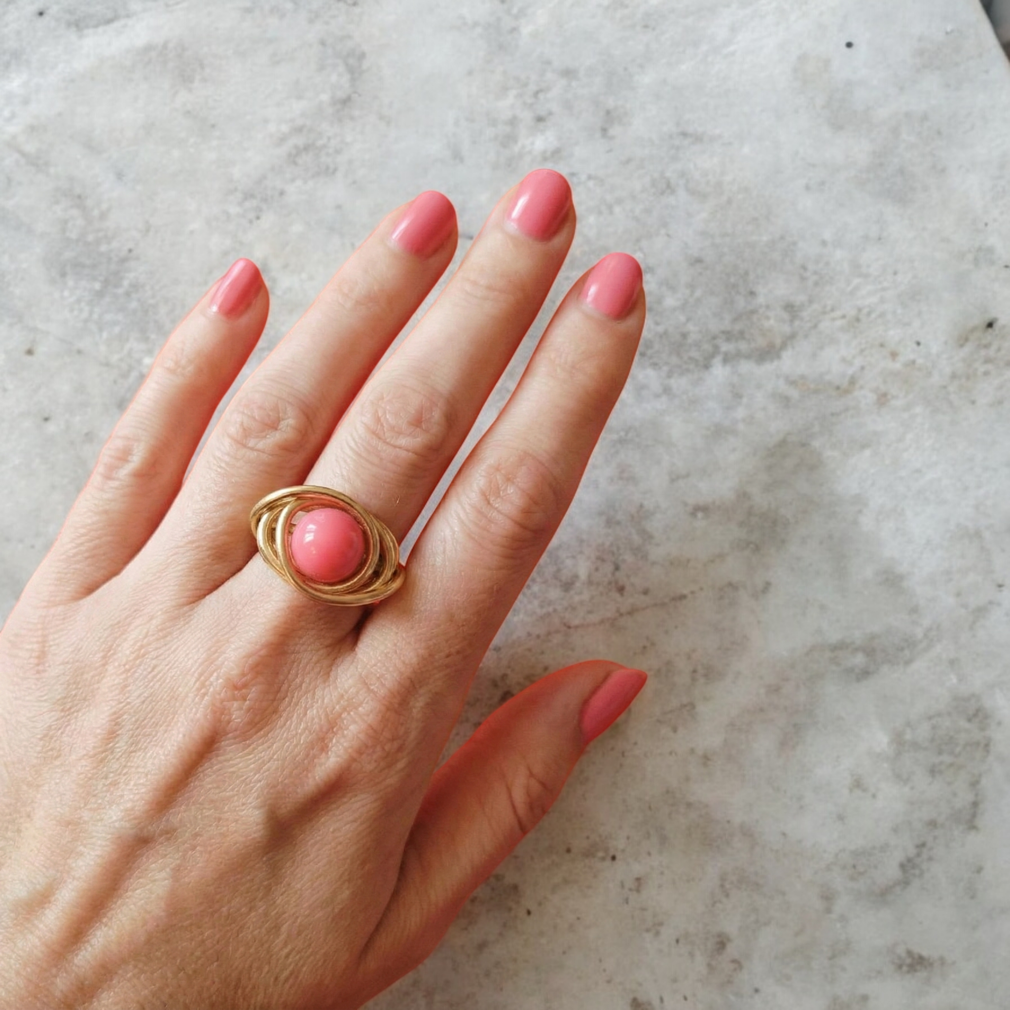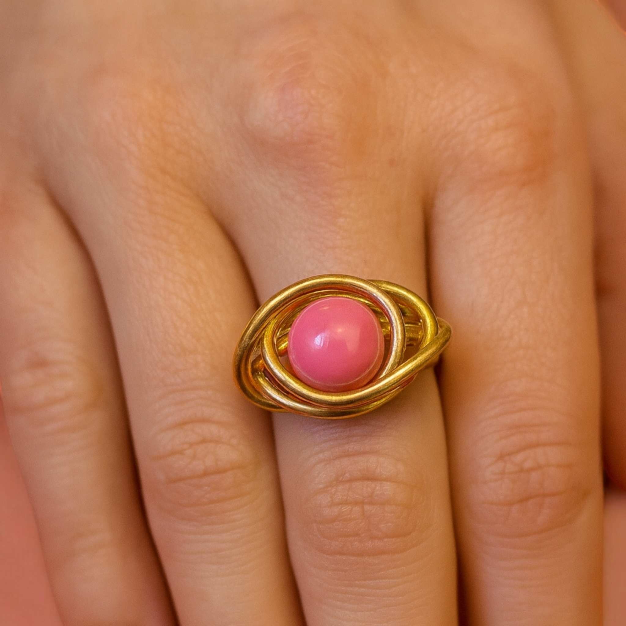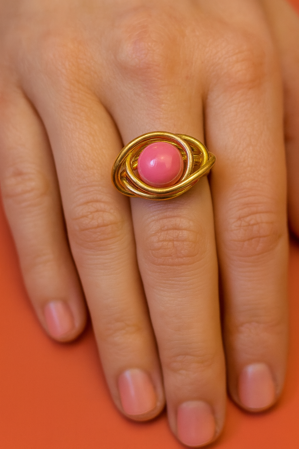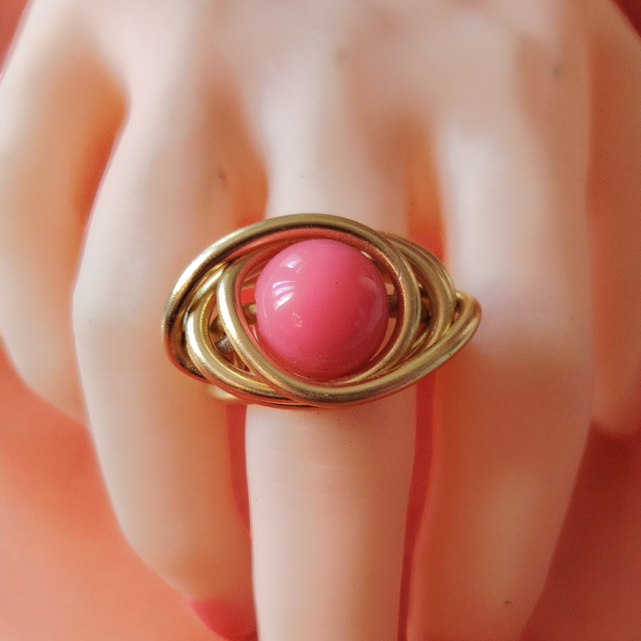 Façonnée à la main en fil d’aluminium doré de 2 mm, elle se distingue par ses courbes harmonieuses formant un motif en spirale délicatement enveloppant une perle acrylique rose, brillante et lumineuse.