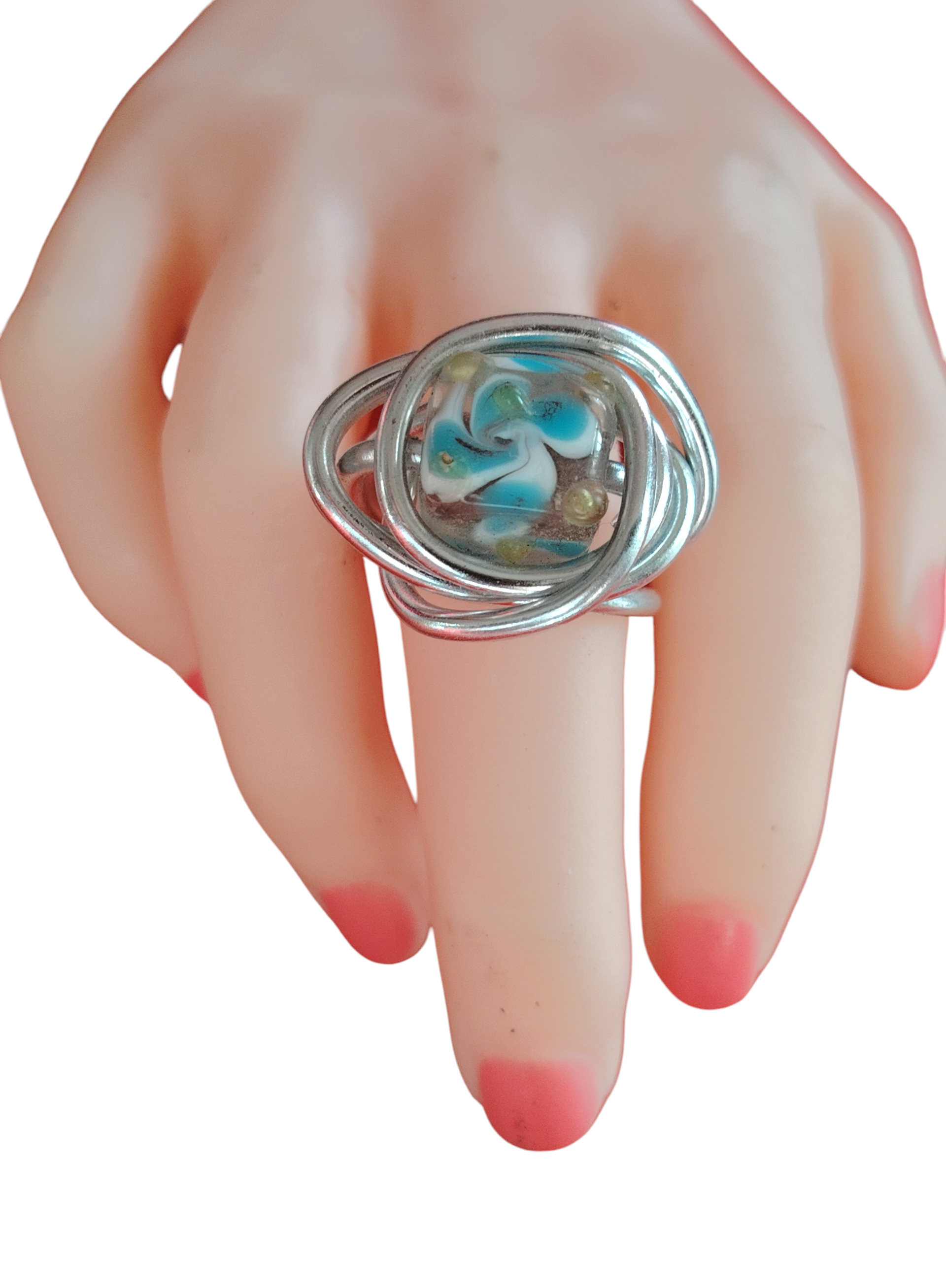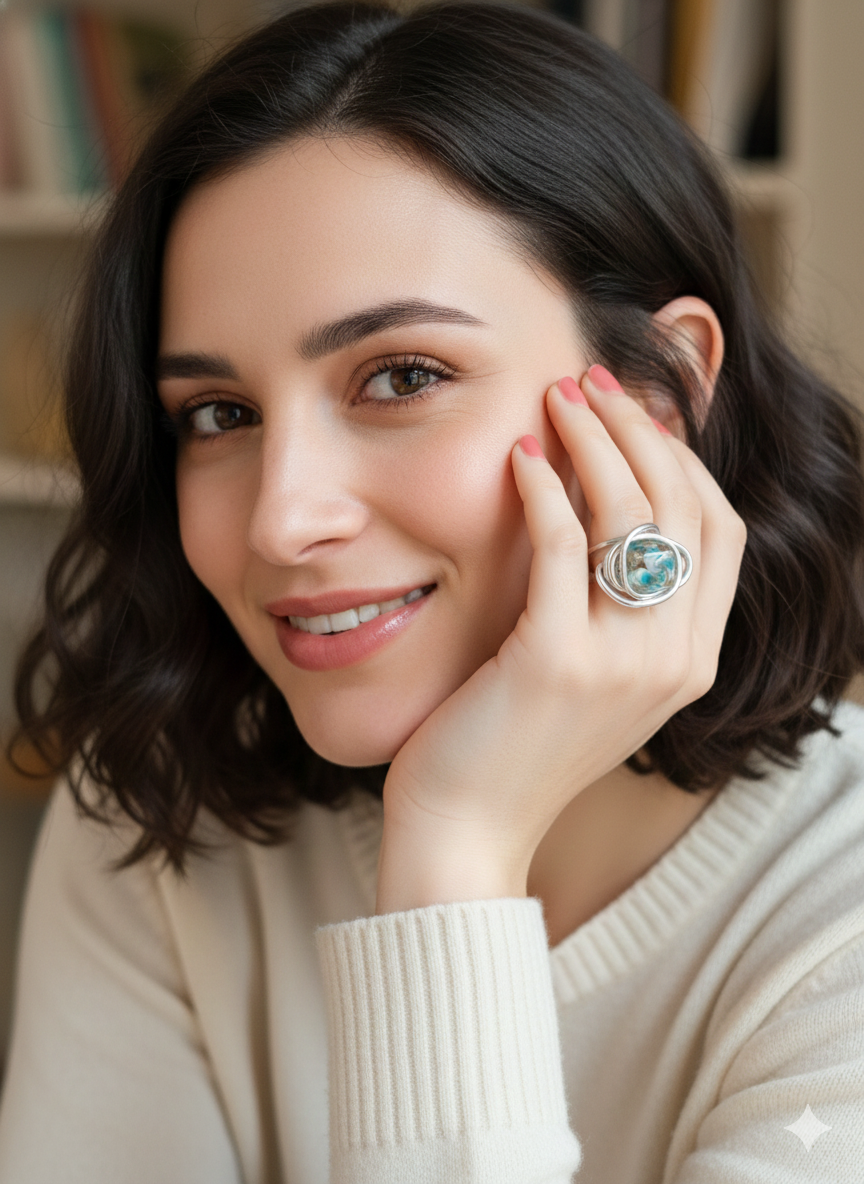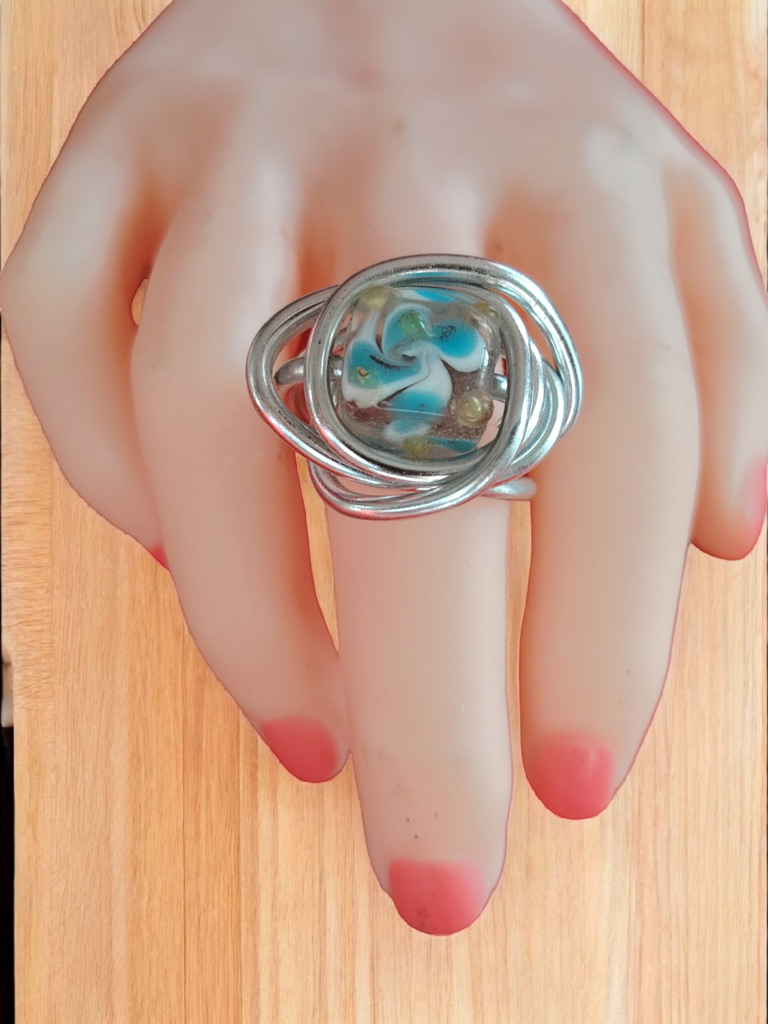 Design Sculptural : Le corps de la bague est entièrement réalisé par un travail minutieux de fil d’aluminium argenté de 2 mm. Les brins sont tressés, enroulés et sculptés en une forme organique et enveloppante, évoquant un cocon délicat ou une spirale infinie. Ce design ouvert permet à la bague d’épouser confortablement le doigt.