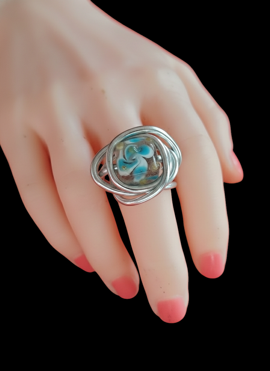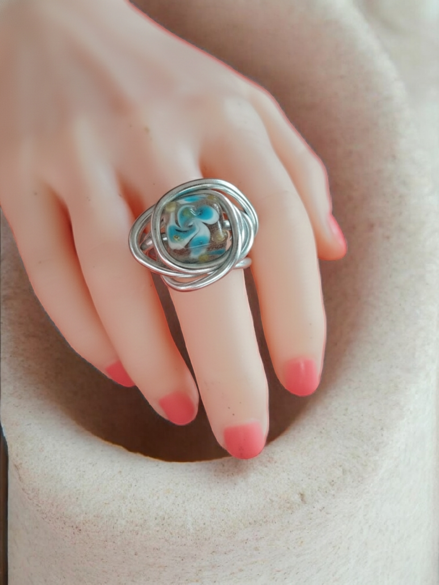 La Perle de Verre (Cœur de la Bague) : Au centre de cette structure filaire, repose une perle de verre aux nuances multiples. La perle semble flotter dans son écrin d’argent, offrant un jeu de transparence et de reflets qui rappelle les profondeurs de l’océan ou l’éclat lointain d’une planète. Chaque perle est unique, garantissant que votre bague ne ressemble à aucune autre.