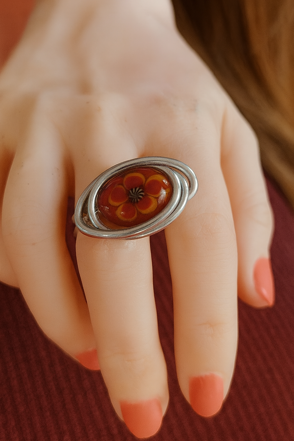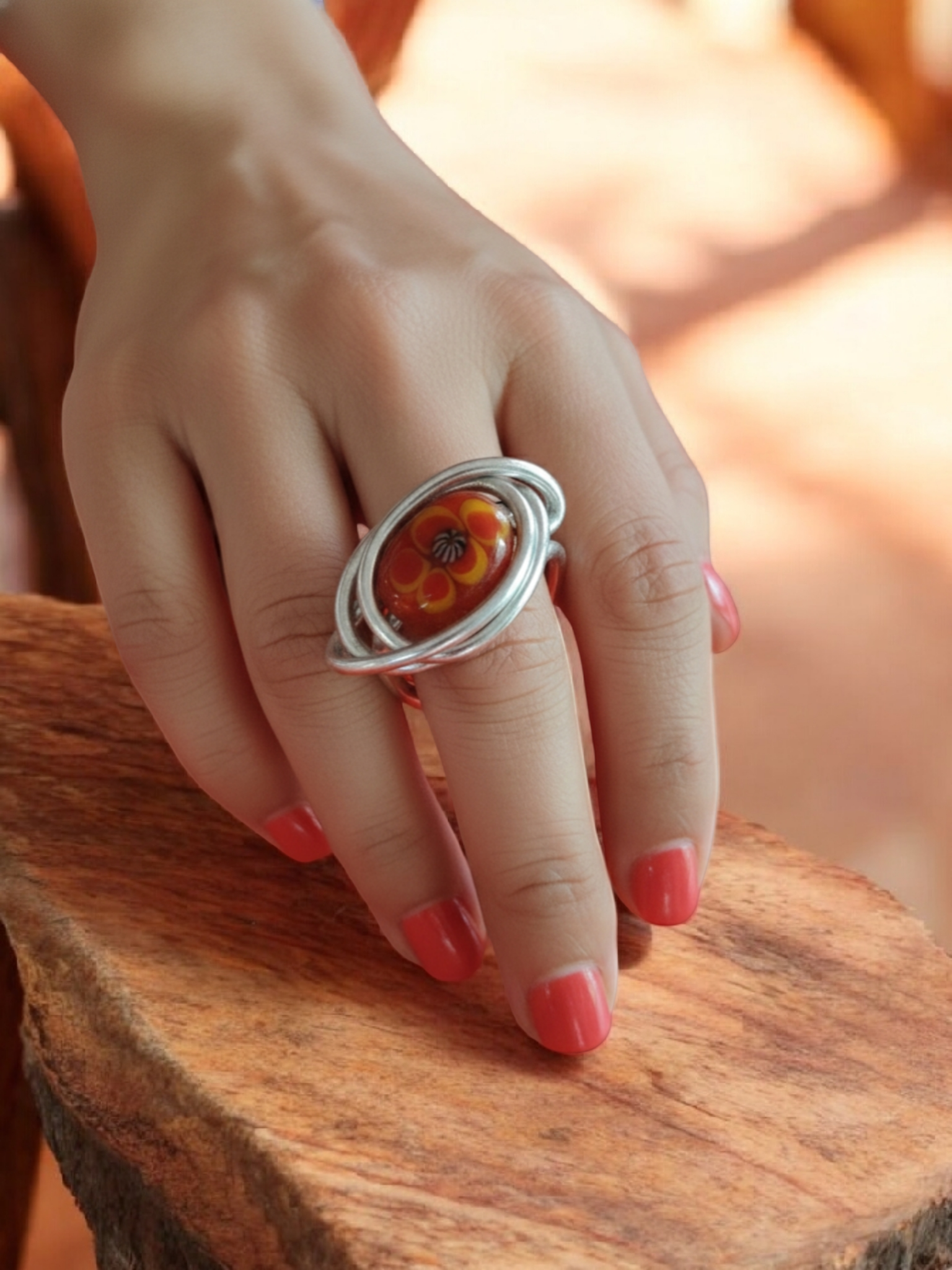 Sublime et élégante, la bague Éclat Argenté est entièrement façonnée à la main en fil d’aluminium argenté de 2 mm, un matériau à la fois léger, résistant et durable. Son design délicatement enroulé met en valeur une perle en verre soigneusement intégrée au centre, offrant un jeu de lumière subtil et raffiné à chaque mouvement.