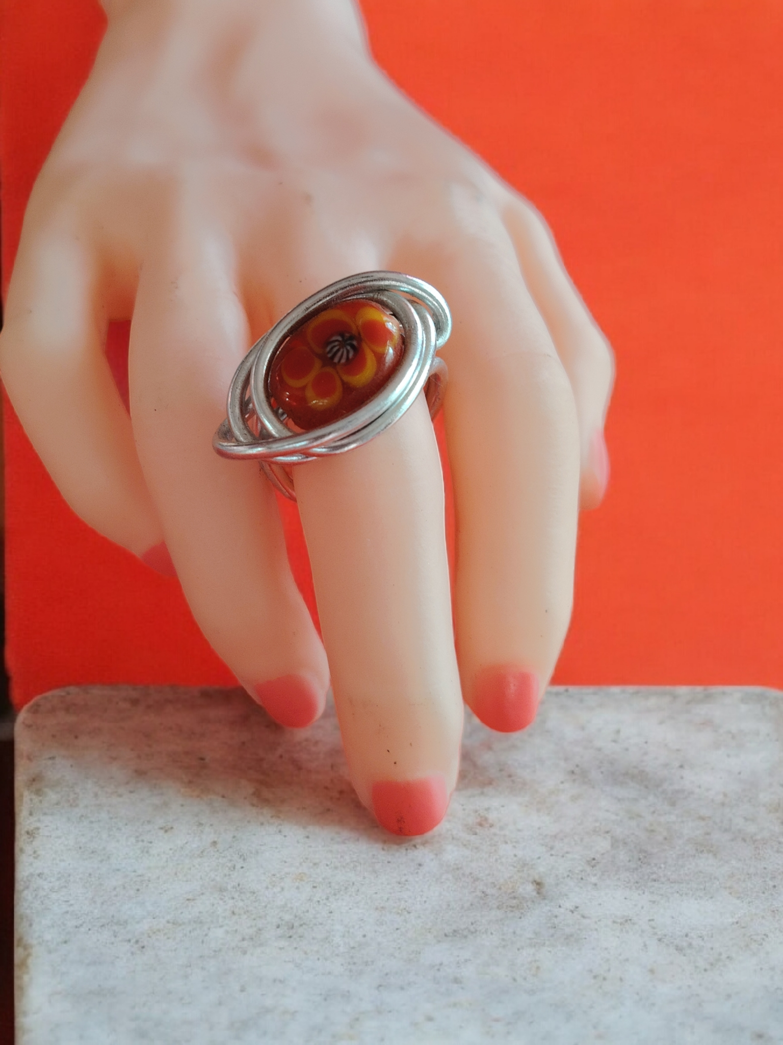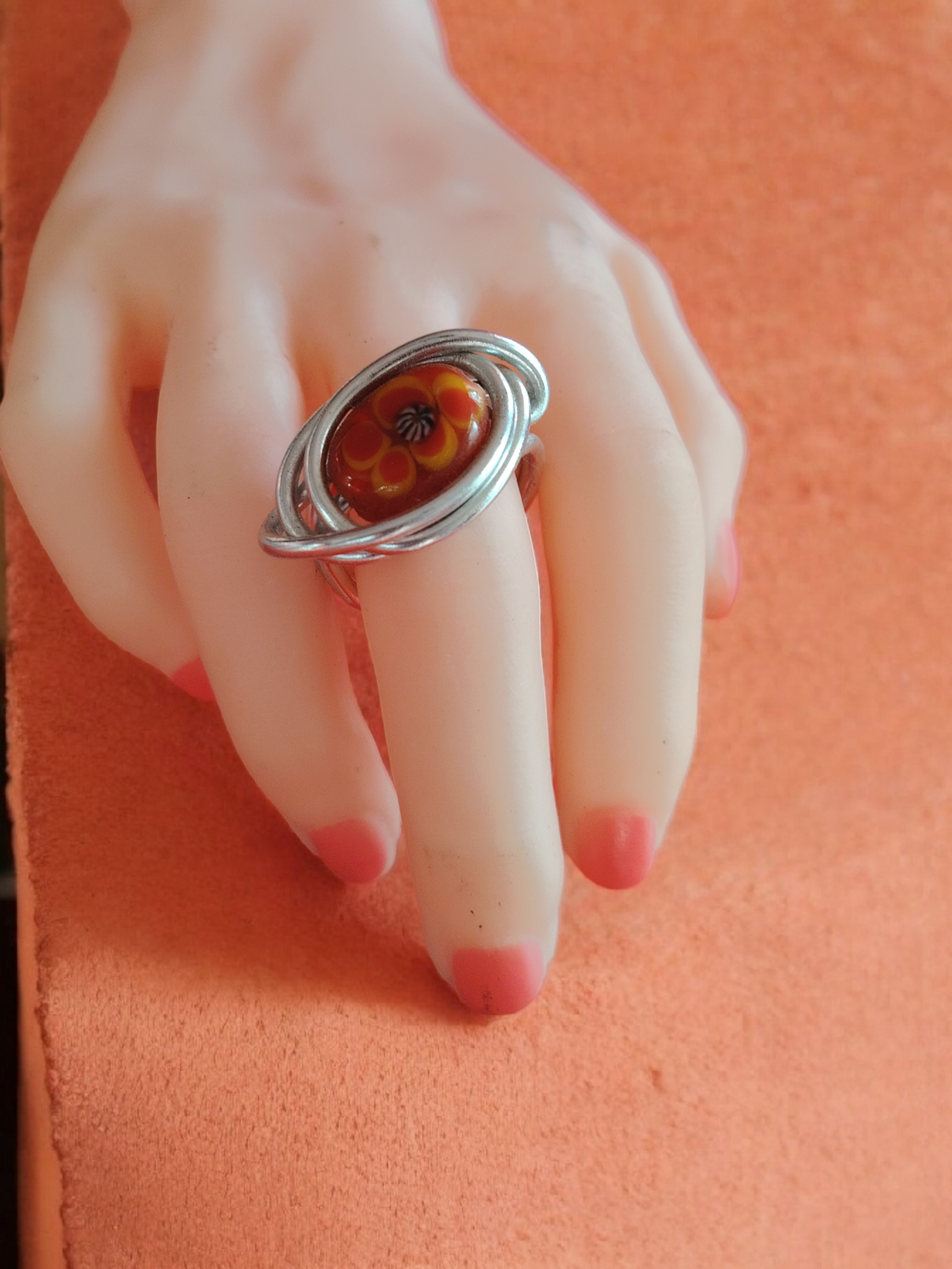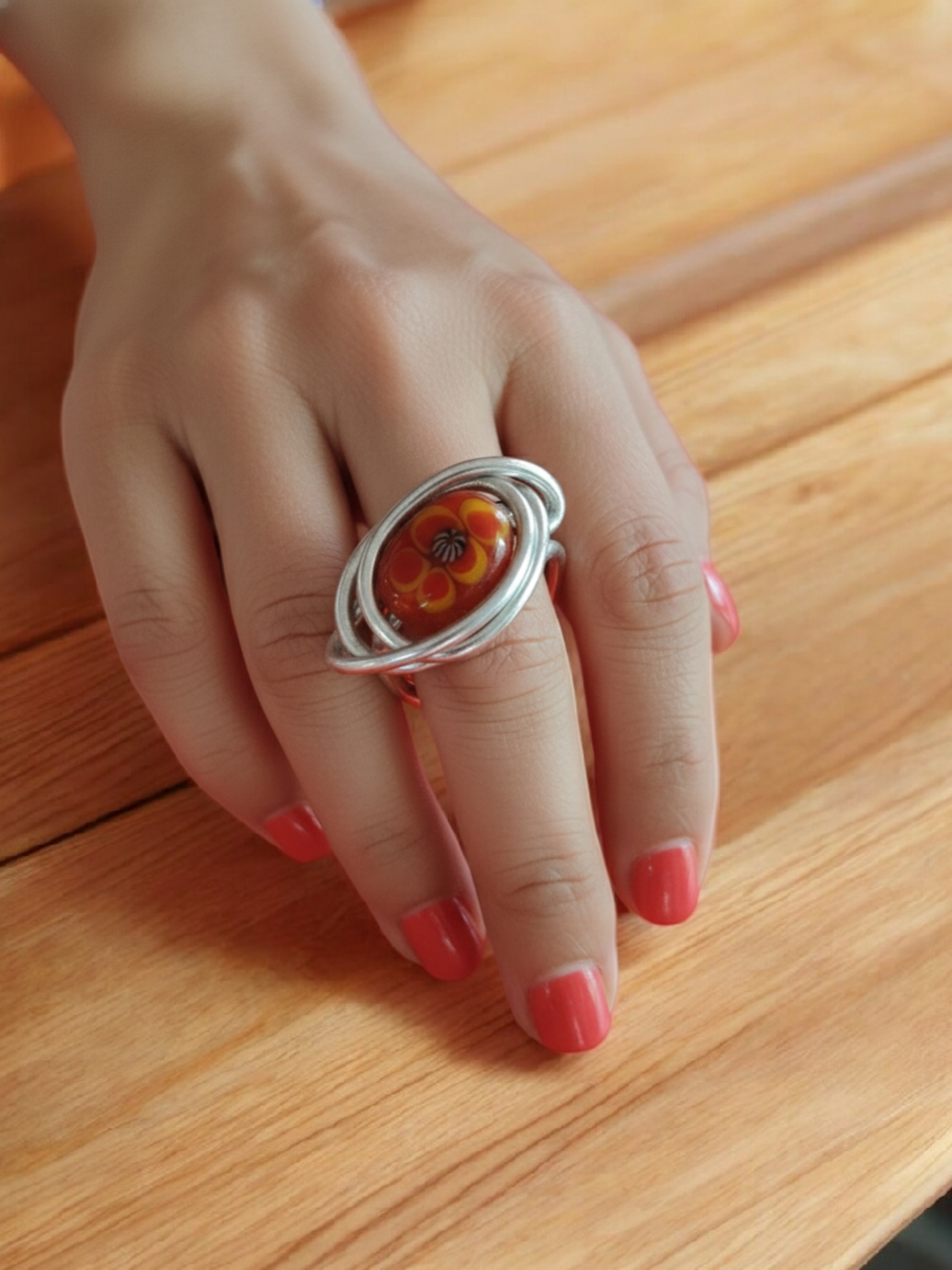 Bague artisanale en fil d’aluminium argenté avec perle en verre, élégante et légère pour un style raffiné au quotidien.
