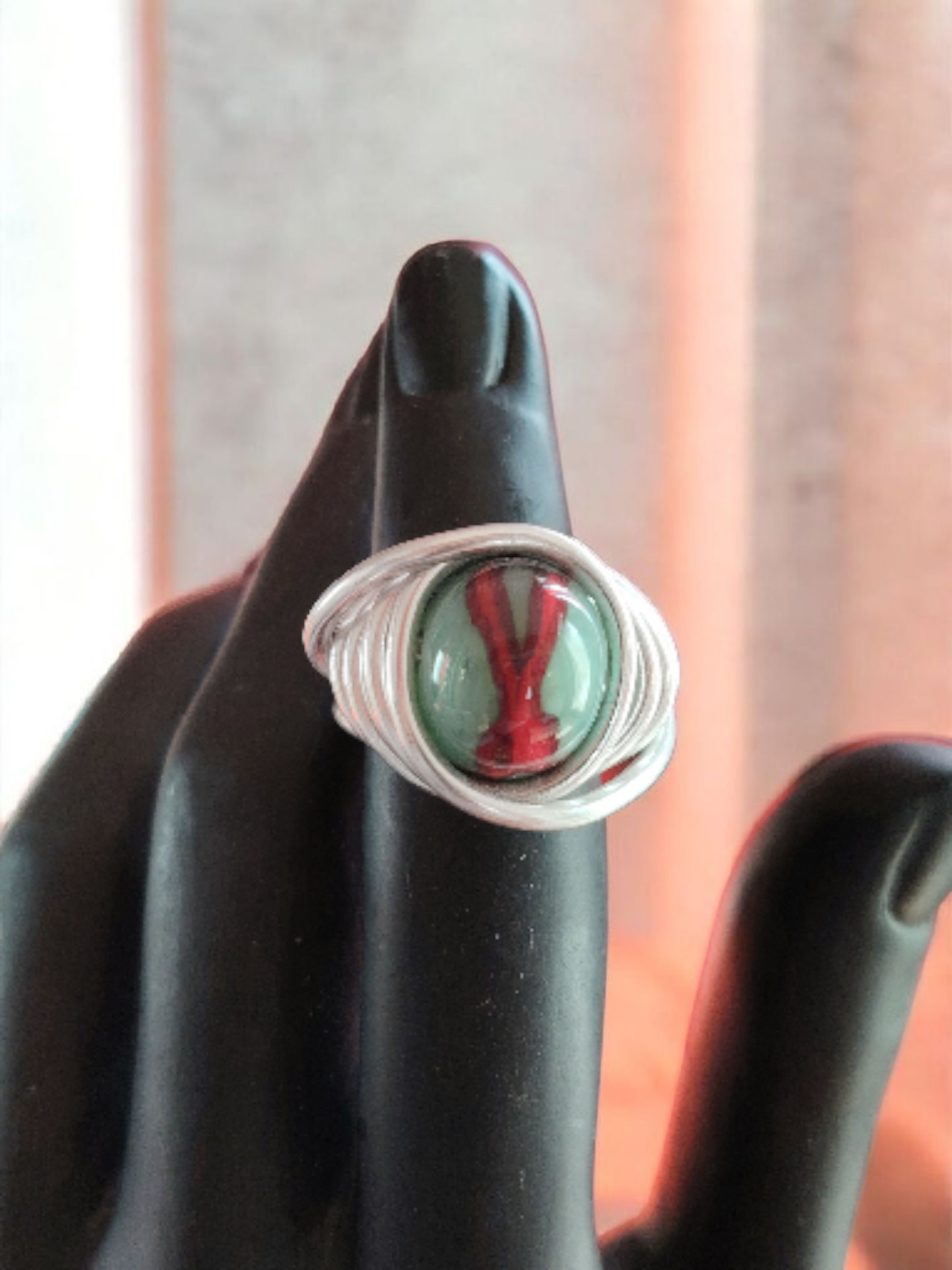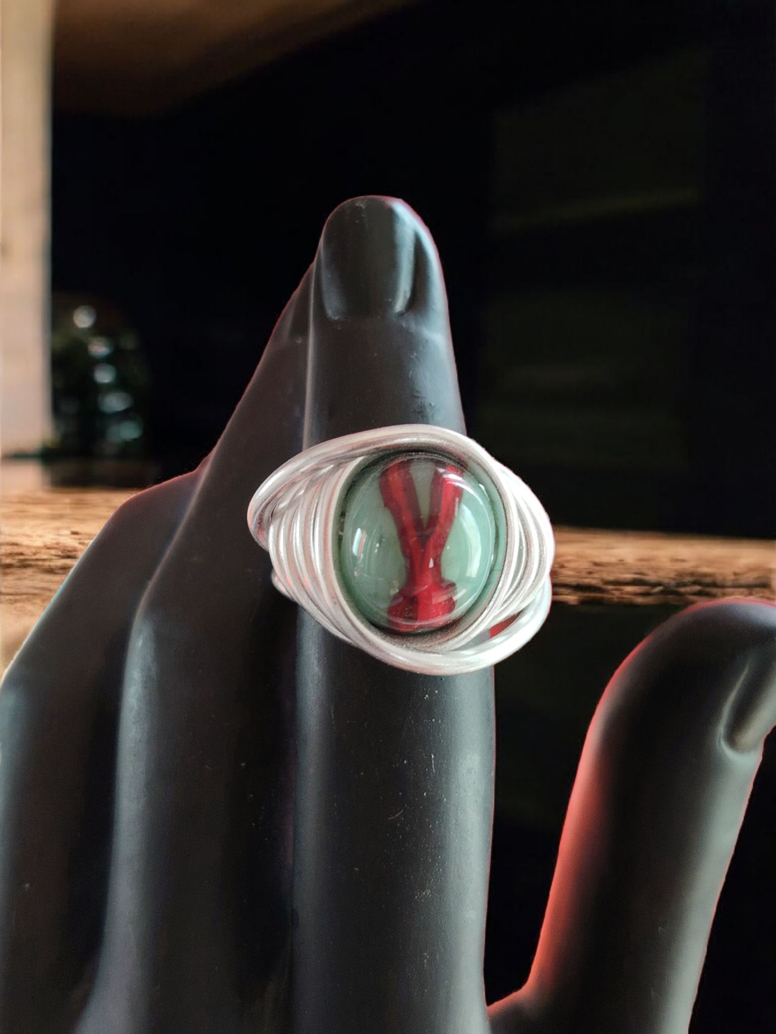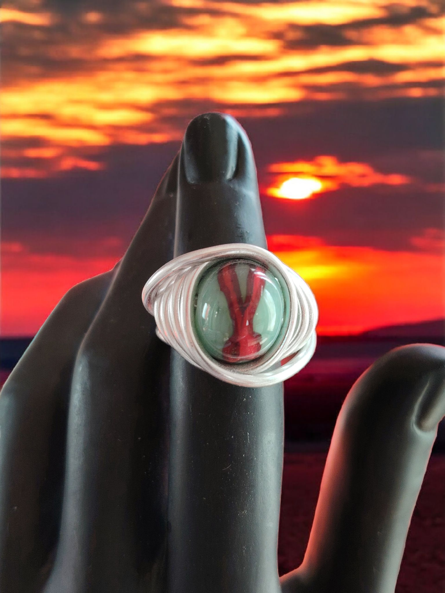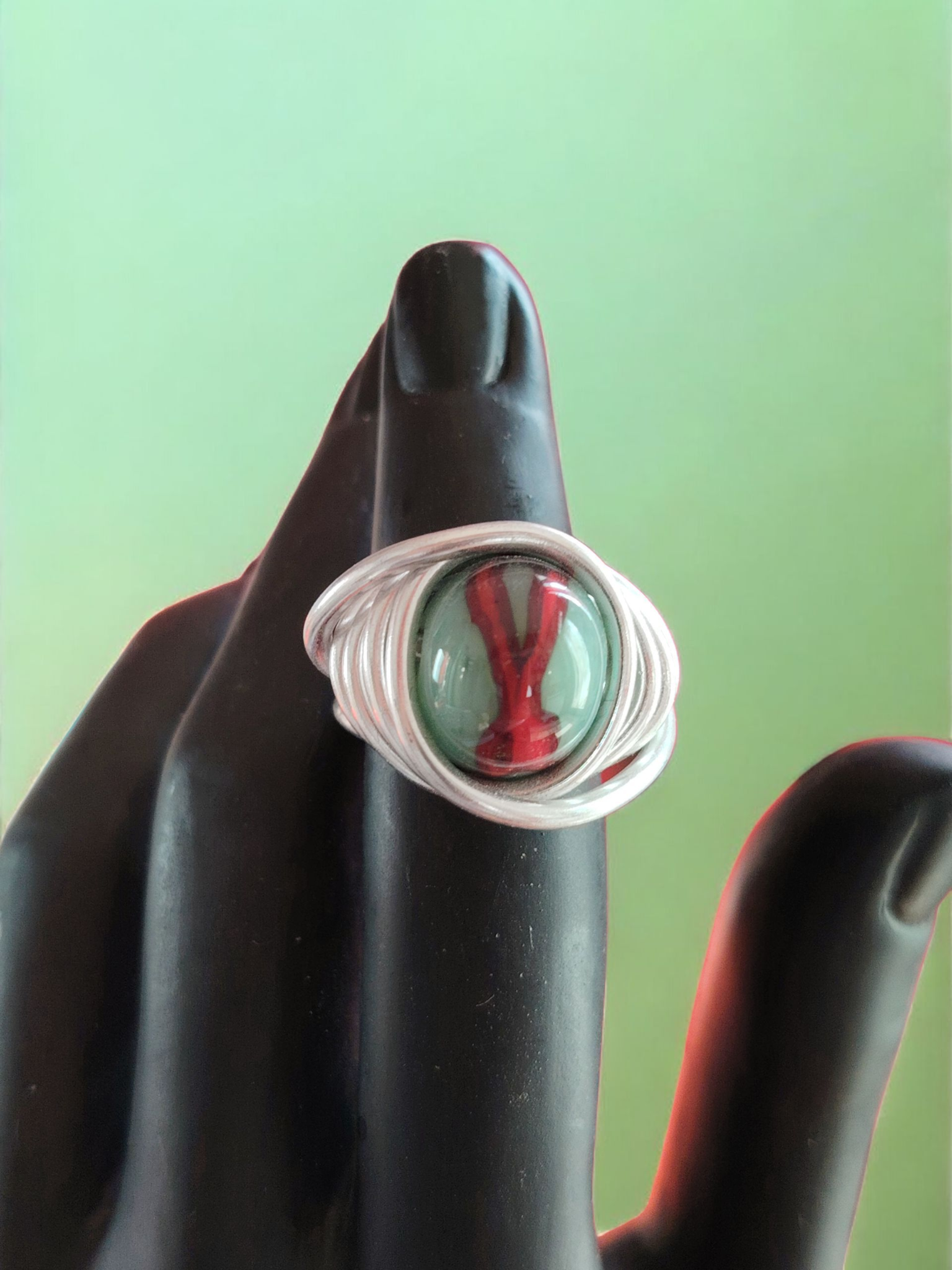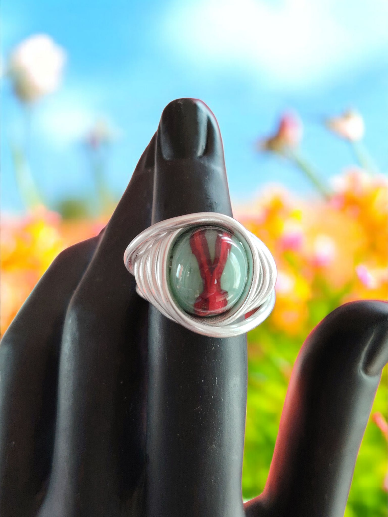 Façonnée à la main en fil d’aluminium argenté de 2 mm, elle présente des courbes harmonieuses qui enveloppent délicatement une perle en verre artisanale. Cette perle, aux reflets vert d’eau traversés d’un éclat rouge profond, apporte une touche vibrante et élégante à cette création singulière.