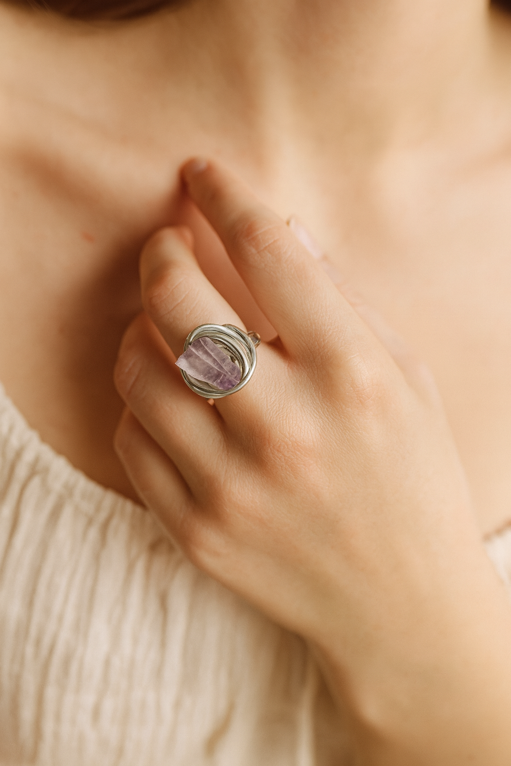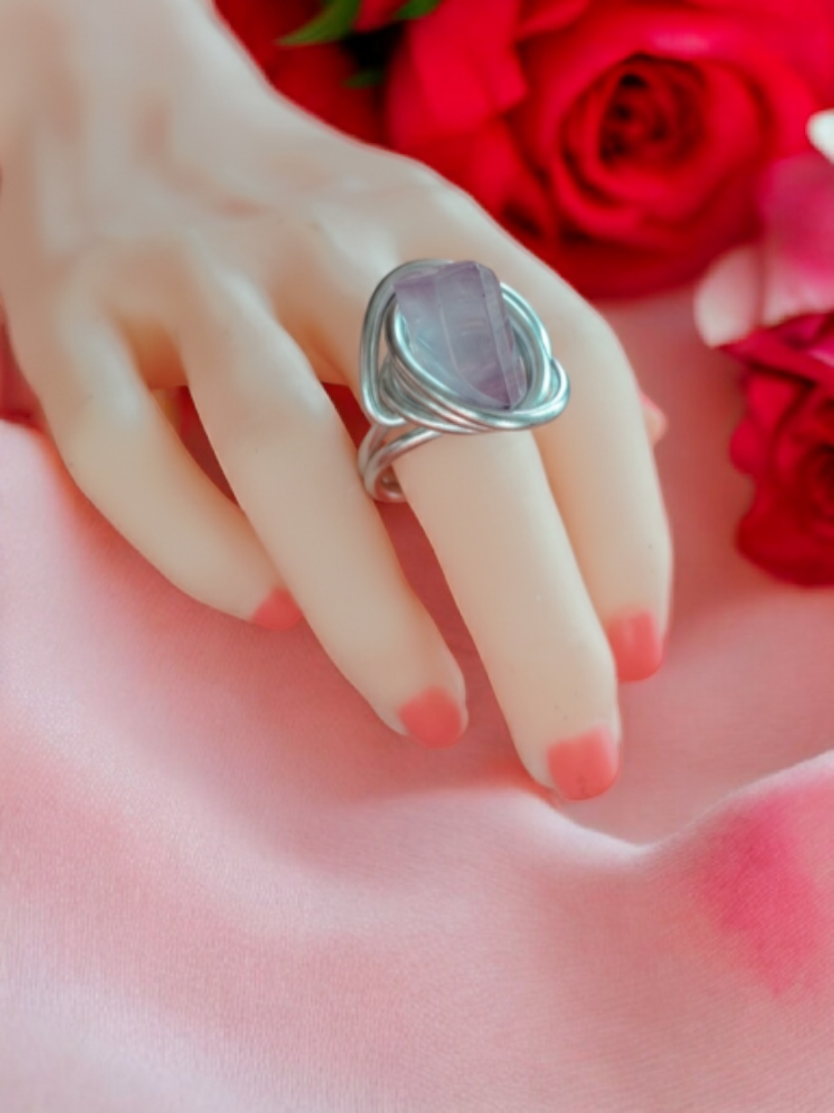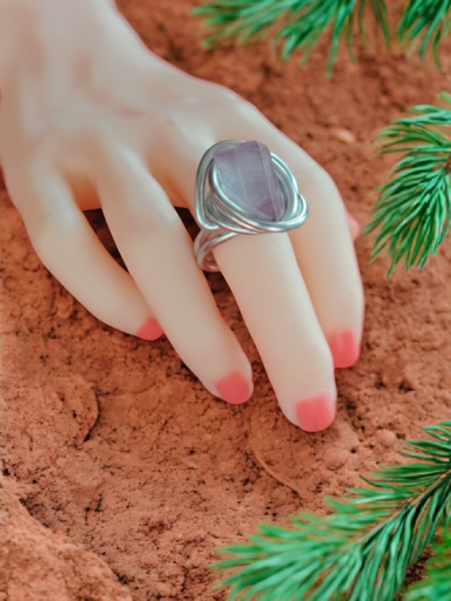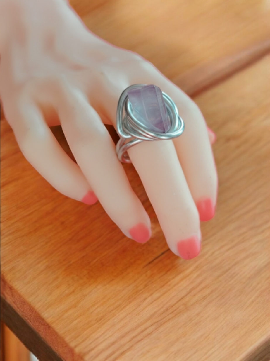La bague Éclat Lunaire séduit par son design contemporain et aérien. Réalisée à la main en fil d’aluminium argenté de 2 mm, elle offre une structure délicatement enroulée qui met en valeur une perle acrylique lumineuse, au rendu doux et élégant.