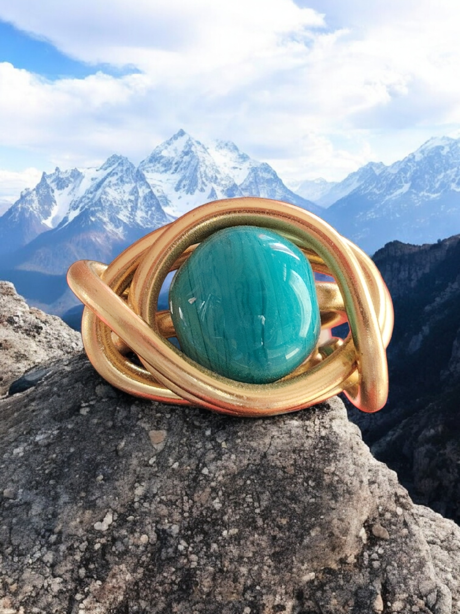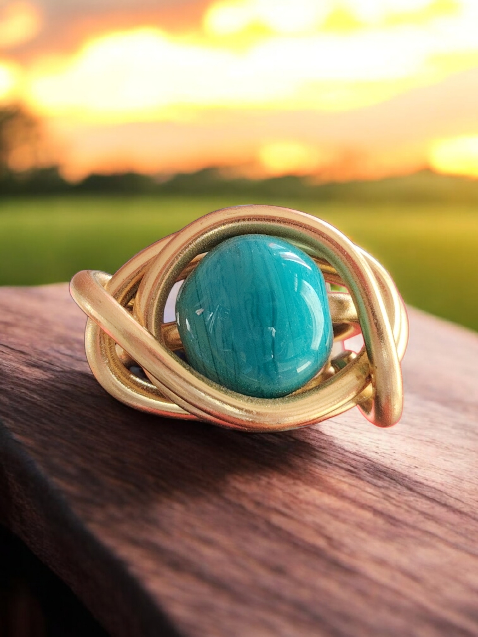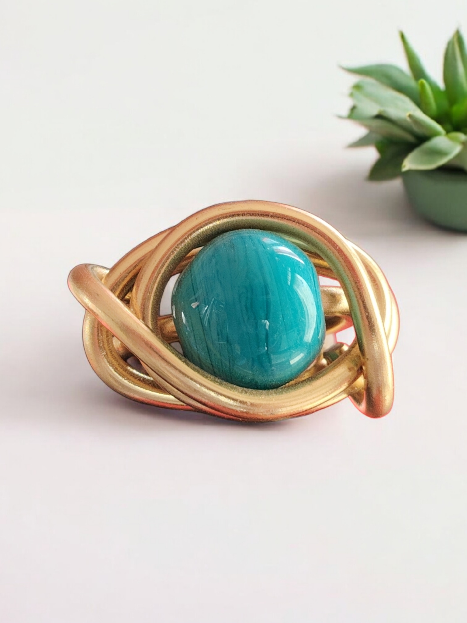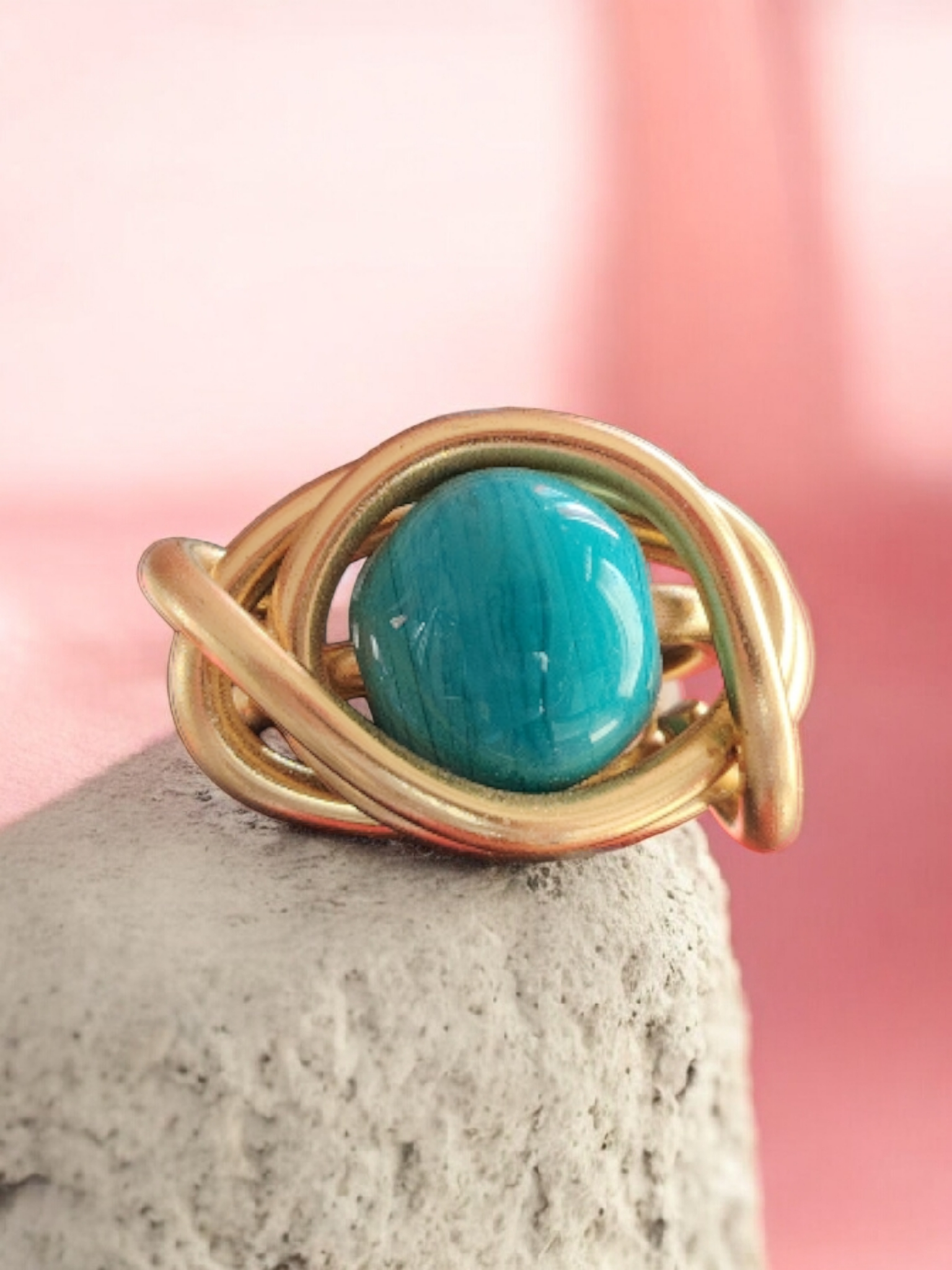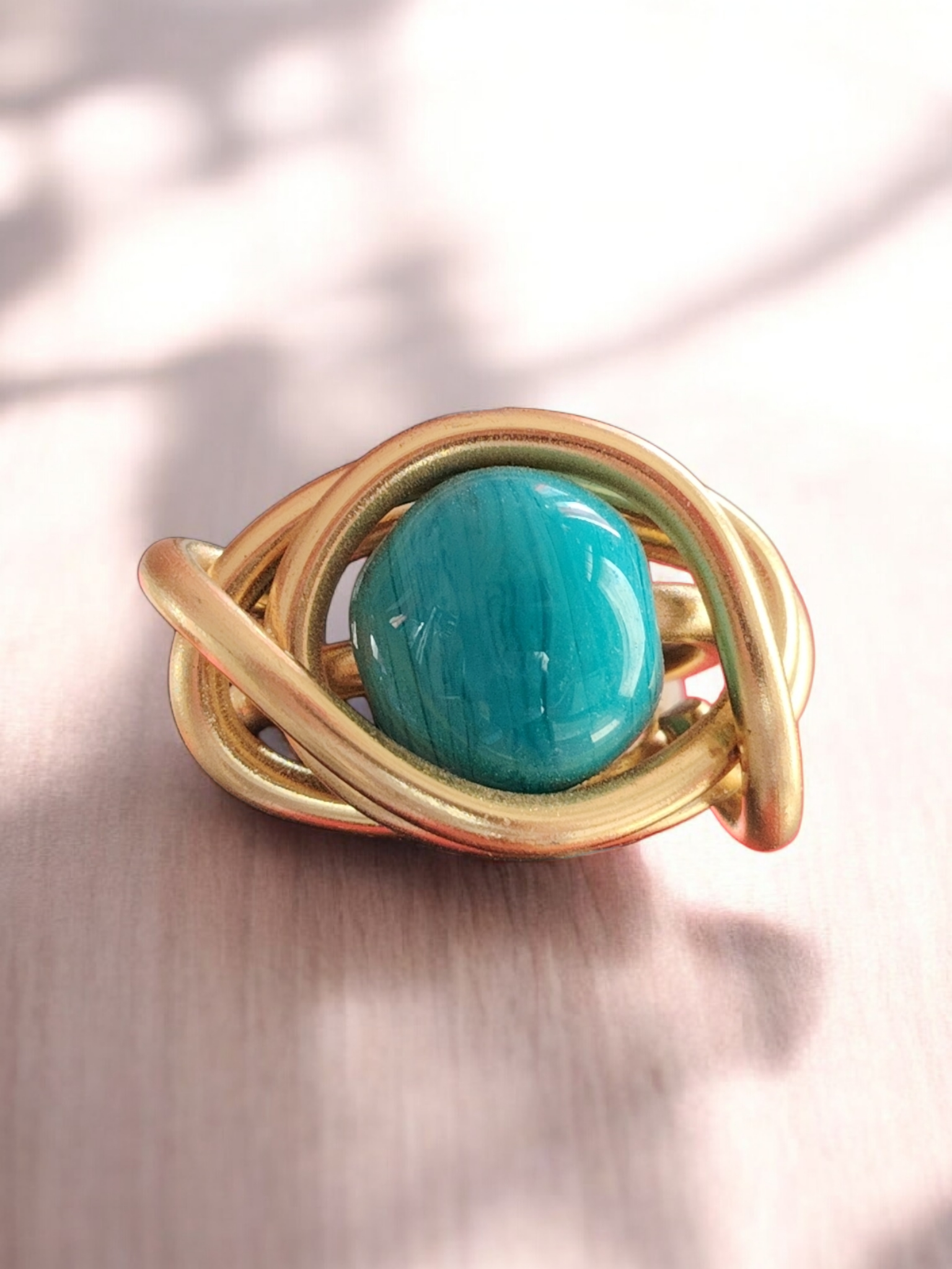 Laissez-vous séduire par la Bague Éclat Turquoise, une pièce unique façonnée à la main dans un fil d’aluminium doré de 3 mm. Son design sculptural, formé de courbes harmonieuses et entrelacées, met en valeur une superbe perle en verre artisanale, entièrement réalisée à la main.