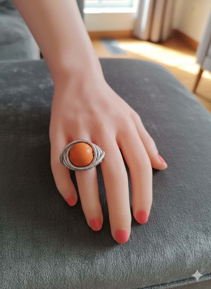 Bague artisanale en fil d’aluminium argenté texturé de 2 mm, ornée d’une perle en bois naturel. Une création légère et élégante, alliant modernité et authenticité.