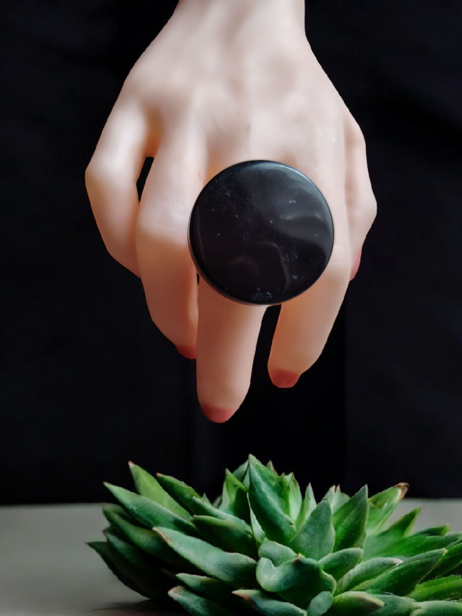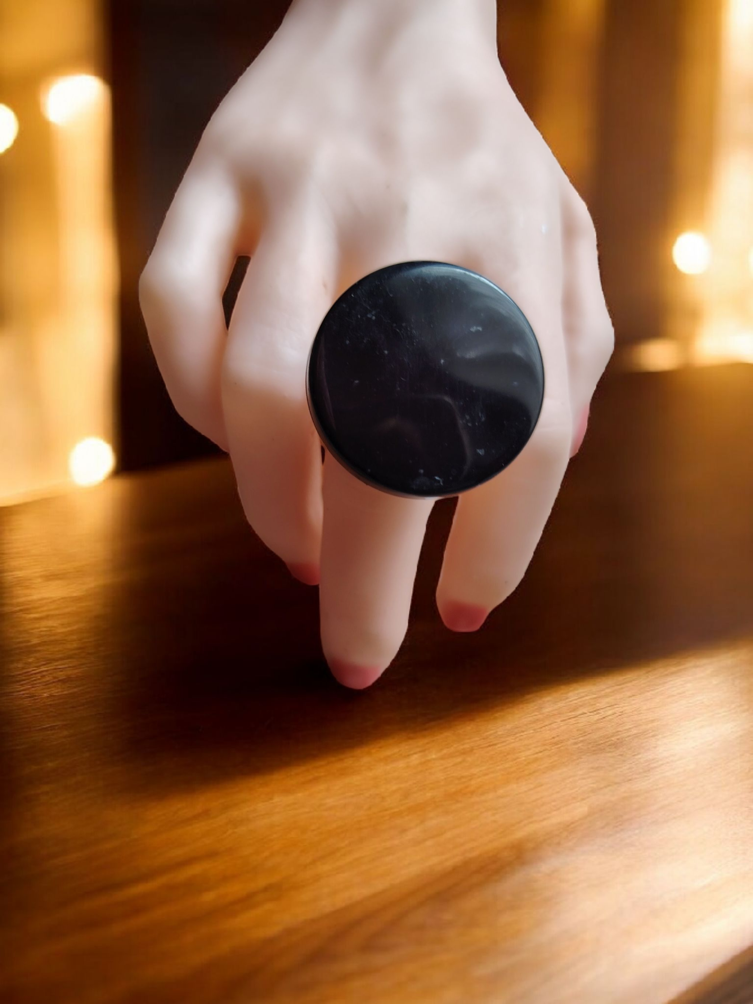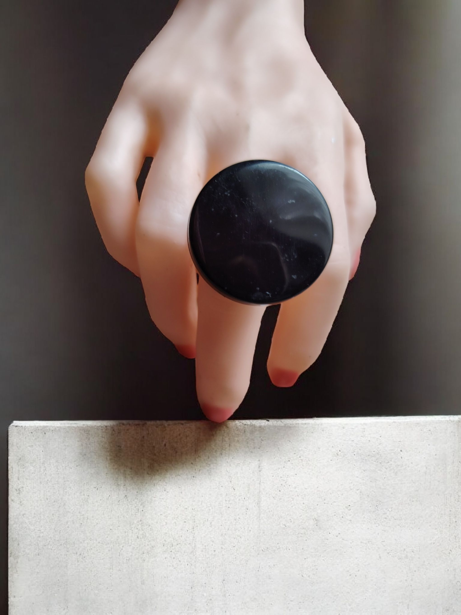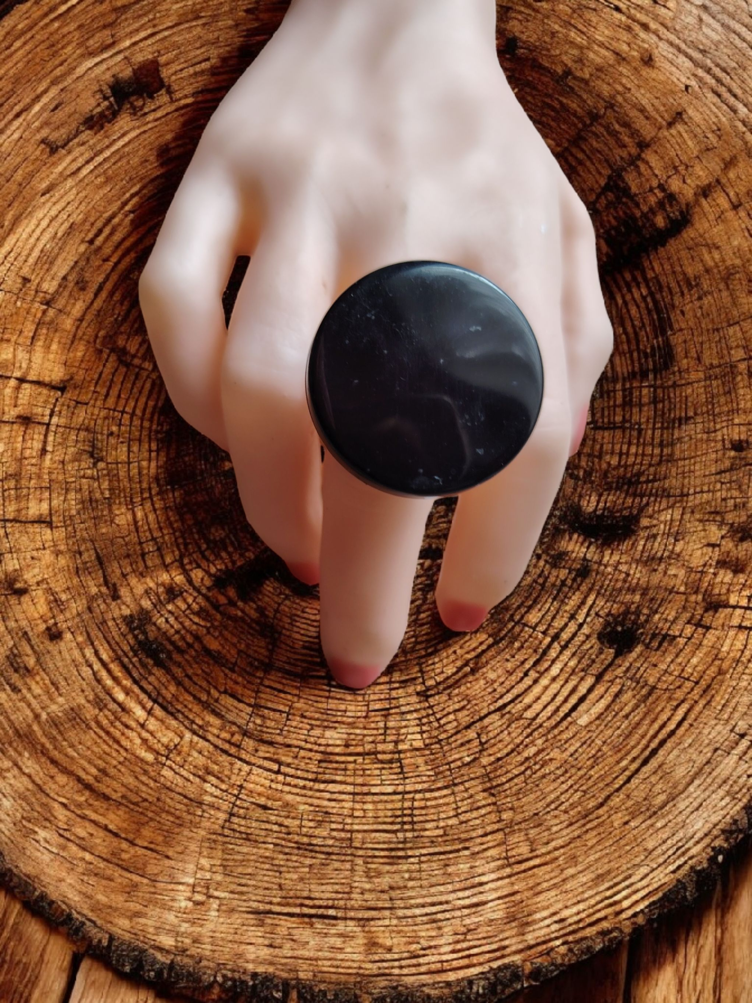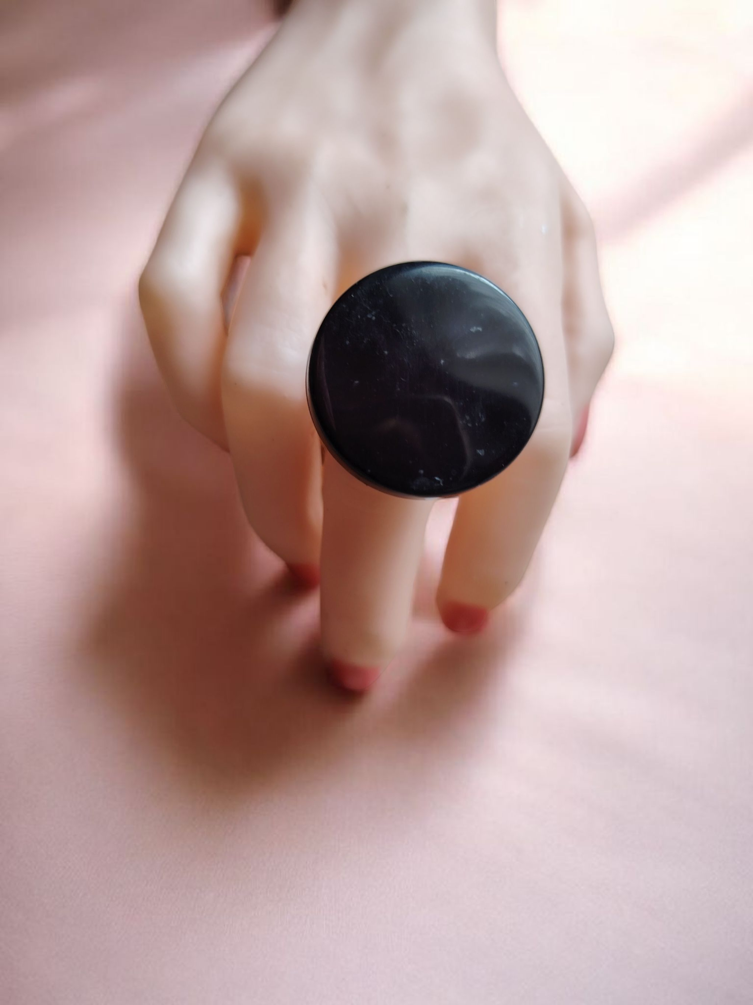 Succombez au charme graphique de la bague Noir Éclat, un bijou unique qui mêle modernité et élégance minimaliste. Son large bouton noir, brillant et parfaitement lisse, attire immédiatement le regard et crée un contraste raffiné avec son anneau en fil d’aluminium argenté de 2 mm, façonné à la main.