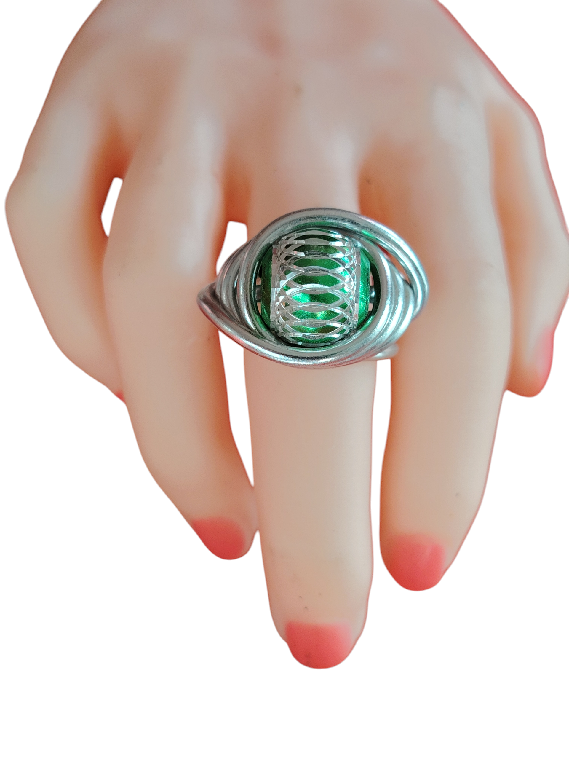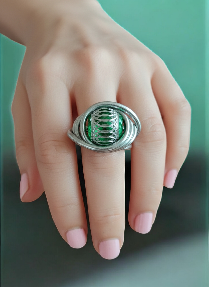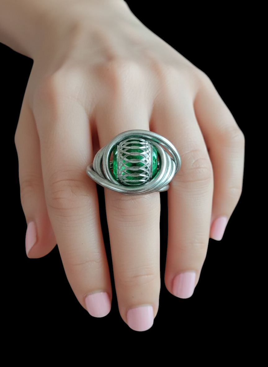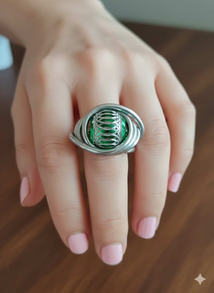Laissez-vous captiver par l’originalité de la bague « Orbite Verte », une pièce unique où l’artisanat rencontre le design contemporain. Entièrement façonnée à la main, cette bague est une véritable sculpture miniature, conçue pour celles et ceux qui osent l’élégance non conventionnelle.