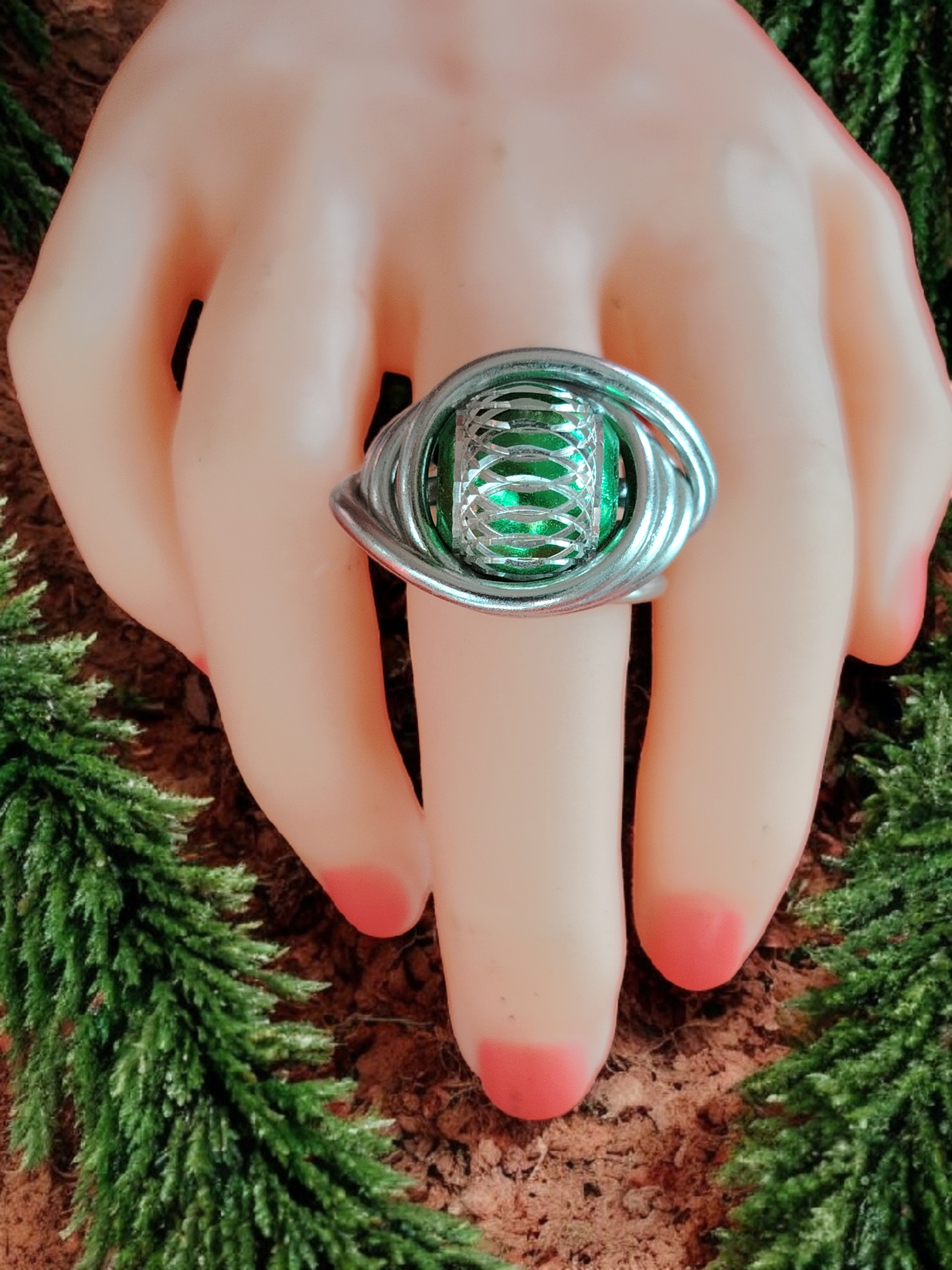 La Perle Centrale : Au cœur de cette construction, une magnifique perle en aluminium laquée verte est fermement maintenue par les volutes de fil. Son maillage intérieur apporte une texture intrigante et réfléchit la lumière, faisant ressortir son vert éclatant.