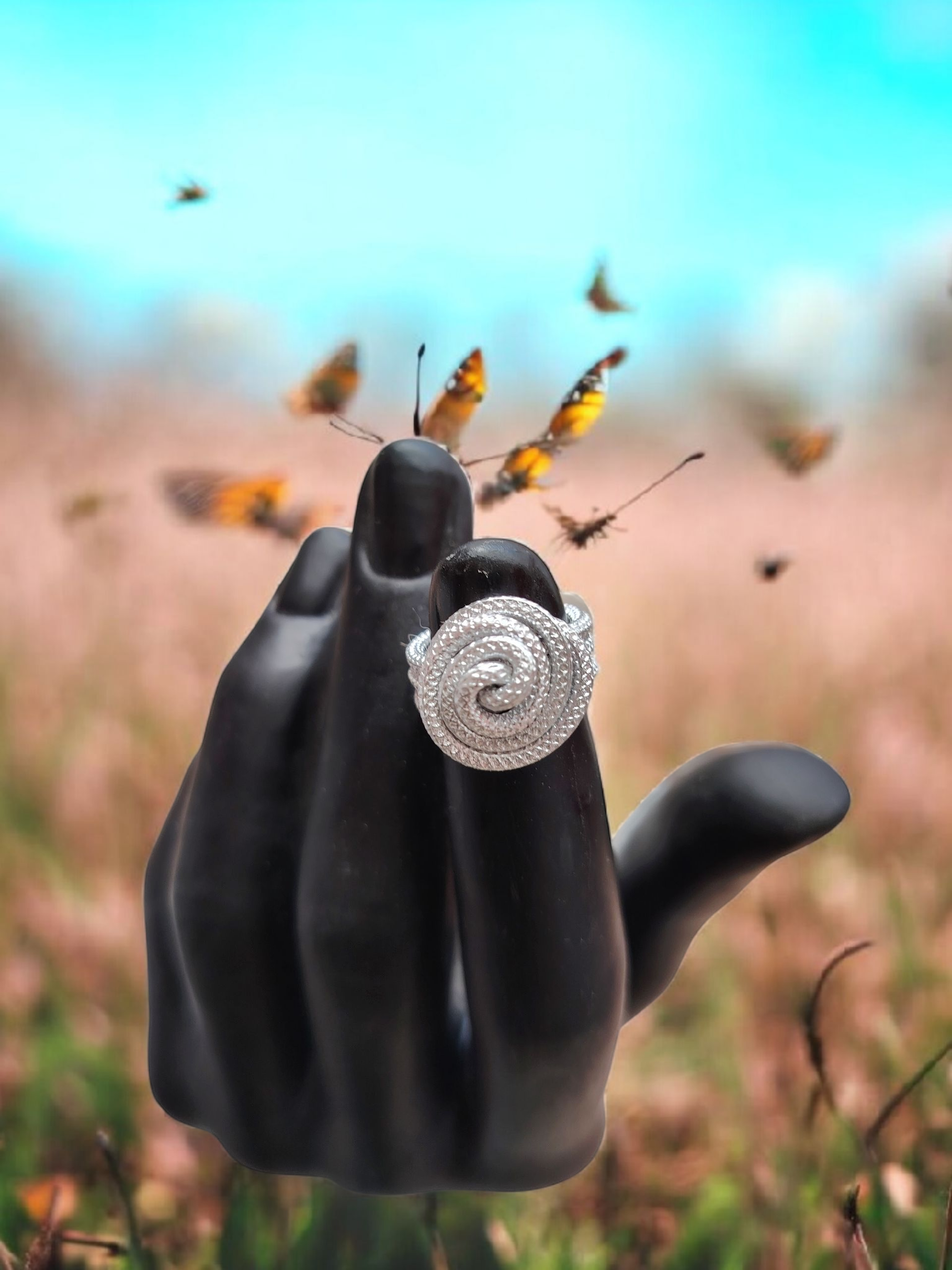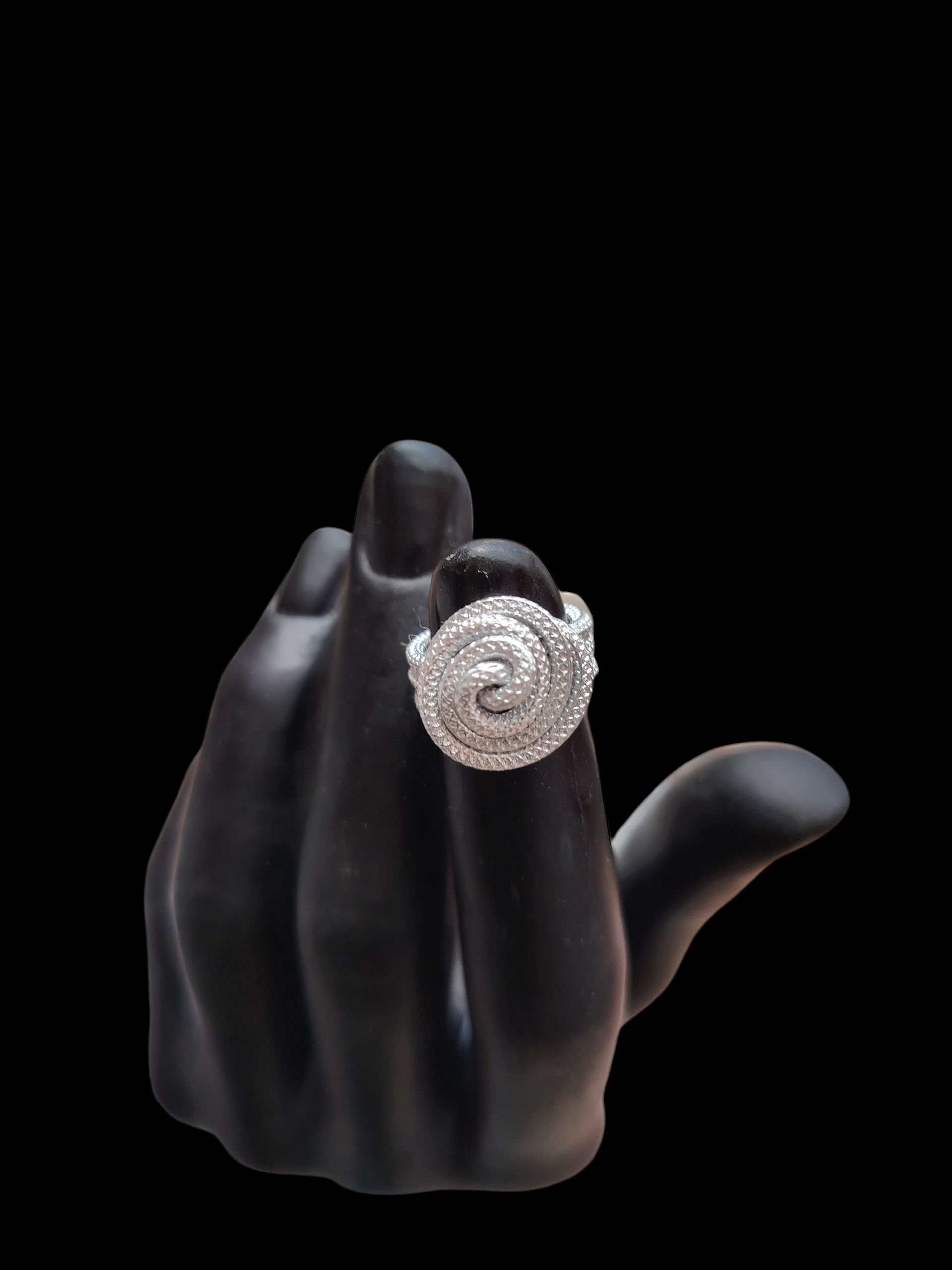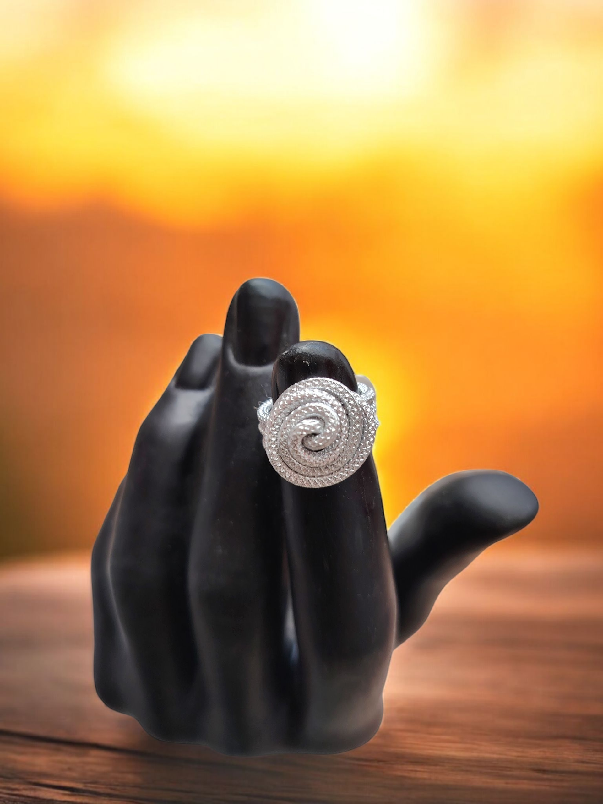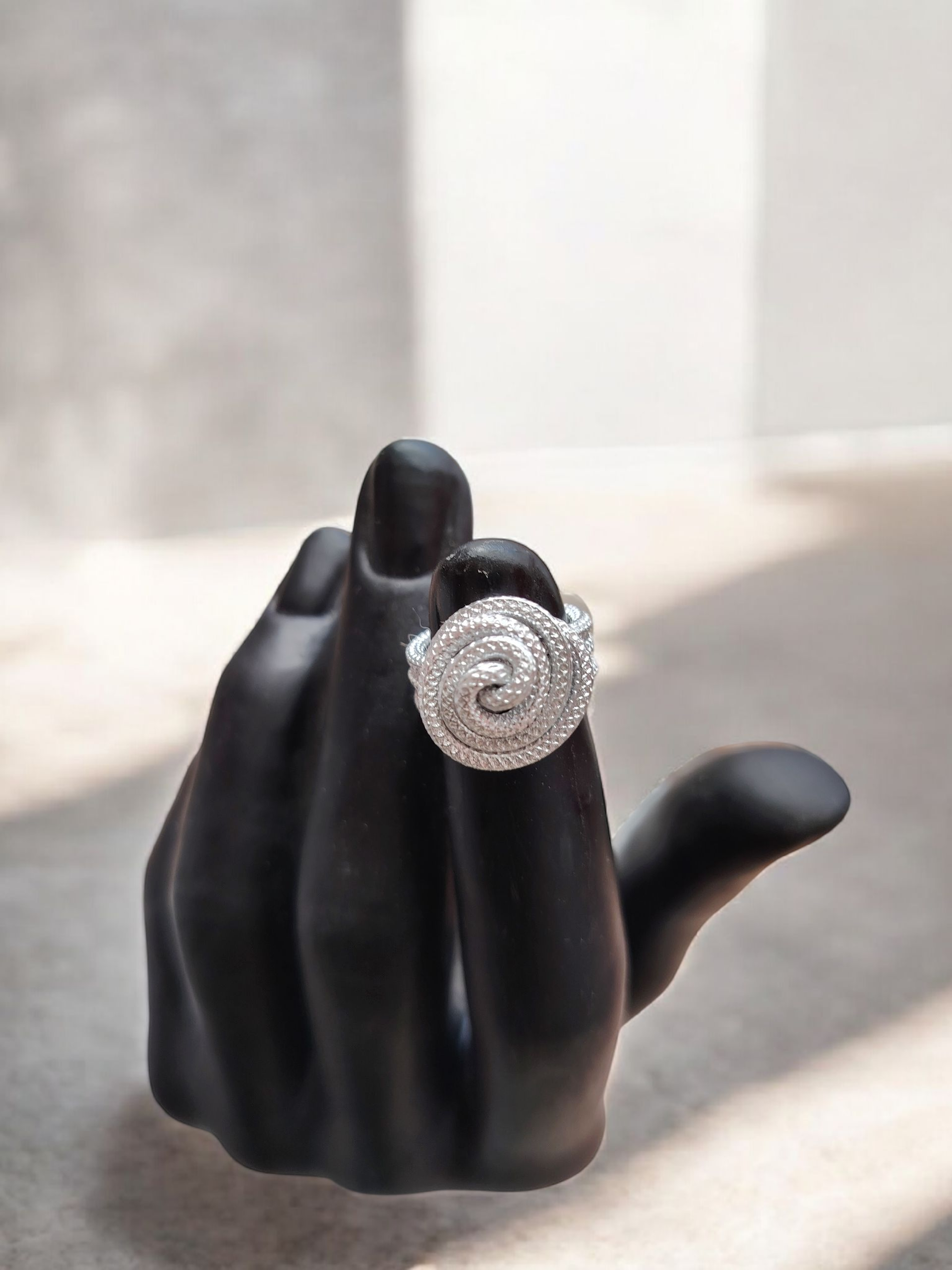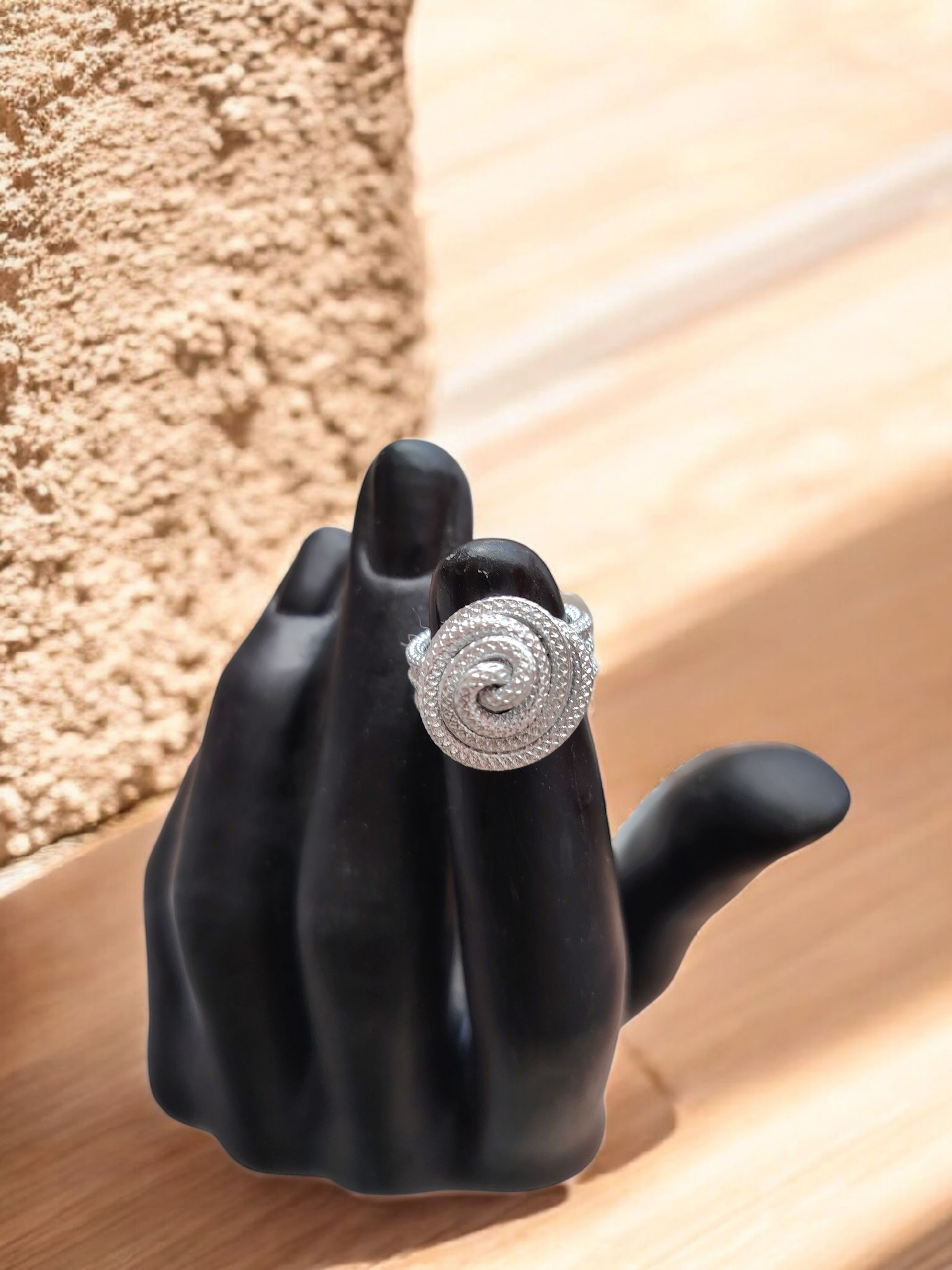 Cette bague se distingue par son design sculptural, qui évoque à la fois la fluidité et l’harmonie. Sa forme en spirale symbolise l’infini, l’énergie positive et le renouveau — un bijou chargé de sens, idéal à porter au quotidien ou pour accompagner une tenue plus sophistiquée.