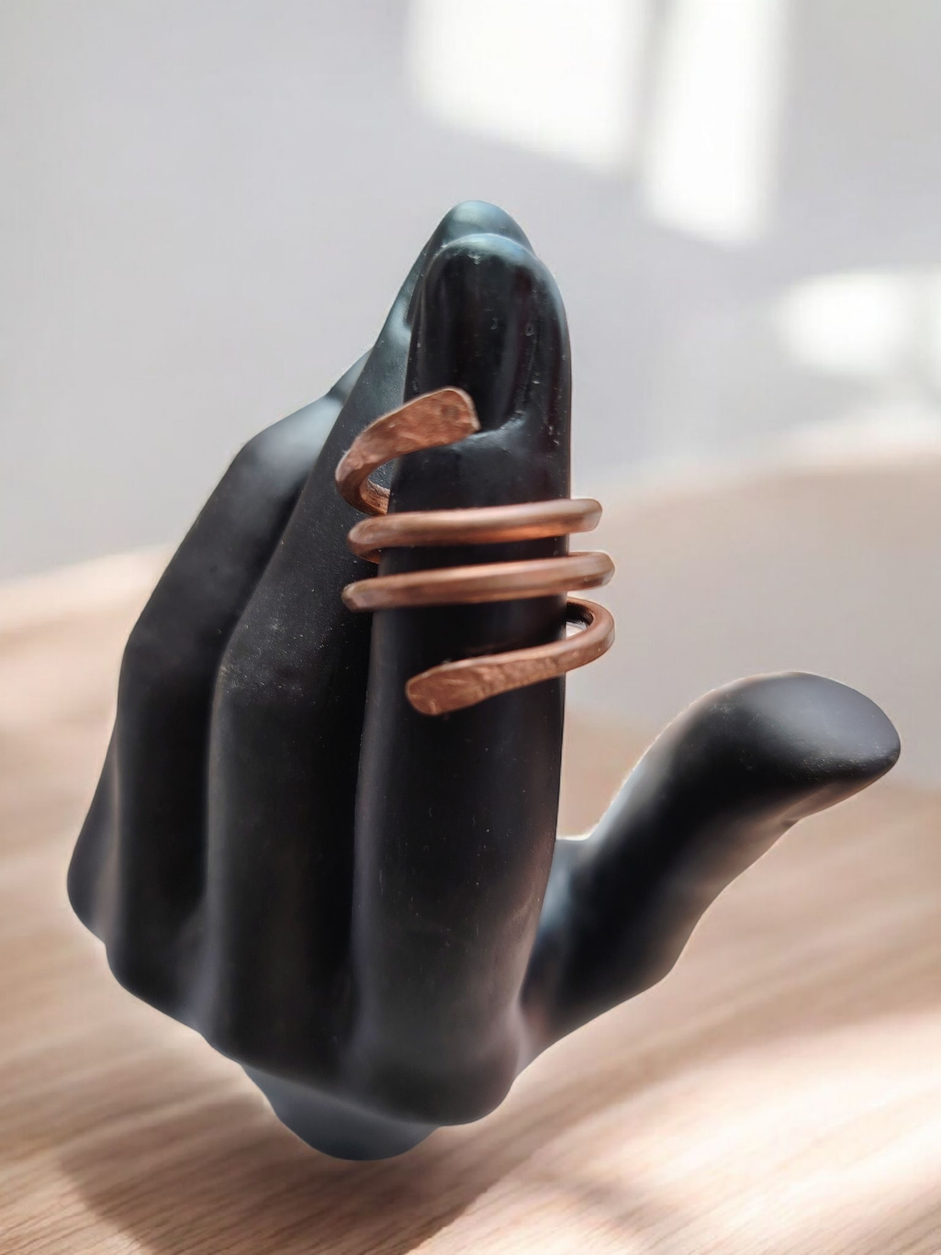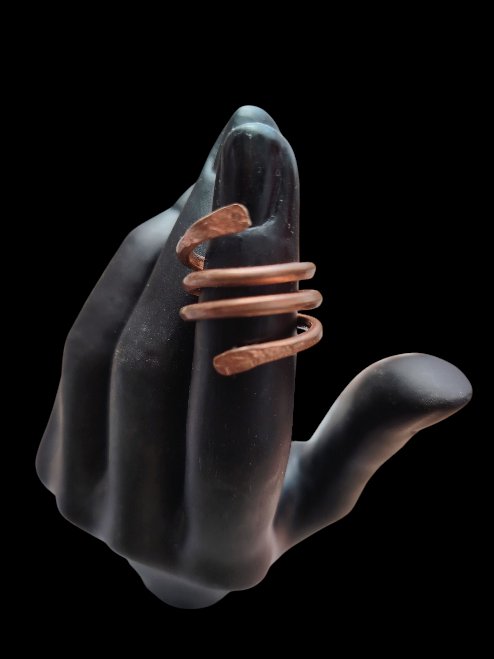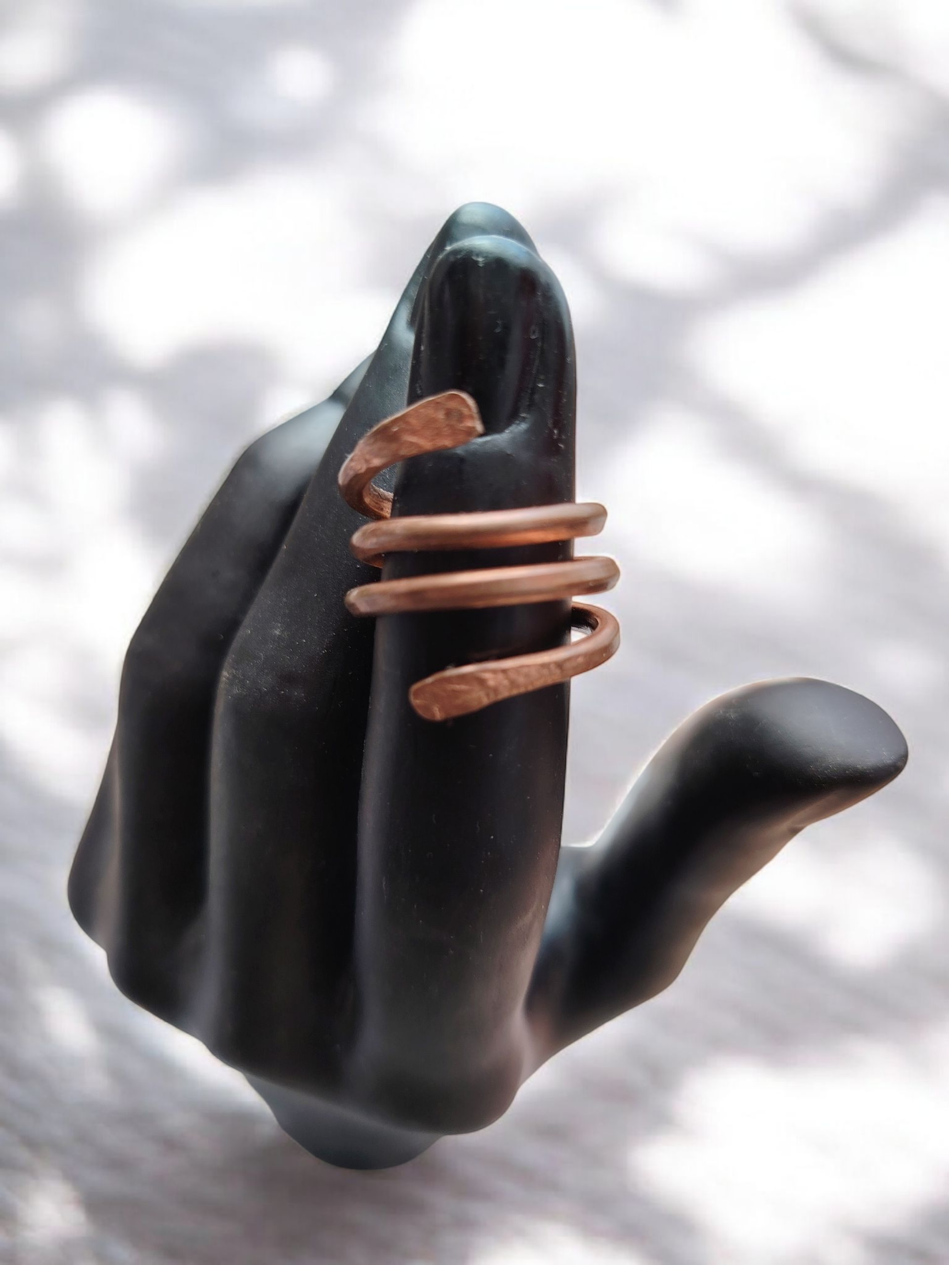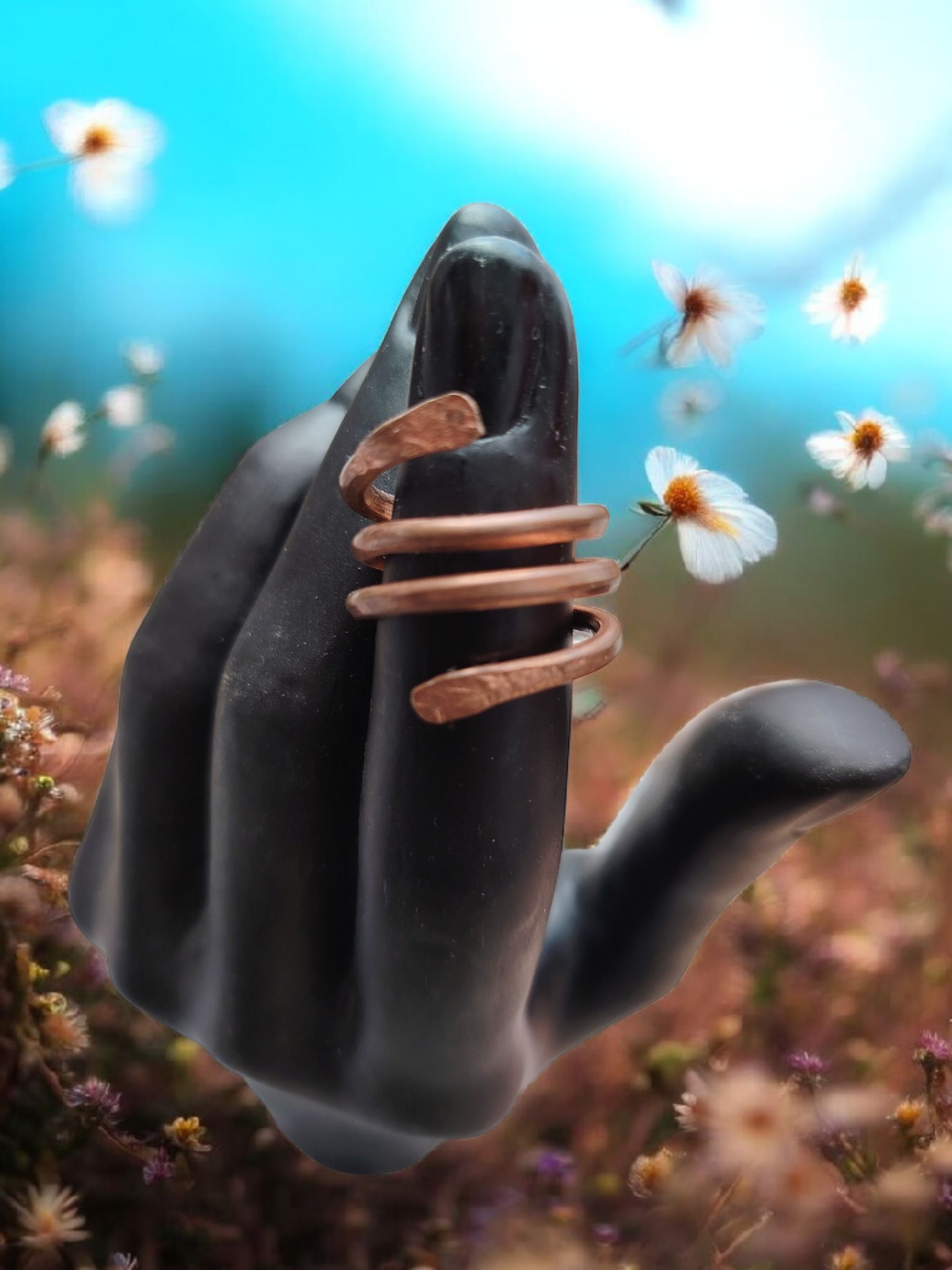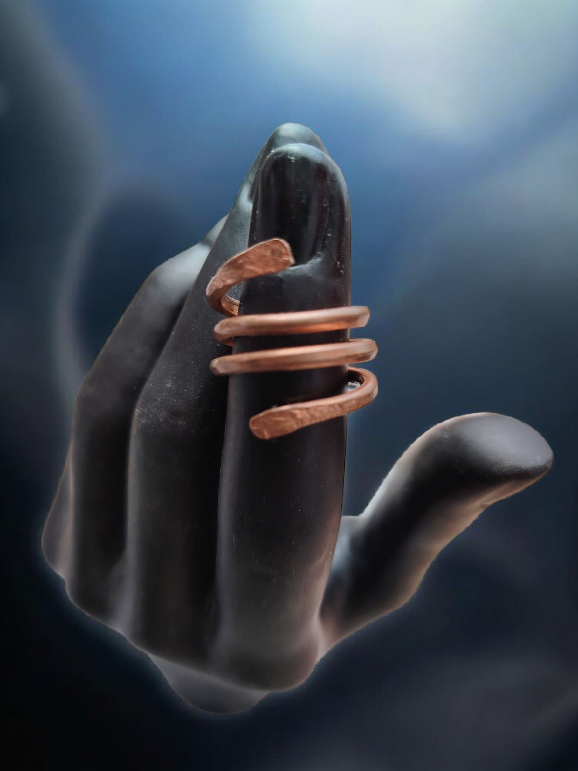 Découvrez la Bague Cuivre “Spirale Originelle”, une pièce artisanale au design brut et contemporain. Façonnée à partir de cuivre pur, cette bague s’enroule autour du doigt dans un mouvement spiralé évoquant l’énergie, le renouveau et la continuité. Chaque courbe est légèrement martelée, créant des reflets chauds et naturels qui font de cette pièce un bijou unique, à la fois élégant et intemporel.