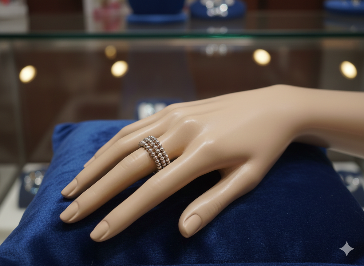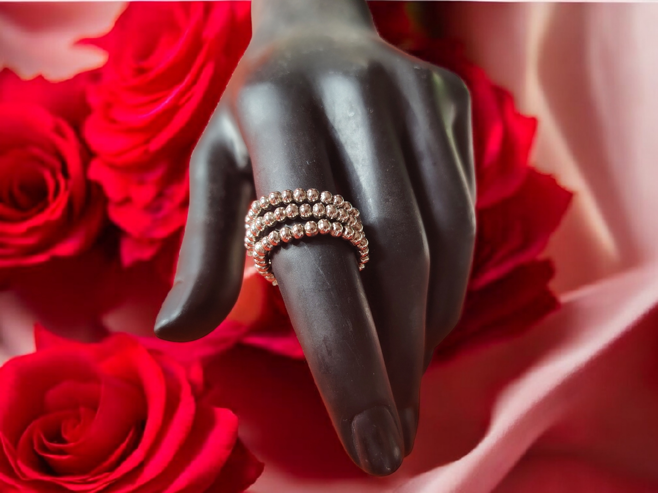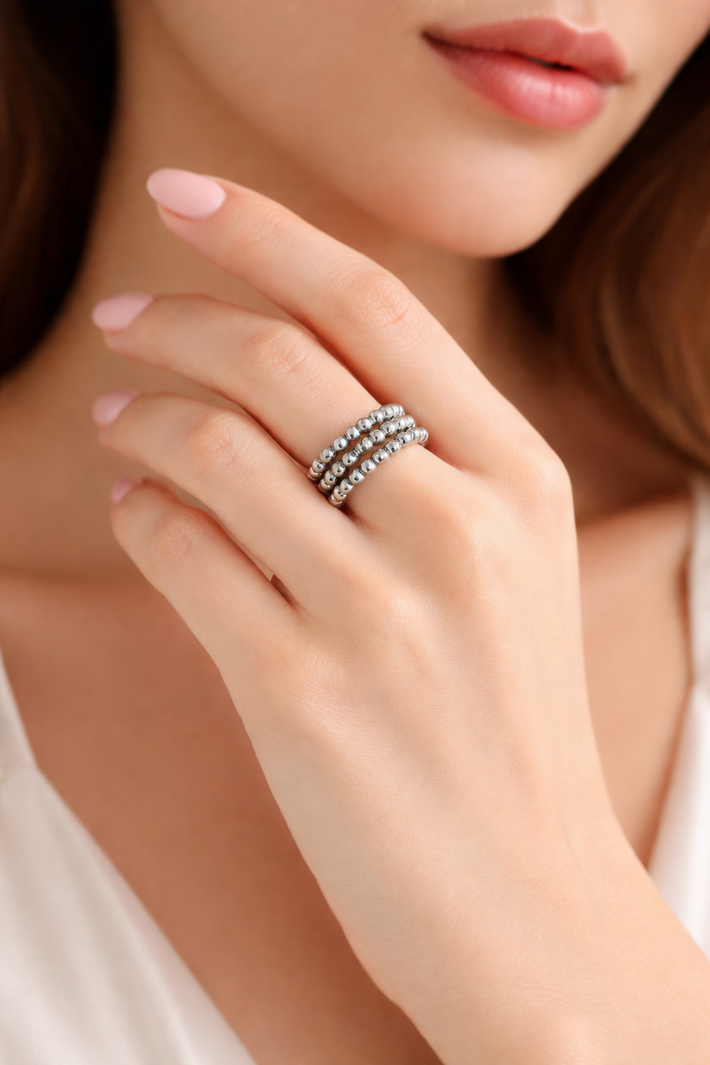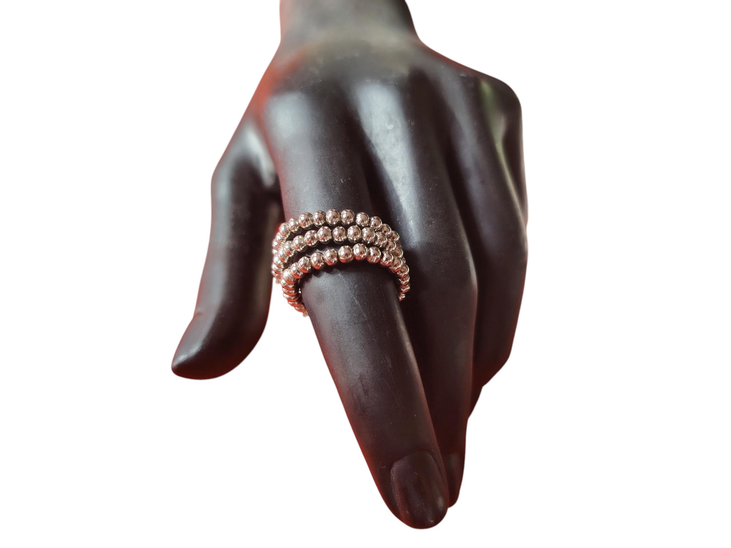 Bague élastique composée de 3 rangs de perles en acier inoxydable argenté de 3 mm. Élégante, confortable et résistante à l’eau, elle s’adapte à toutes les mains pour un style chic au quotidien.