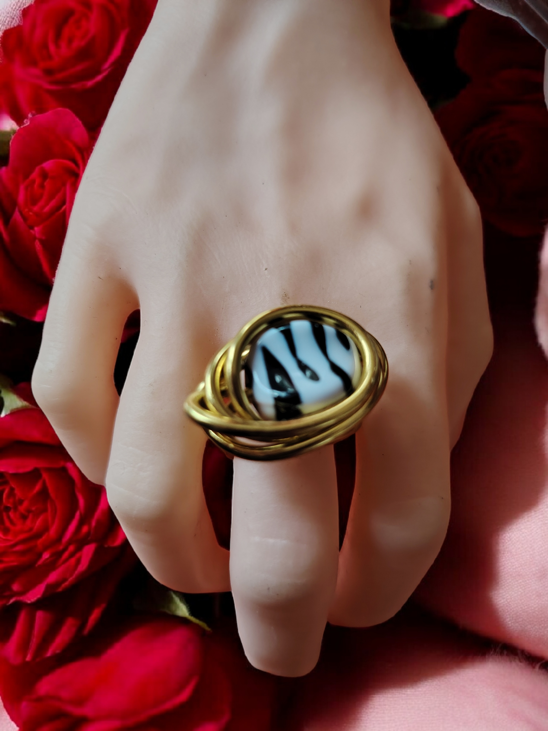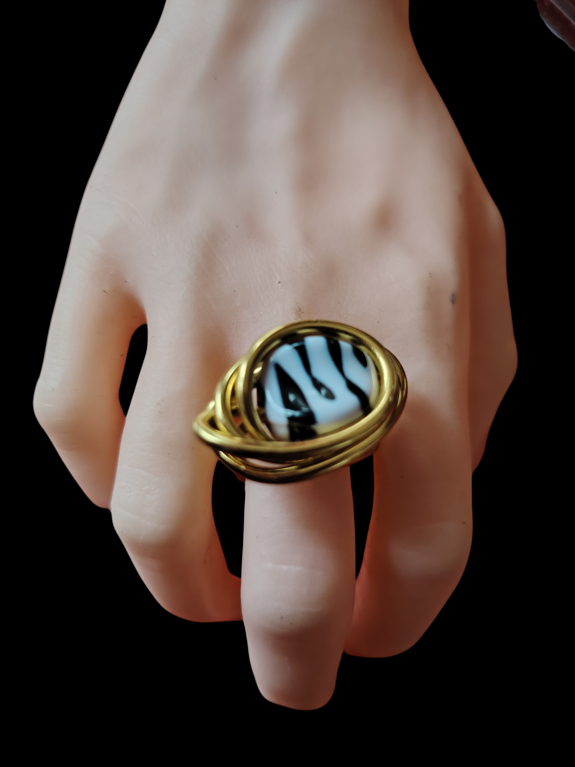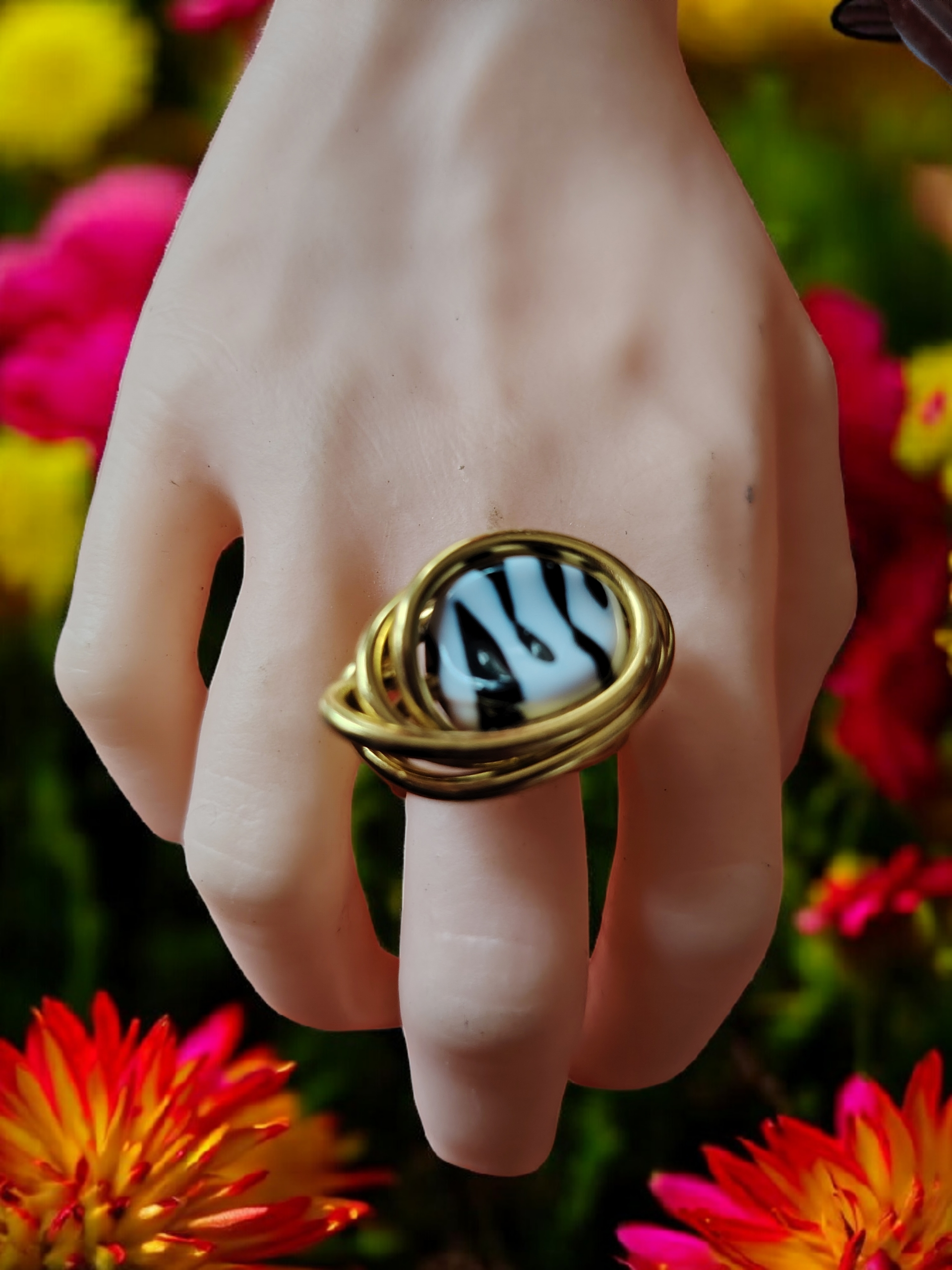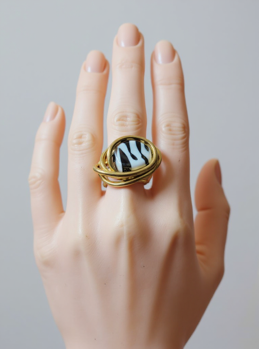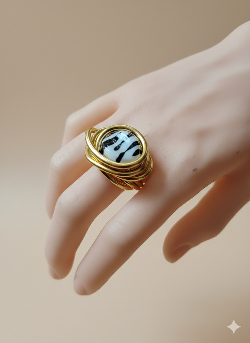 La bague Zébra Éclipse est une pièce unique au caractère affirmé, qui associe l’élégance du fil d’aluminium doré à l’audace d’une perle acrylique au motif zèbre.
