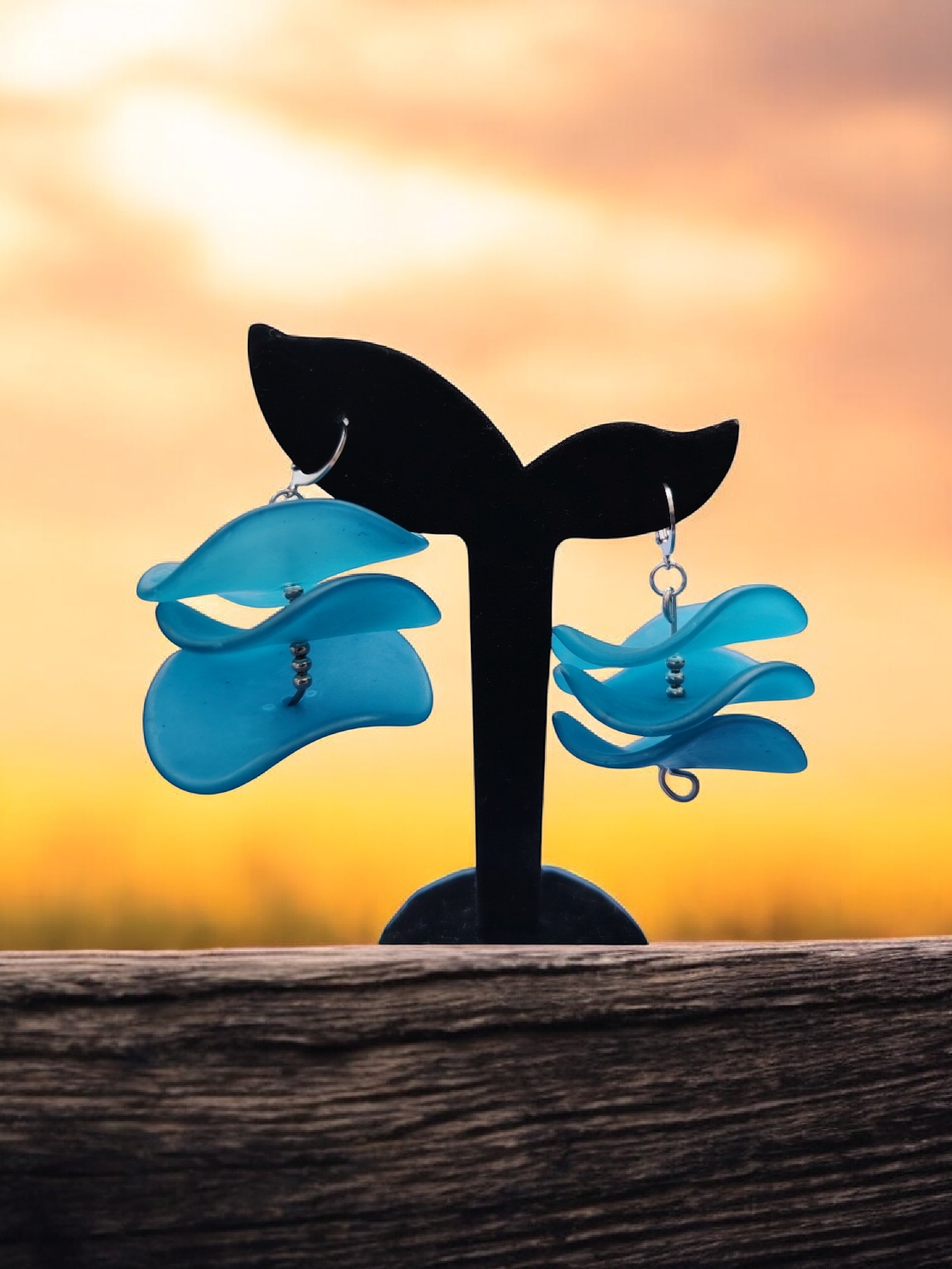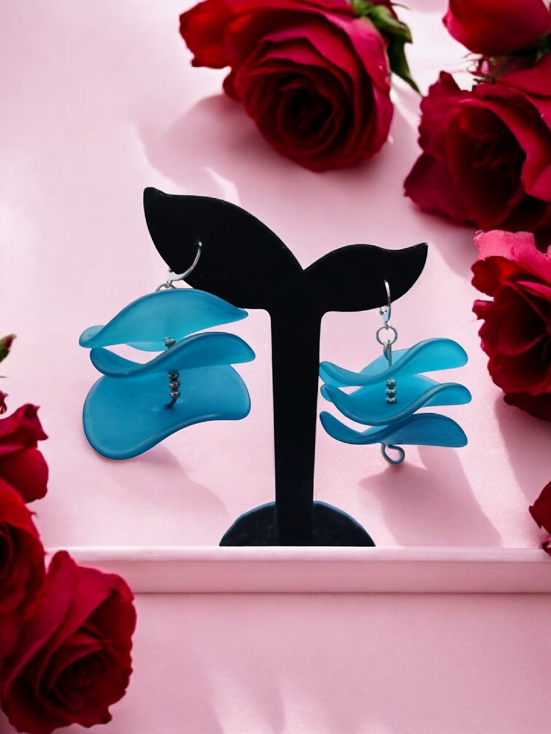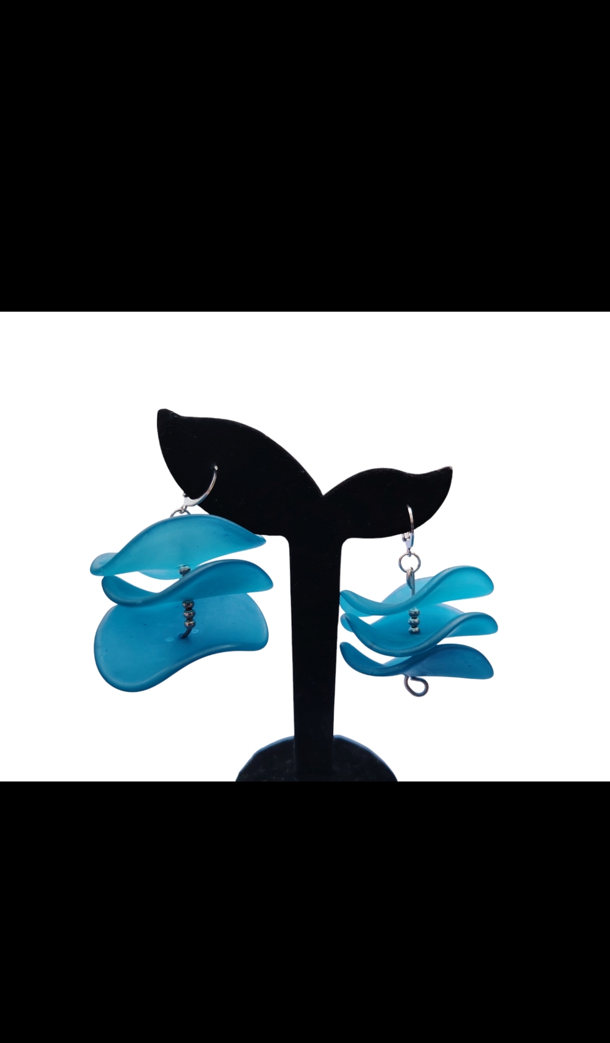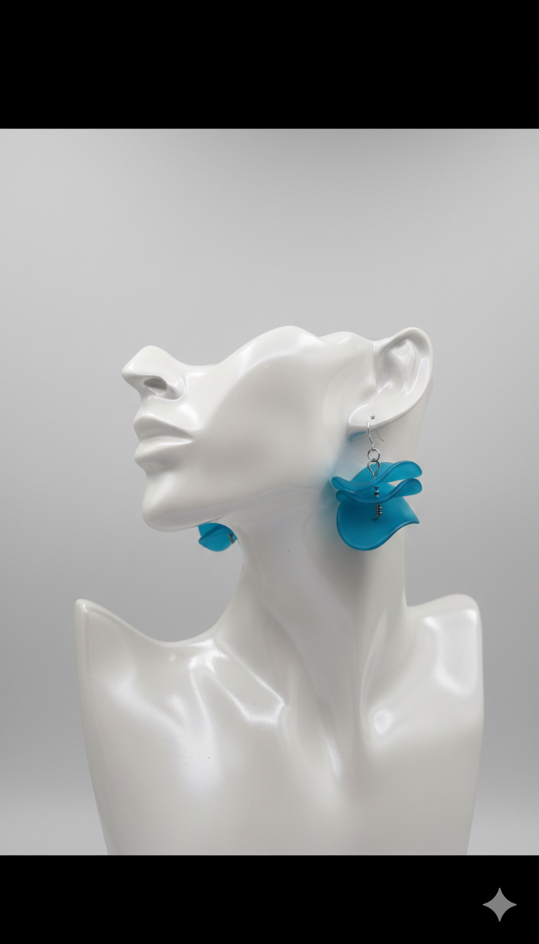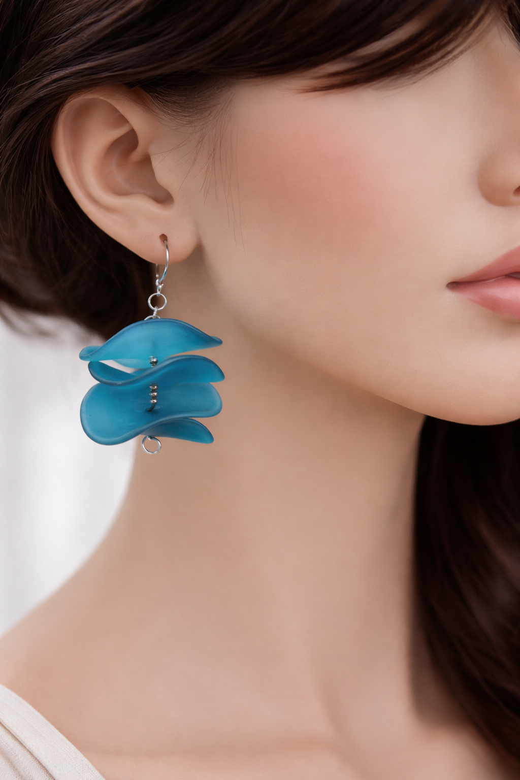 Les boucles d’oreilles Ondine Azur évoquent la douceur des vagues et la fraîcheur de l’océan. Composées de perles acryliques bleues translucides aux formes ondulées, elles offrent un jeu de superpositions léger et aérien qui capte délicatement la lumière à chaque mouvement.