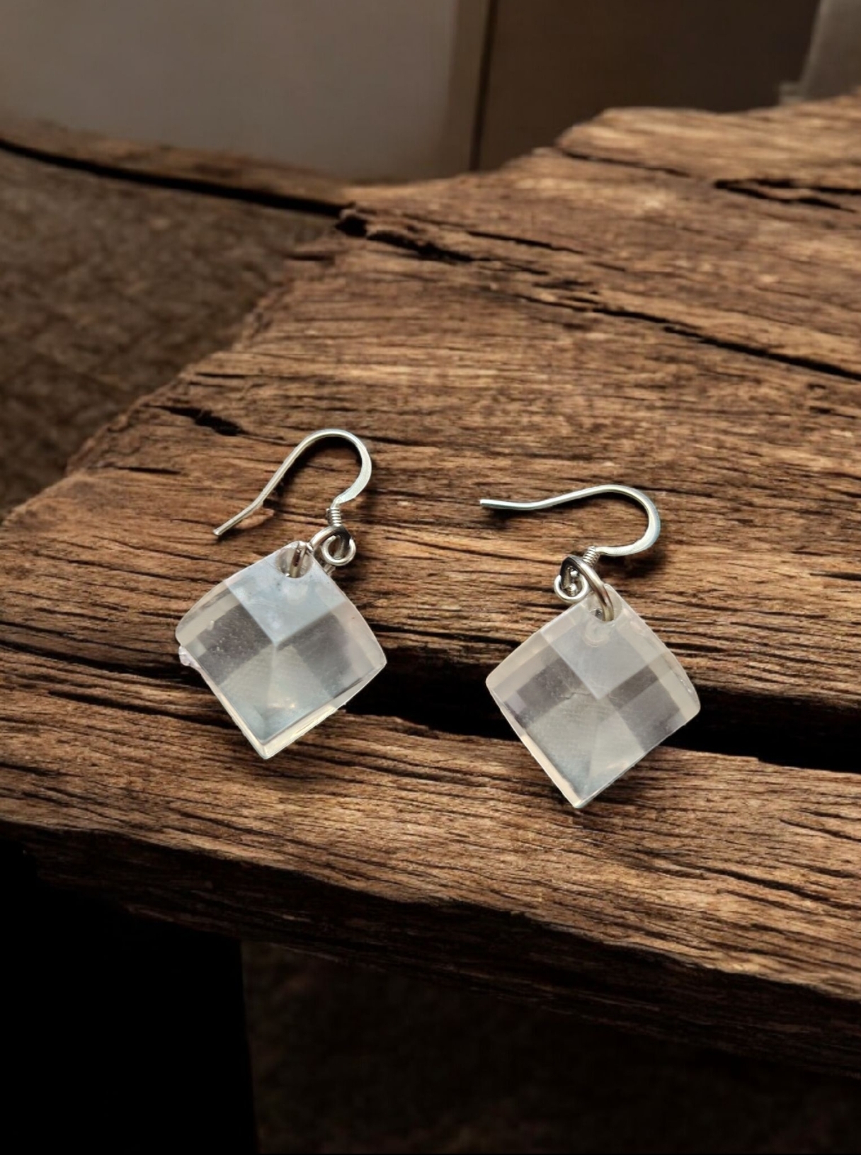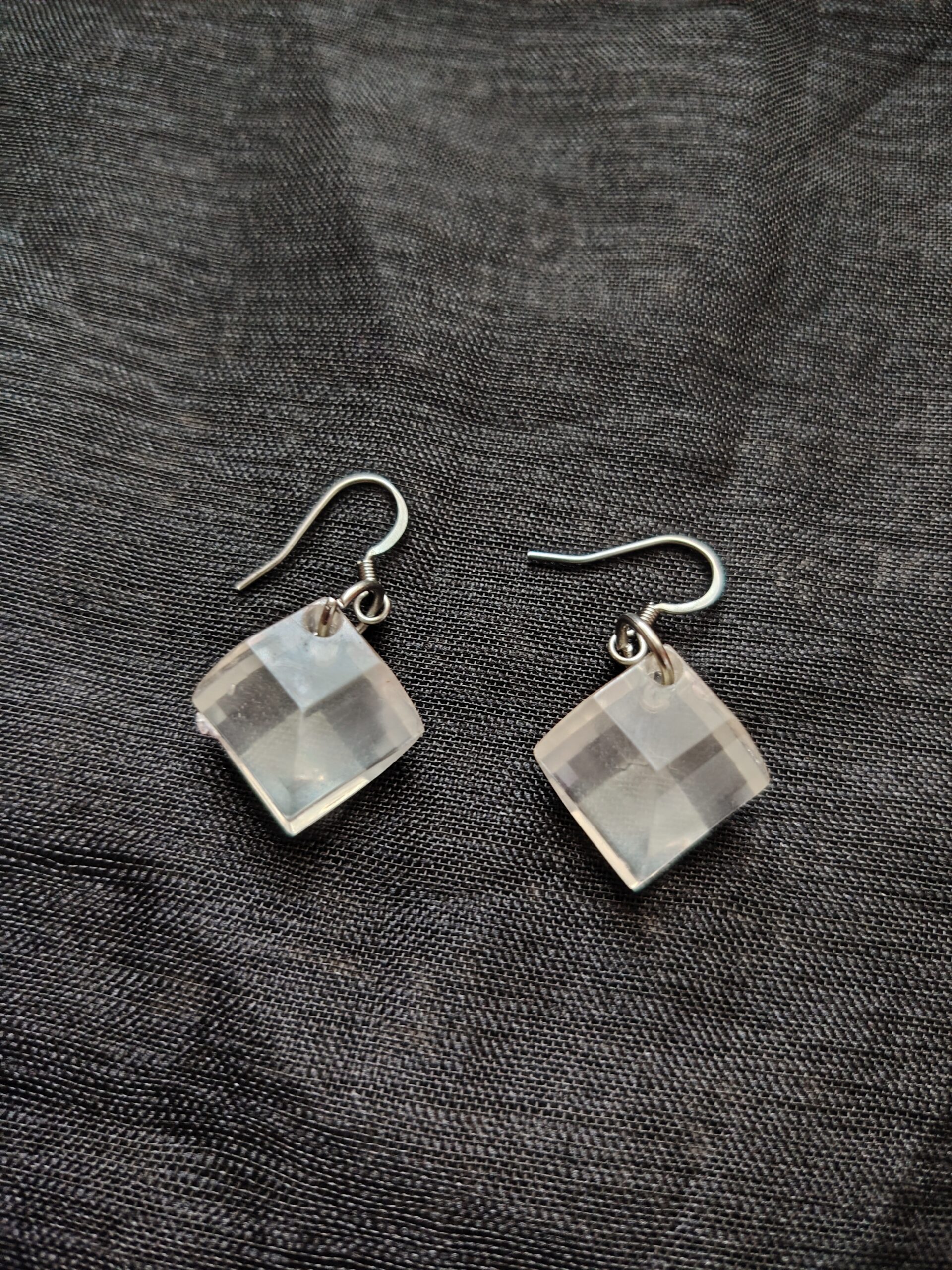 D’un pendentif carré facetté en plastique transparent, imitant l’effet cristal et reflétant joliment la lumière. Sa forme en losange (carré tourné) et ses facettes géométriques apportent un style moderne et minimaliste.