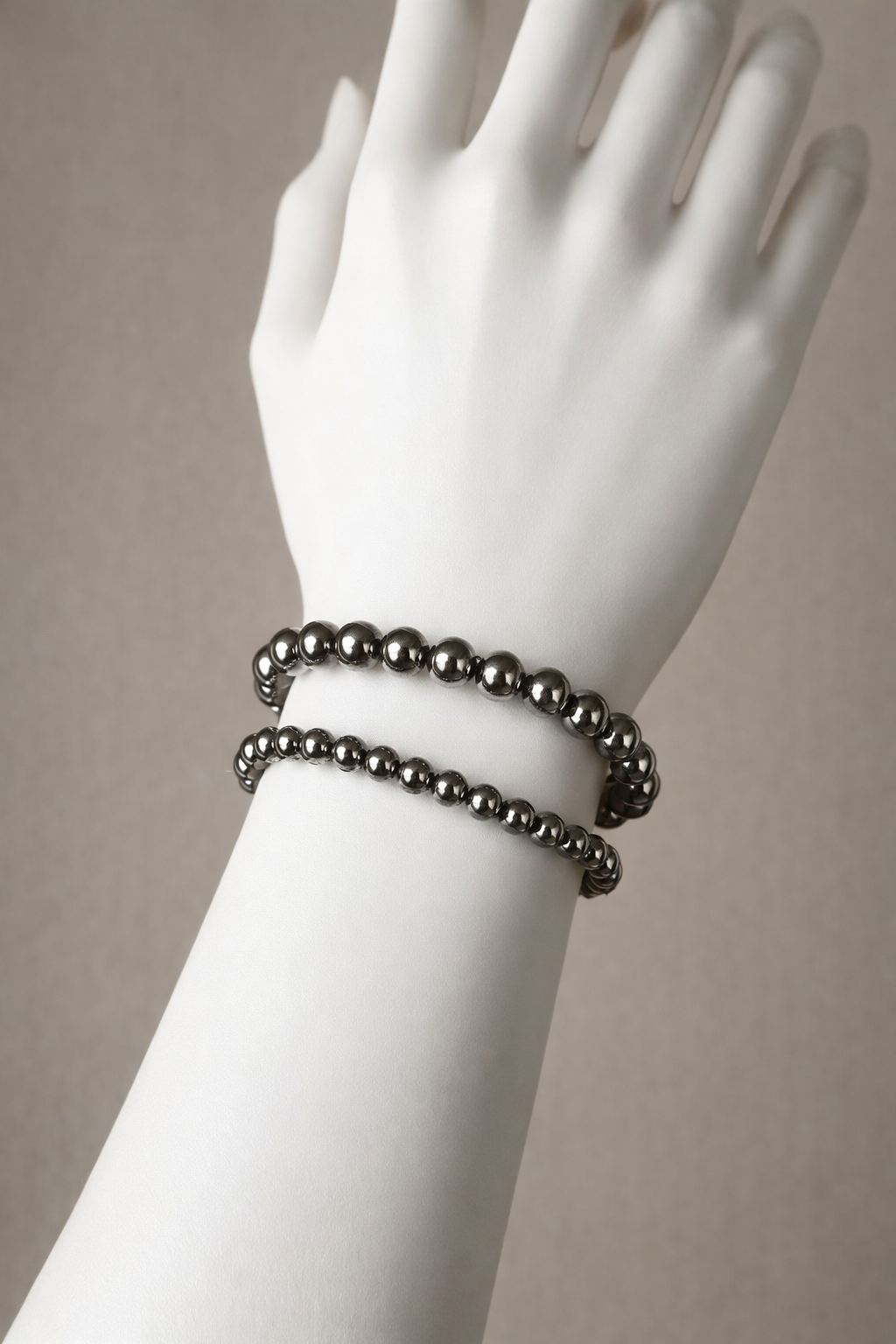 Le bracelet Éclipse incarne l’élégance minimaliste à l’état pur. Composé de perles rondes en acier inoxydable poli, il séduit par son éclat profond et sa finition lisse qui capte subtilement la lumière.