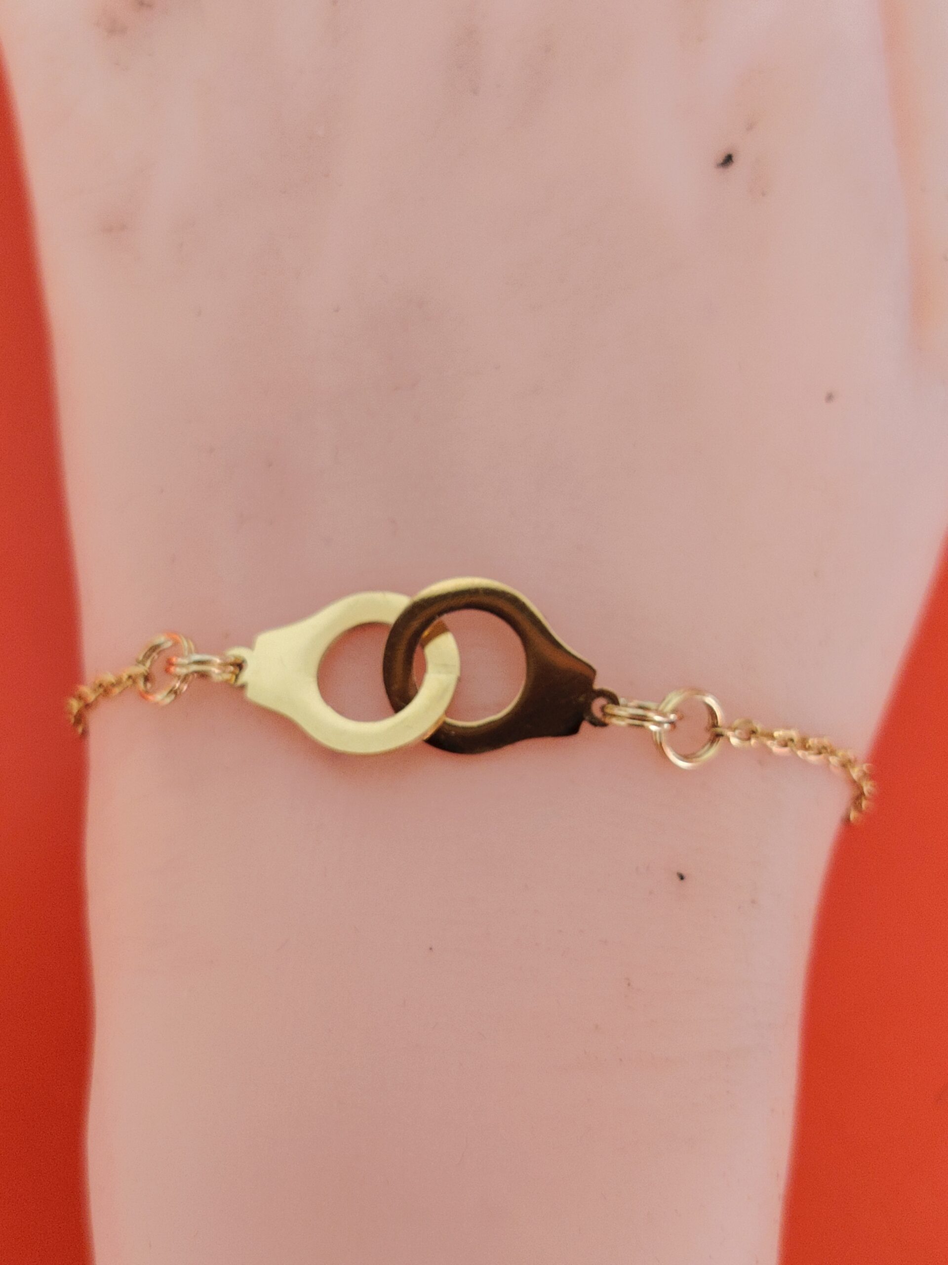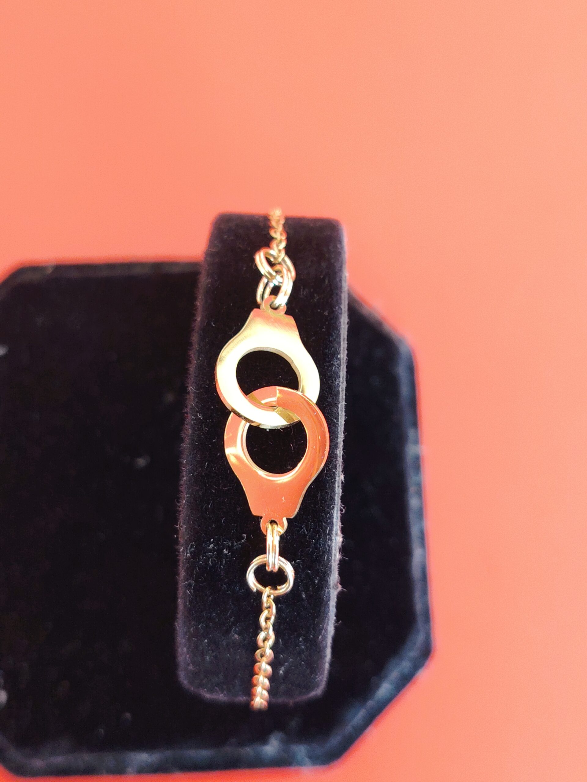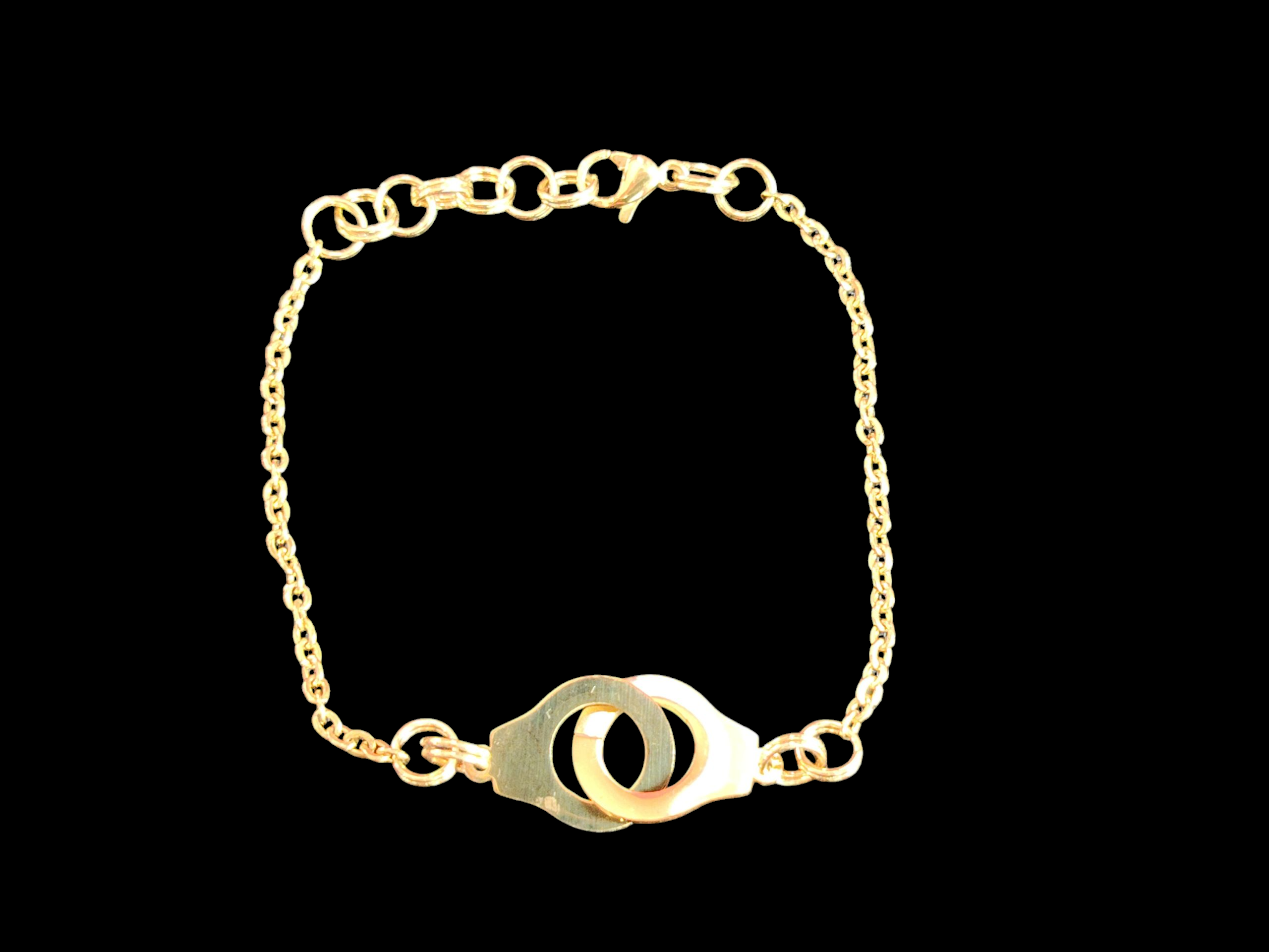 Au centre du bracelet, deux menottes entrelacées se rejoignent en un design harmonieux, symbole fort d’union, d’amitié ou d’amour indéfectible. La chaîne fine et délicate apporte une touche de légèreté, tandis que la finition dorée brillante sublime le poignet avec élégance.
