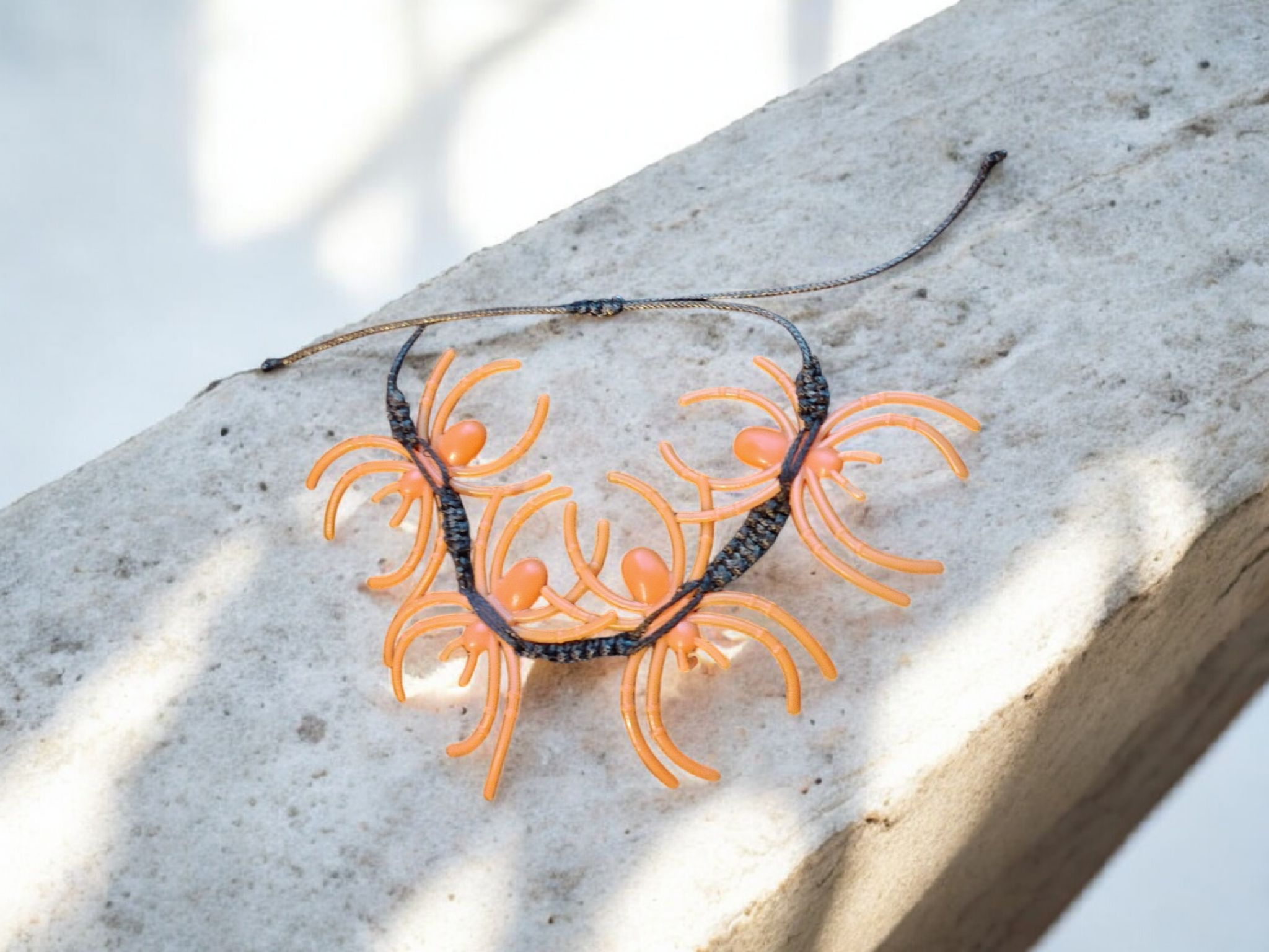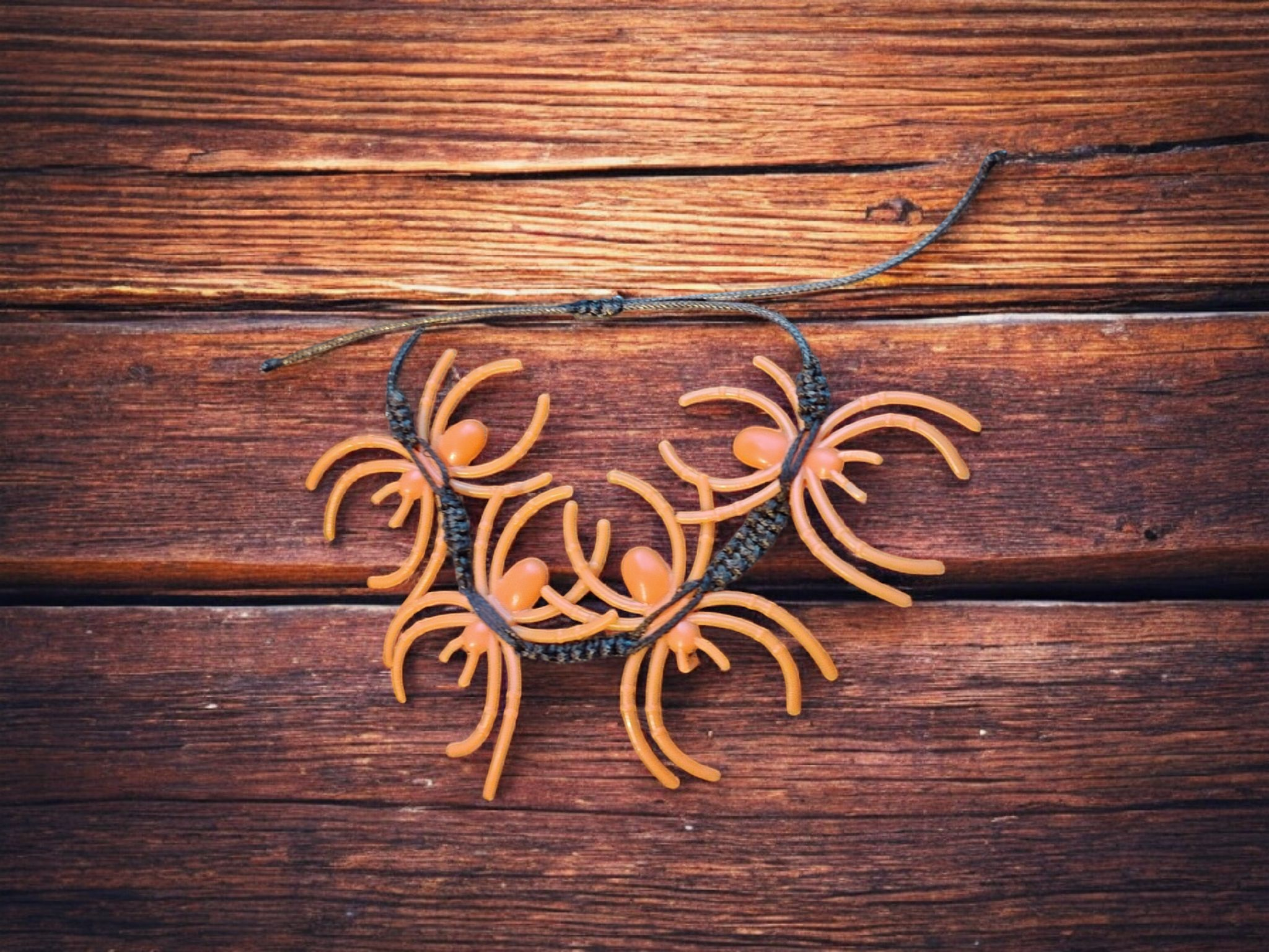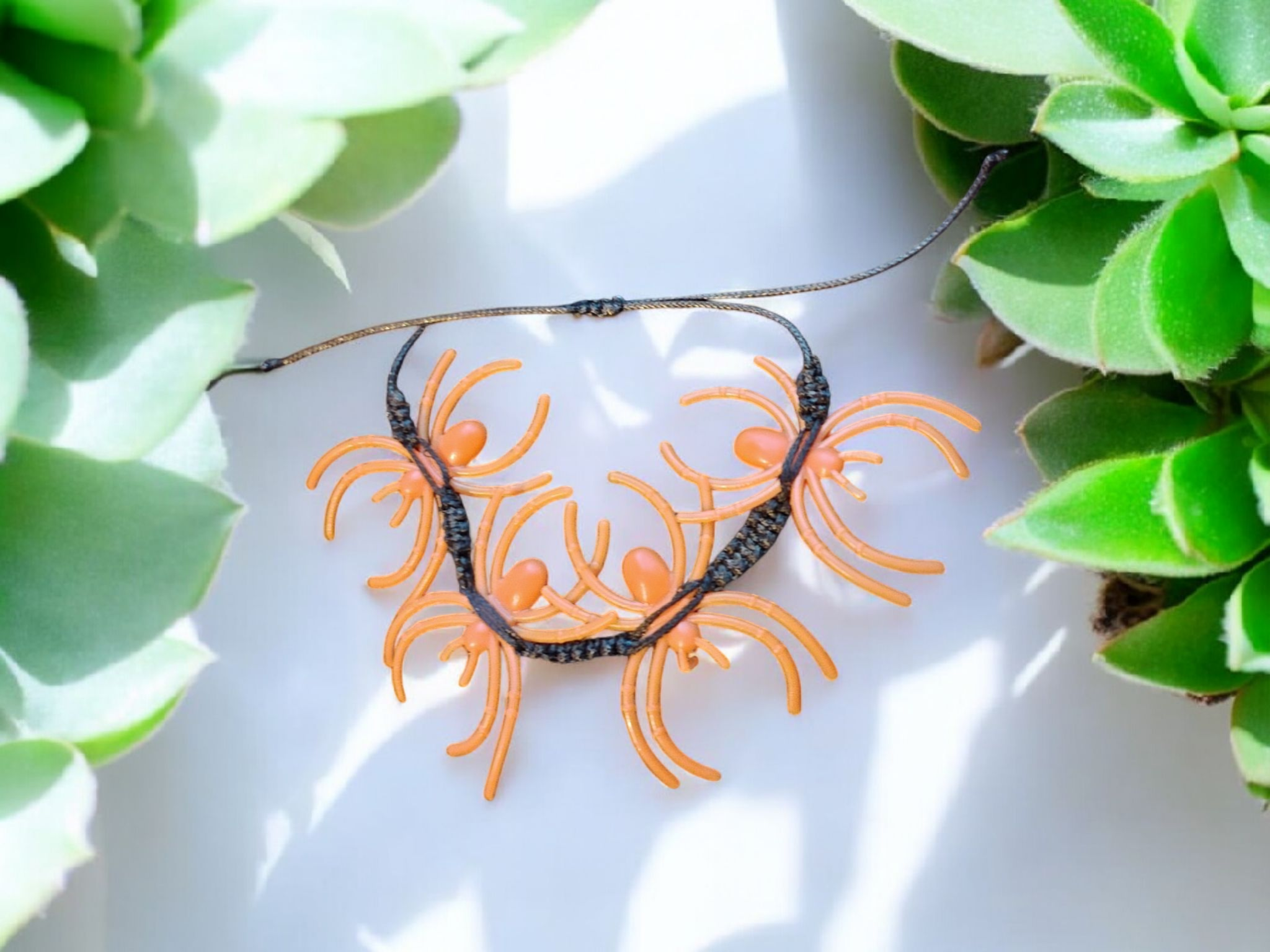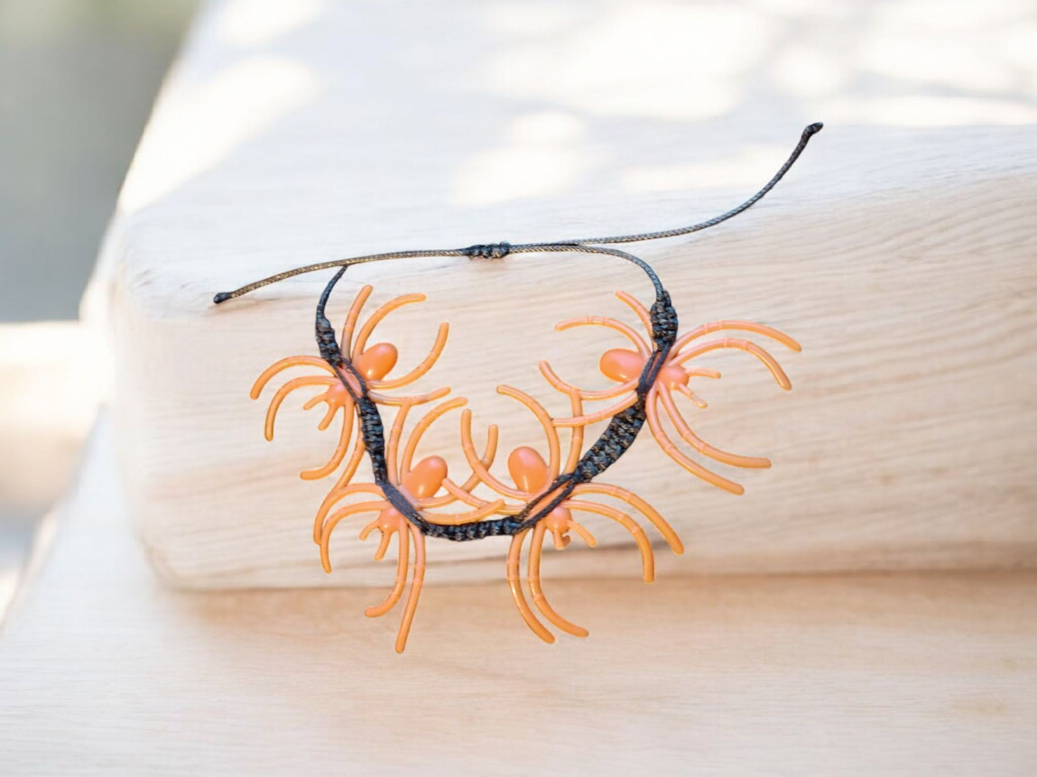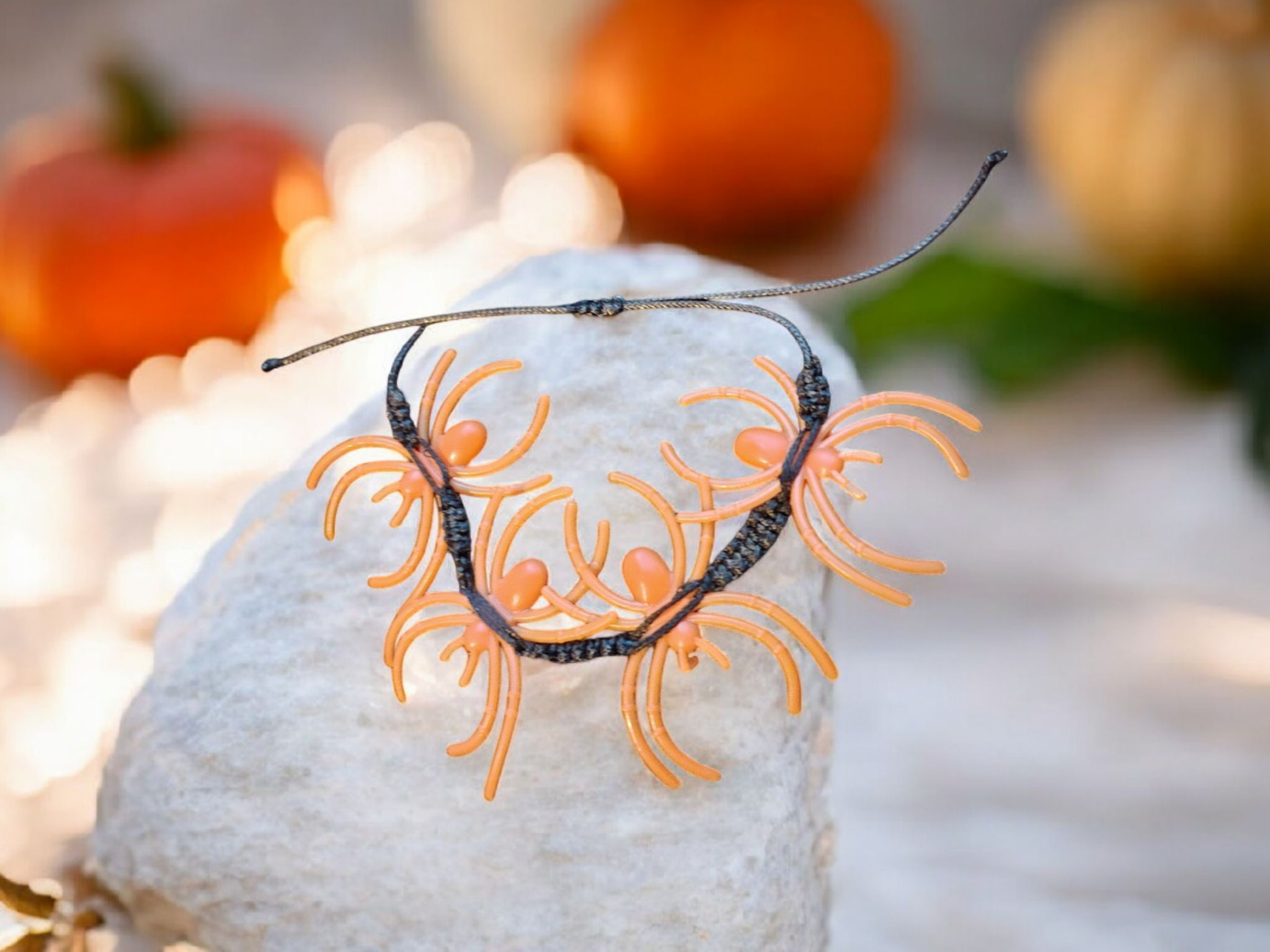 Confectionné à la main en micro-macramé noir, ce bijou tisse délicatement ses fils pour accueillir de petites araignées orange en relief, apportant une touche ludique et un brin d’originalité à votre poignet.