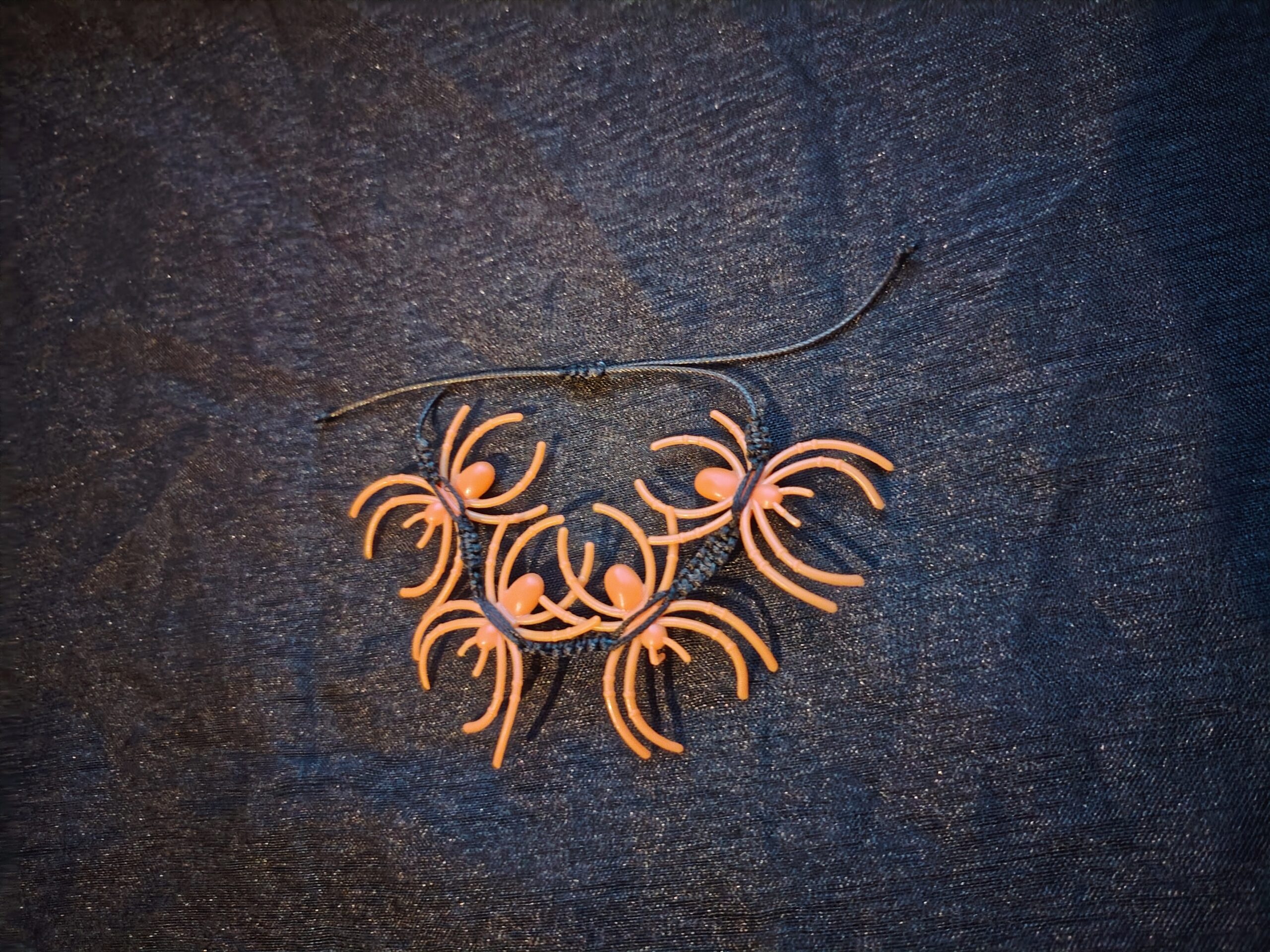 Le contraste saisissant entre le noir profond du macramé et l’éclat orangé des araignées en fait un accessoire parfait pour Halloween, les festivals, ou pour affirmer un style alternatif et créatif au quotidien.
