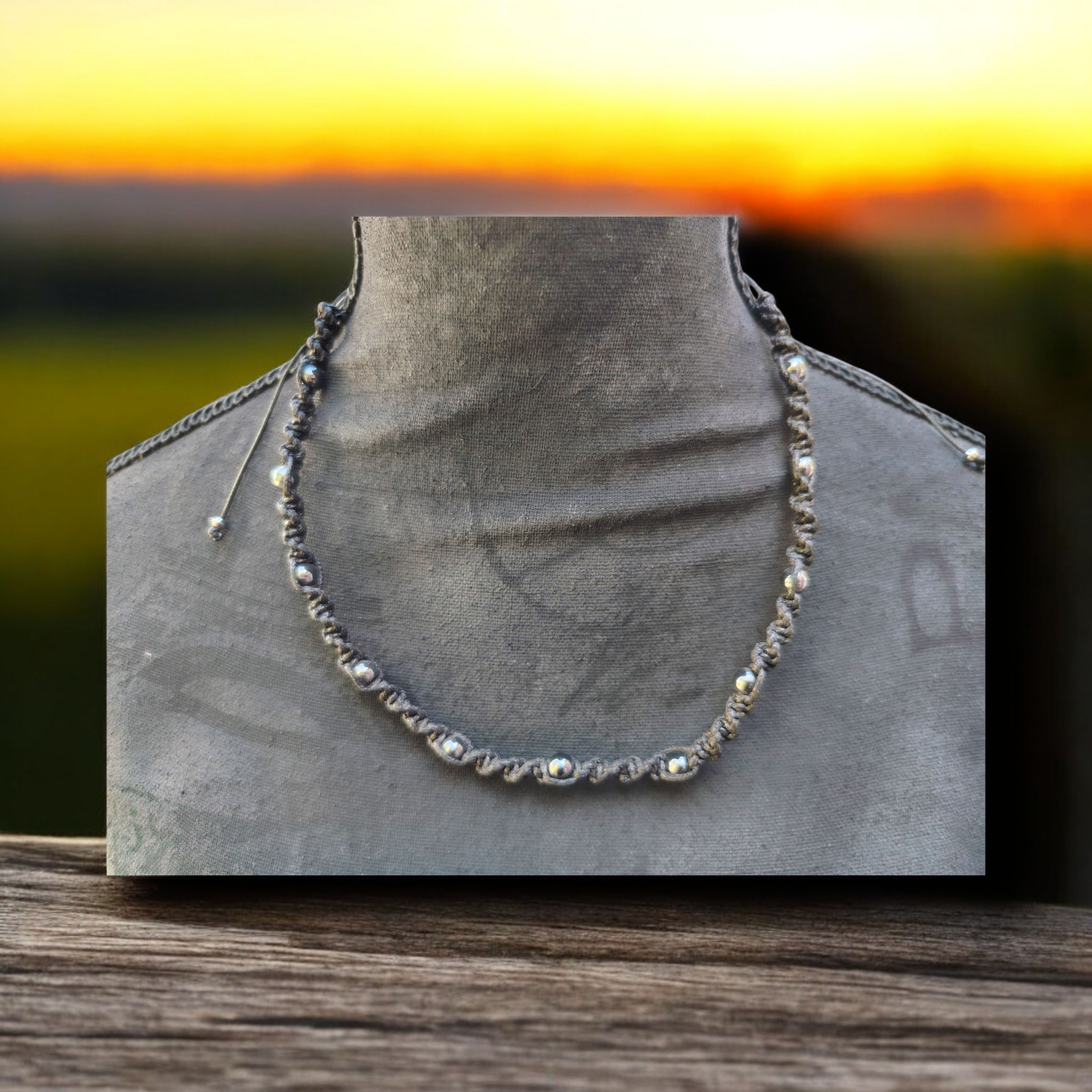 Ce collier réglable « Ancrage Sidéral » est une pièce unique qui allie la finesse de la technique du micro-macramé à la puissance de l’Hématite. Conçu avec un fil ciré noir résistant, chaque perle d’Hématite de 6 mm est délicatement encerclée de nœuds, créant une texture riche et un contraste saisissant.