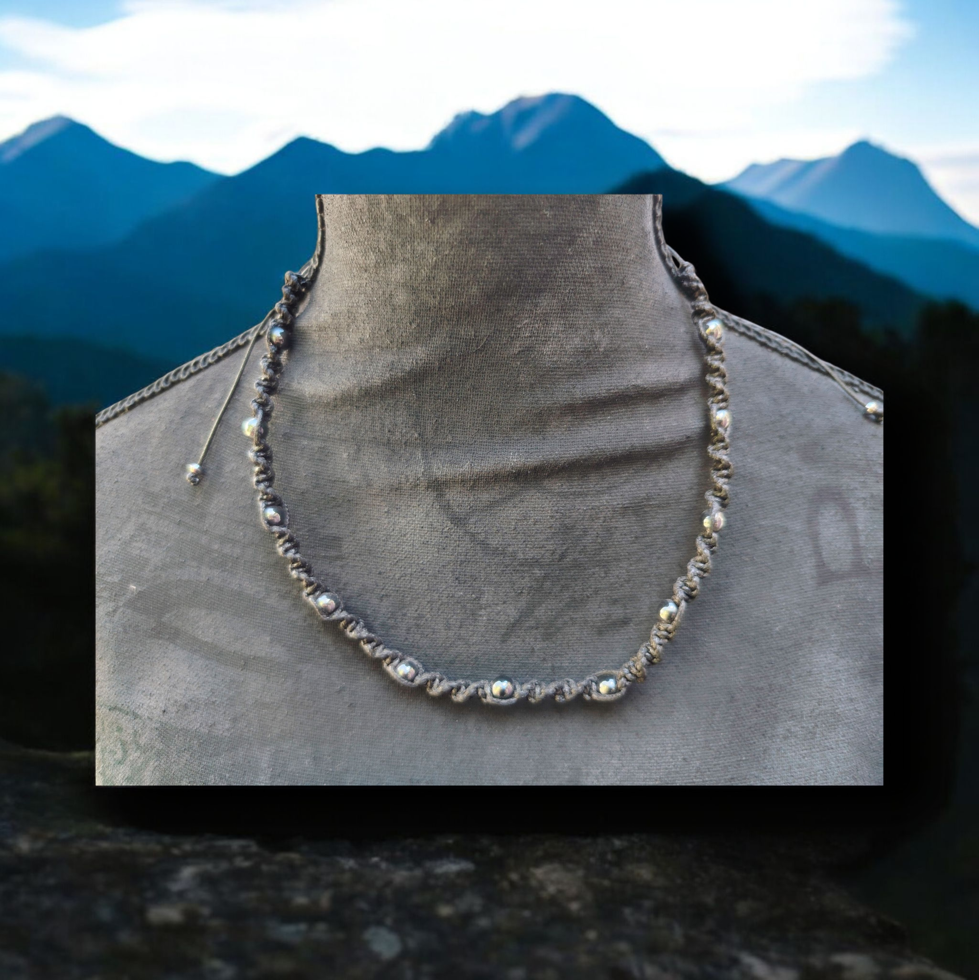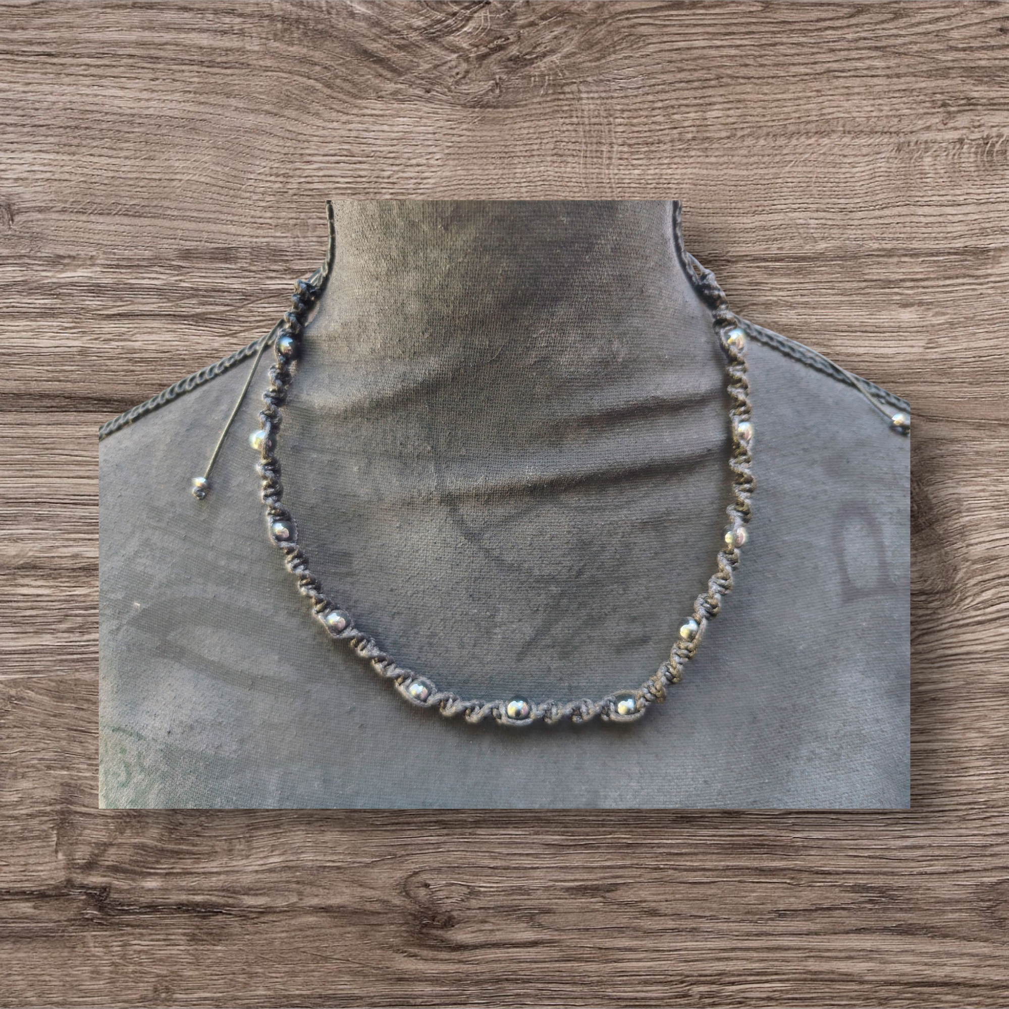 L’éclat métallique et argenté des perles d’Hématite se détache élégamment sur le fond noir, offrant un bijou à la fois discret et sophistiqué. Sa conception réglable, finie par de petites perles aux extrémités, vous permet de l’ajuster parfaitement à la longueur désirée, le portant en ras-de-cou ou en pendentif.