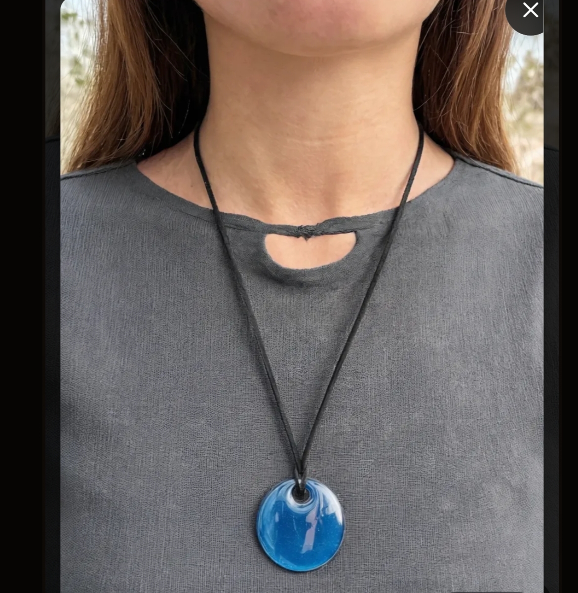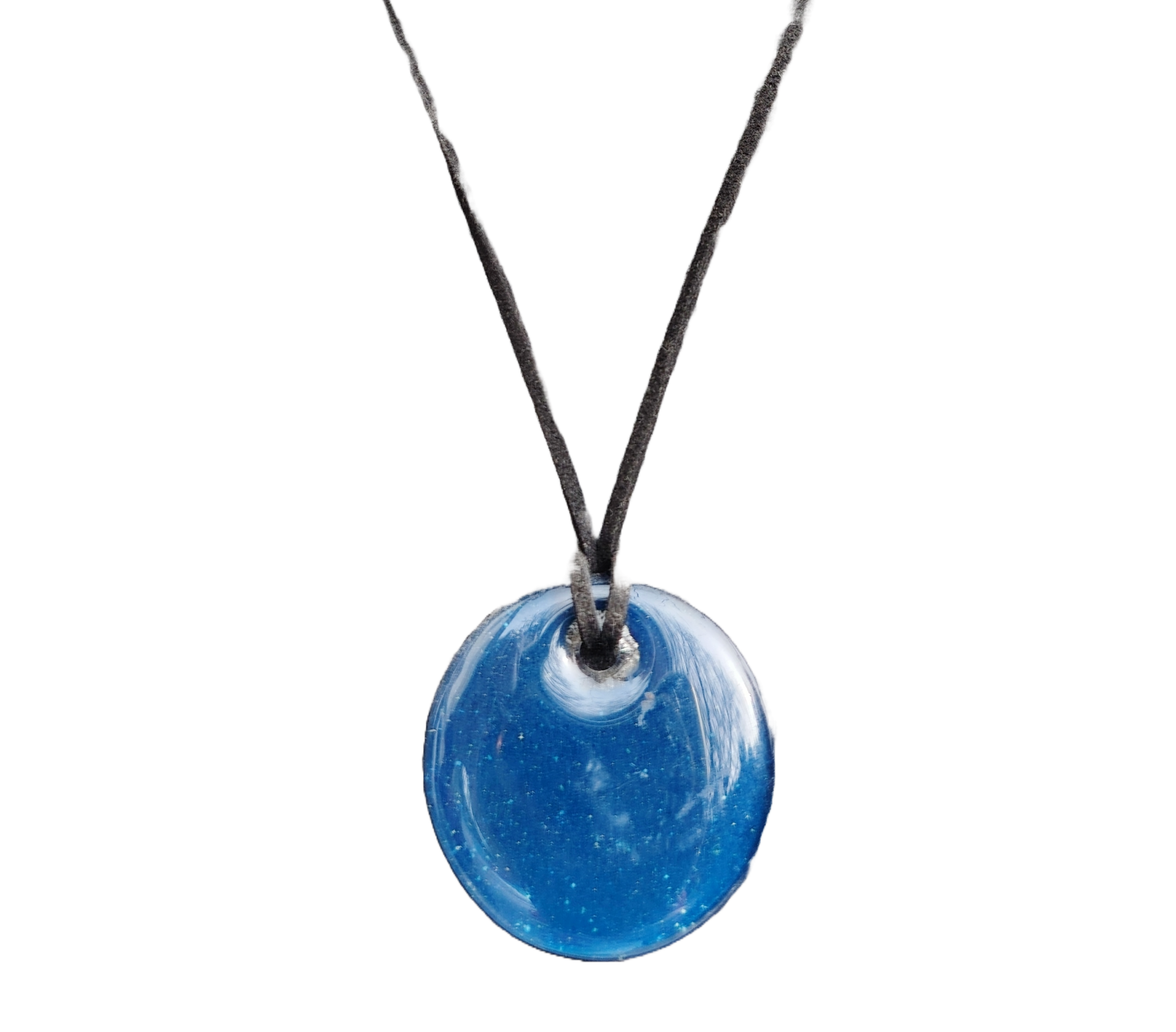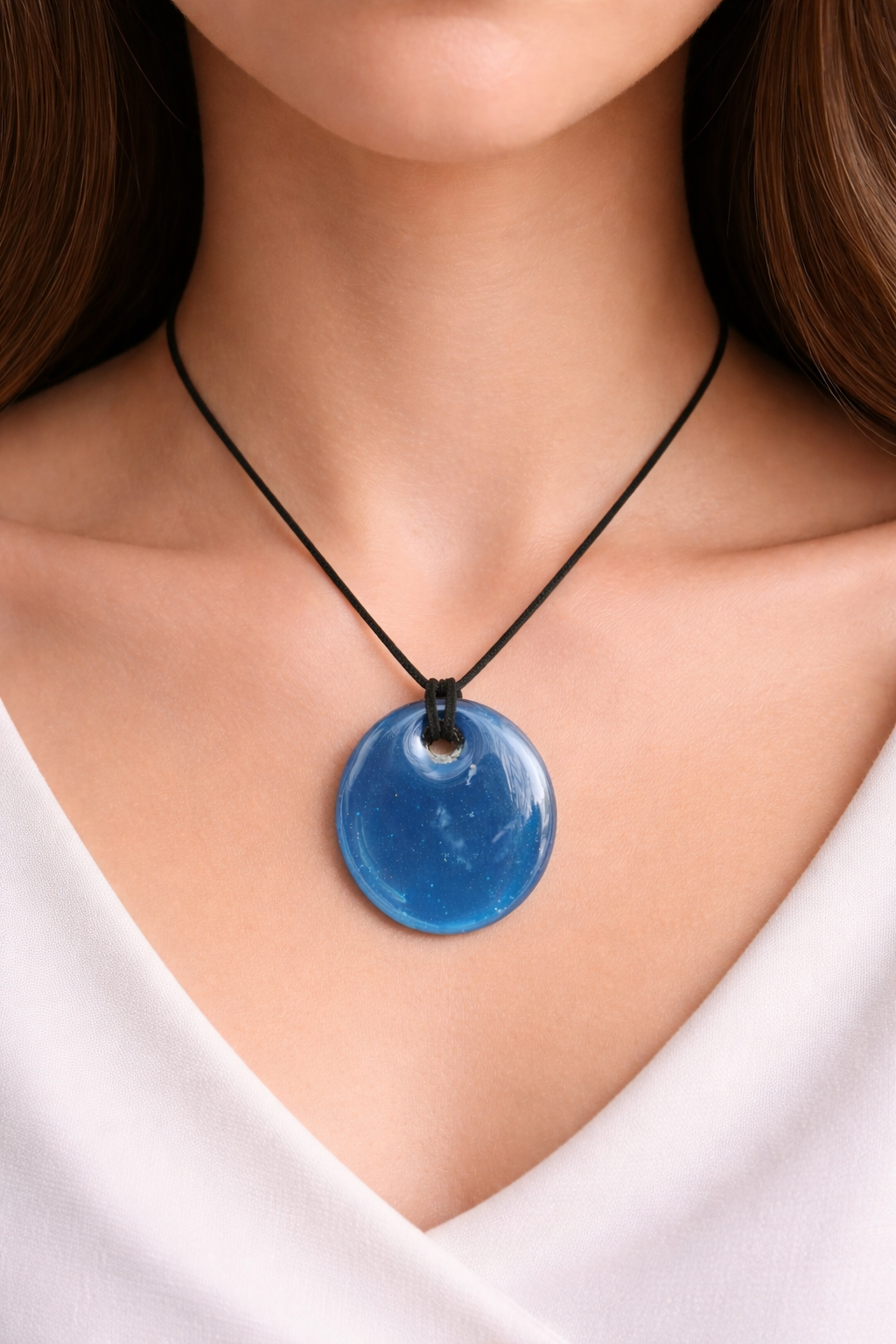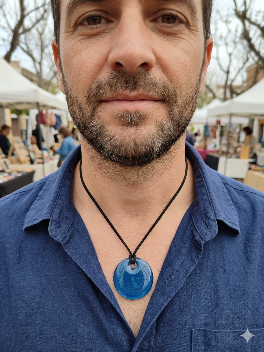 Son pendentif en verre fait main, d’un bleu profond et scintillant, évoque les eaux claires et paisibles d’un lagon sous le soleil. Chaque pièce est soigneusement façonnée à la main, ce qui rend chaque pendentif unique par ses subtiles variations et reflets lumineux.