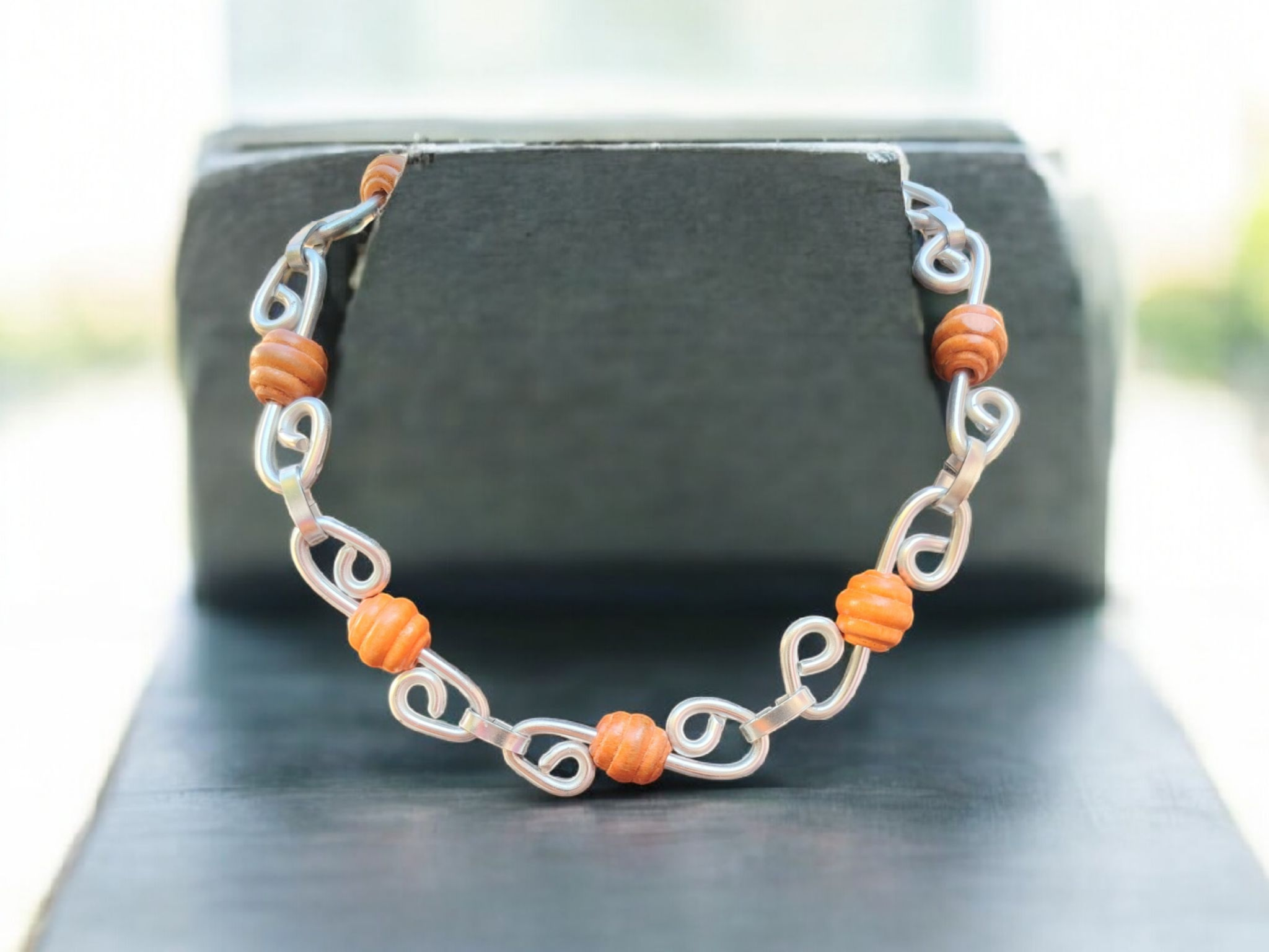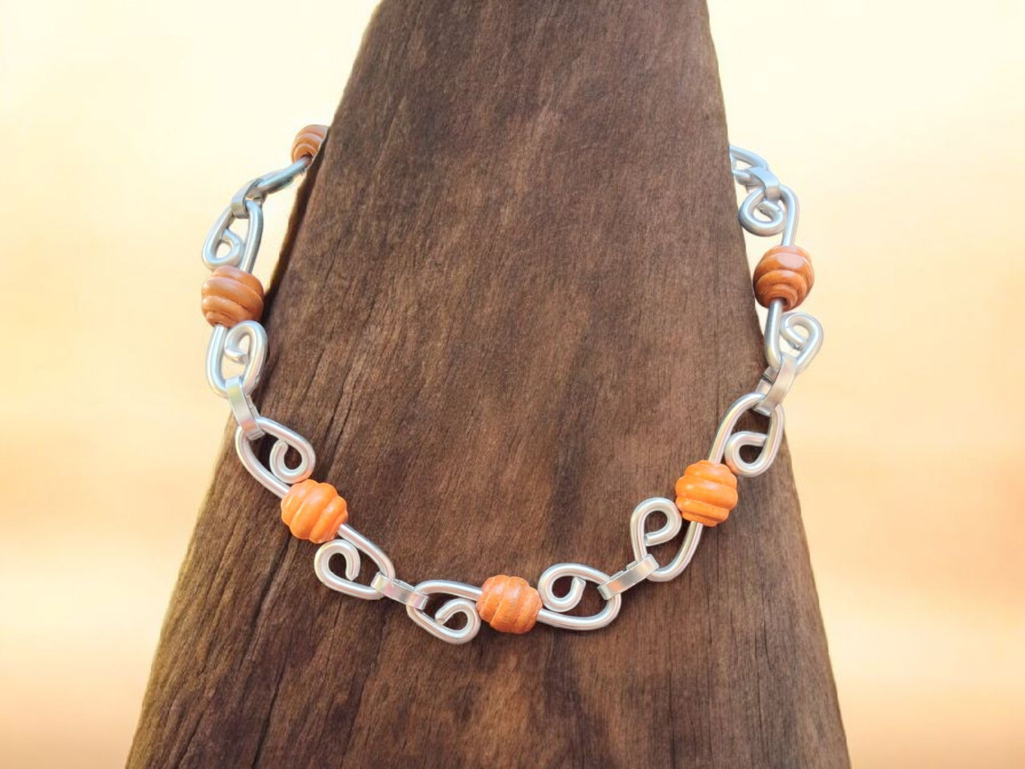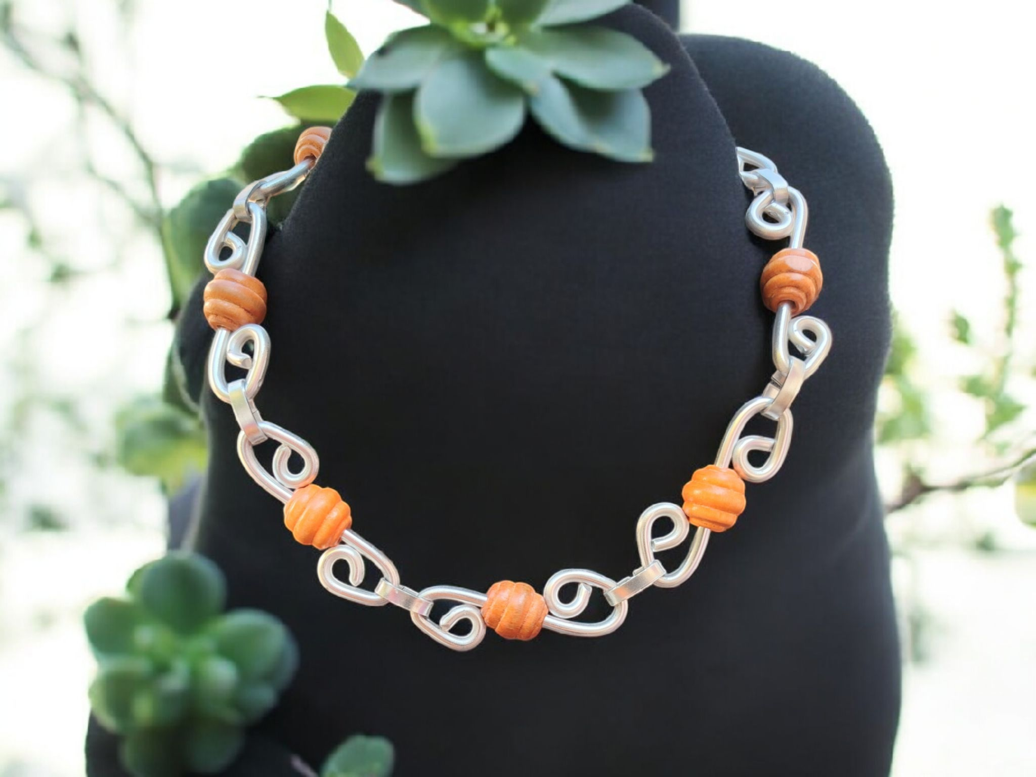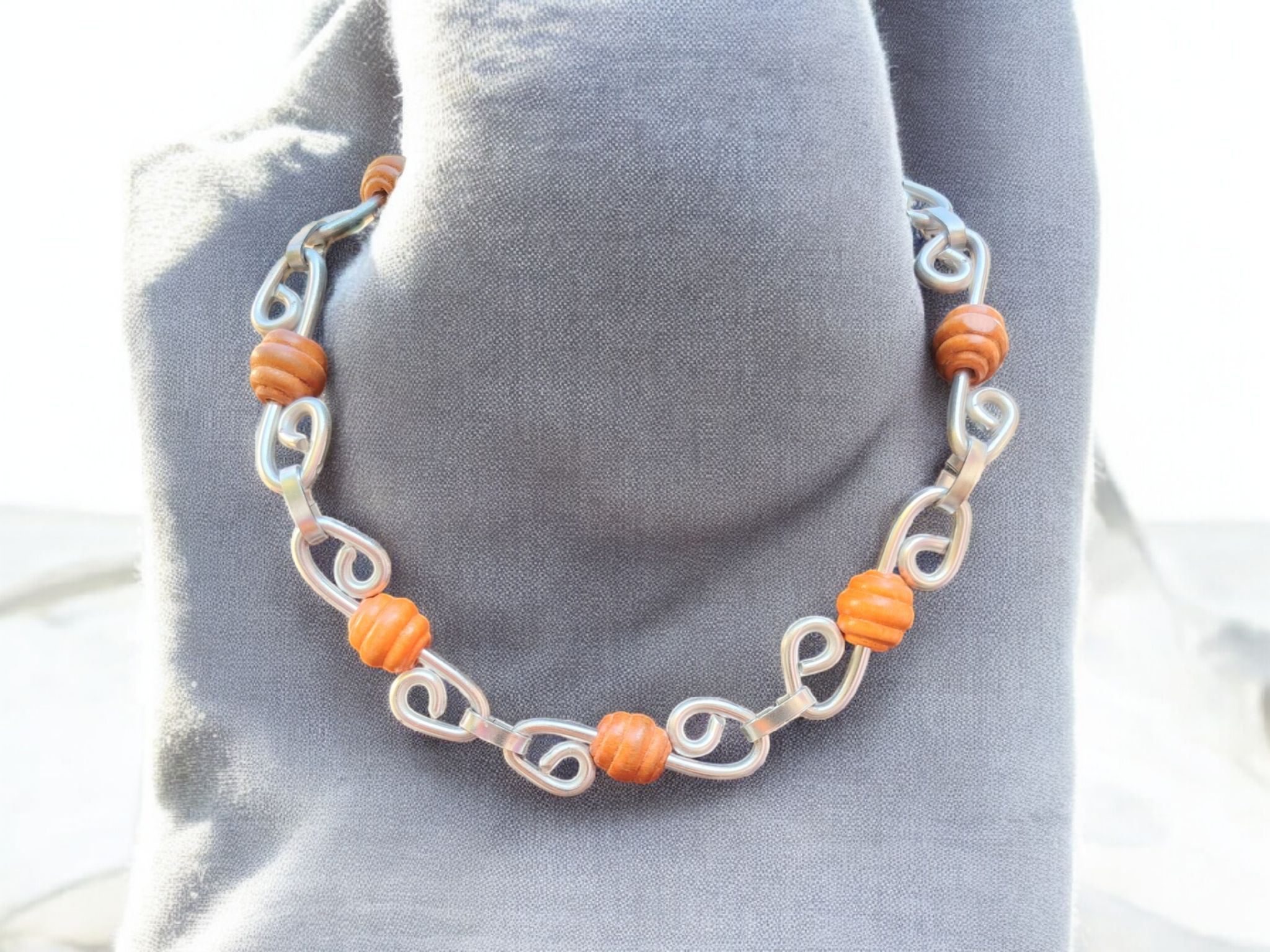 Collier « Éclat Bohème » – Élégant collier de 50 cm en aluminium argenté et perles de bois orange, léger, artisanal et plein de charme naturel.