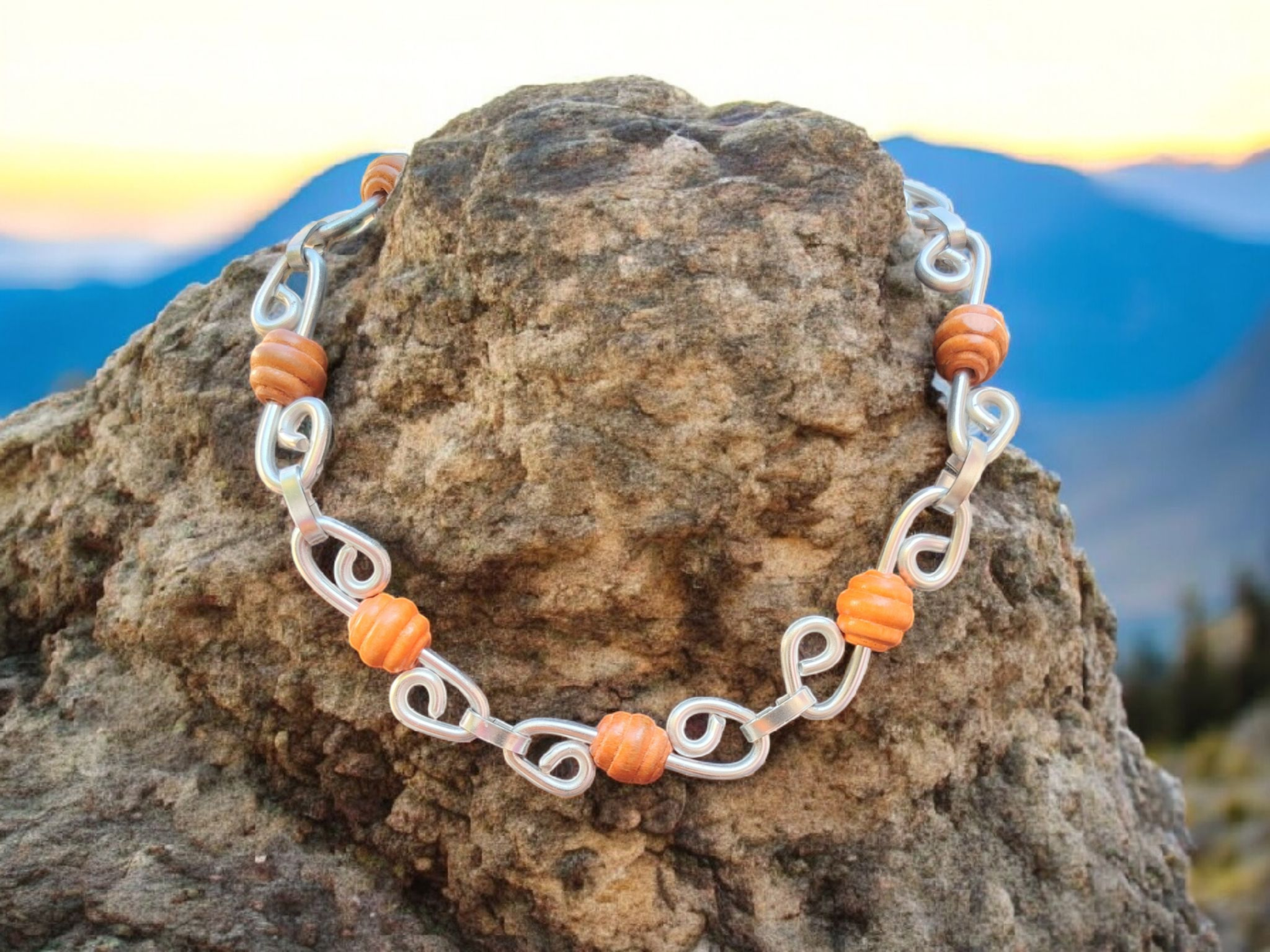 Les perles de bois orange sculptées apportent une touche artisanale et chaleureuse, rappelant les nuances dorées du soleil couchant. Leur couleur vive contraste délicatement avec l’éclat argenté de l’aluminium, créant un équilibre parfait entre nature et modernité.