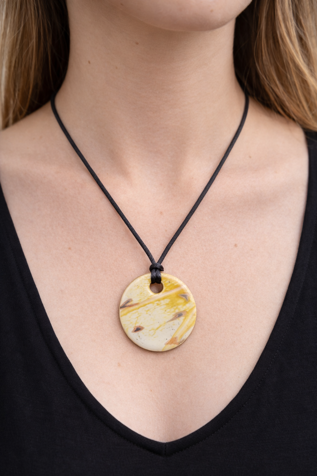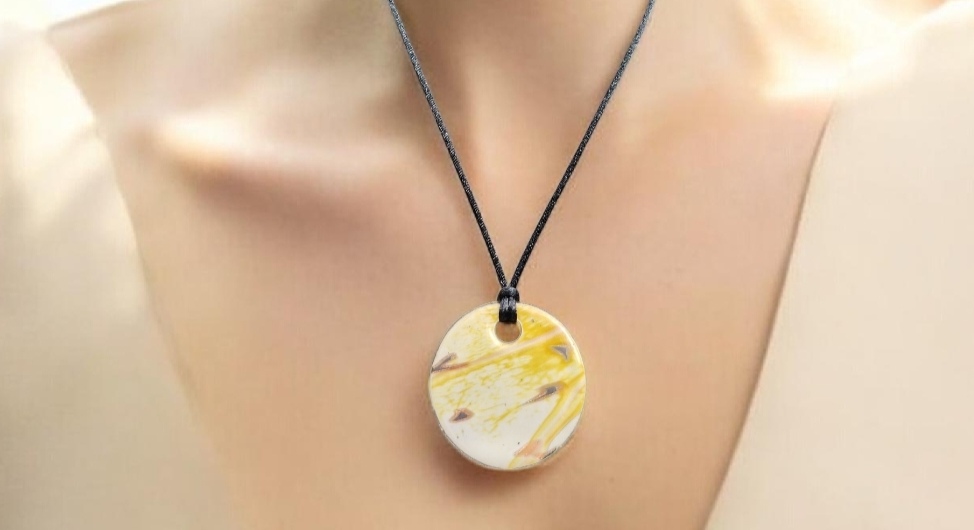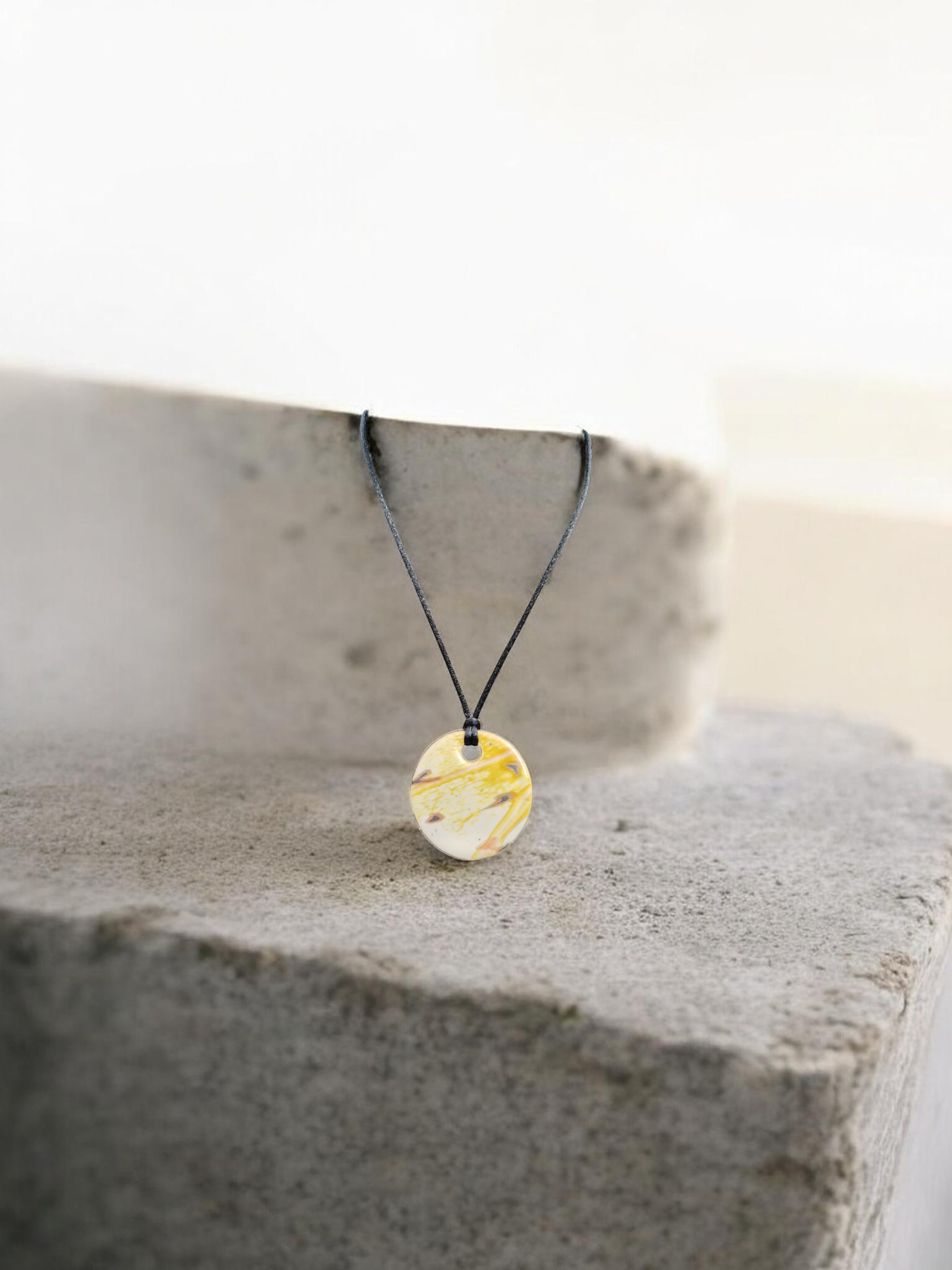 Ce bijou unique est composé d’un pendentif en verre fait main, en forme de disque (diamètre approximatif 4 cm), orné de délicats motifs jaune doré et brun , évoquant les premières lueurs d’un lever de soleil. Chaque pendentif est soufflé et peint artisanalement, rendant chaque pièce absolument unique.