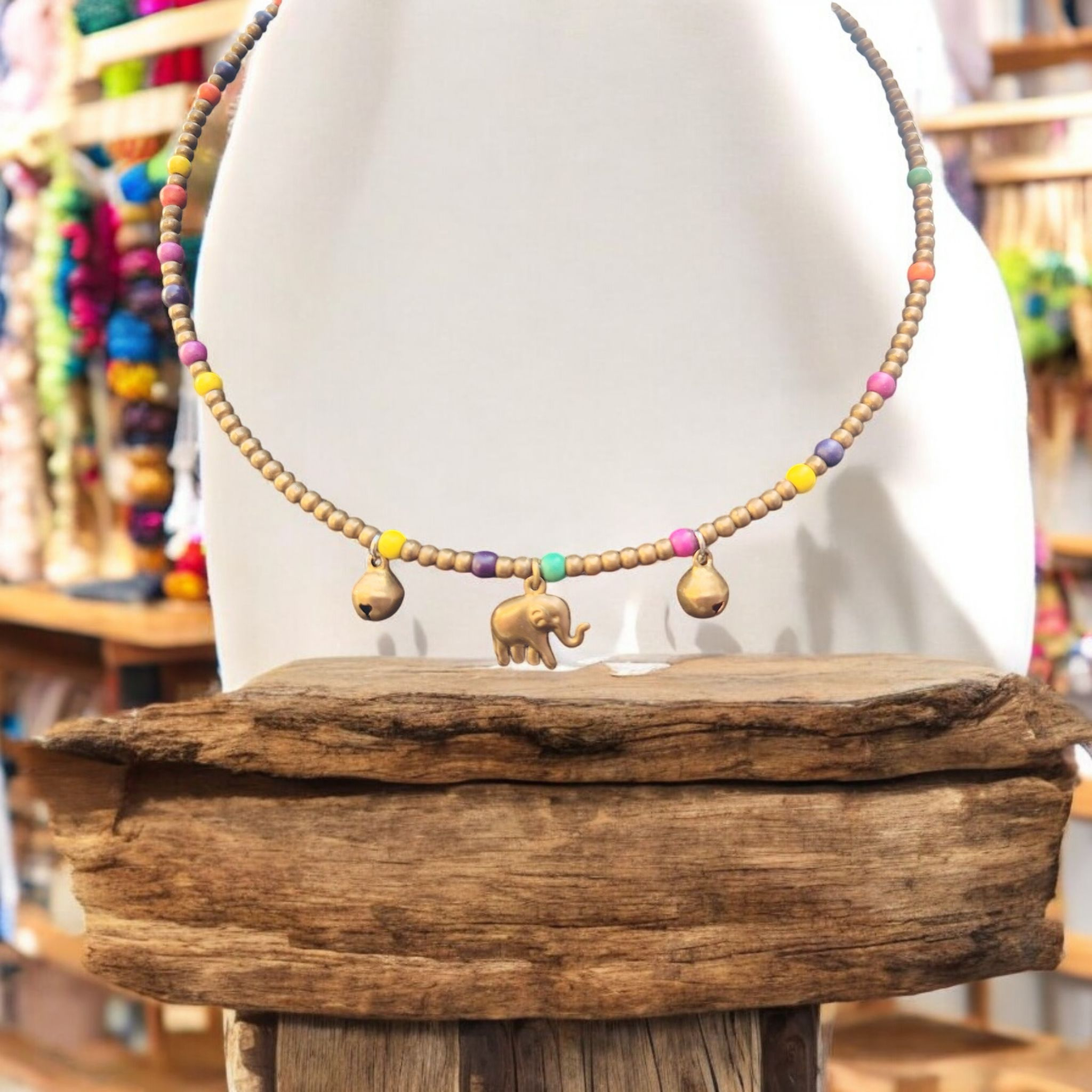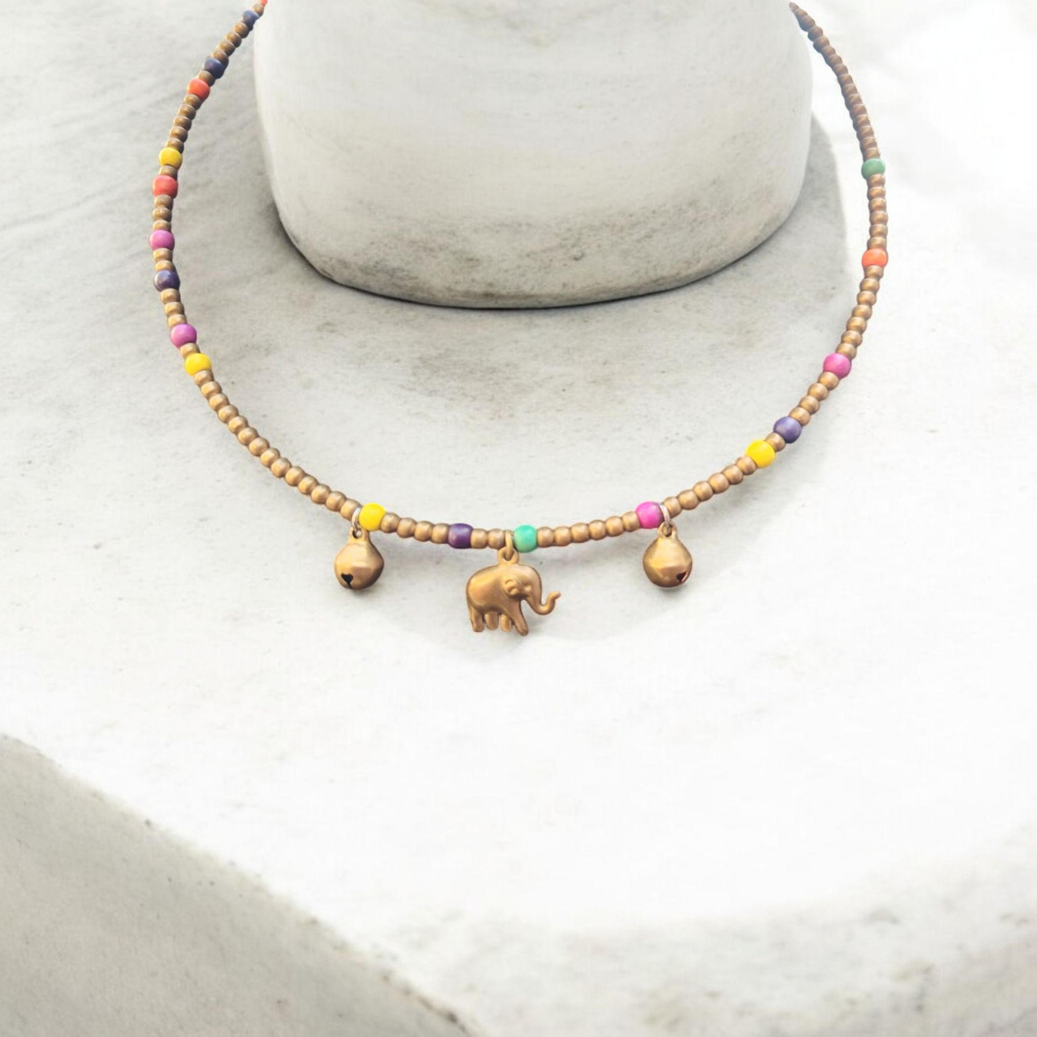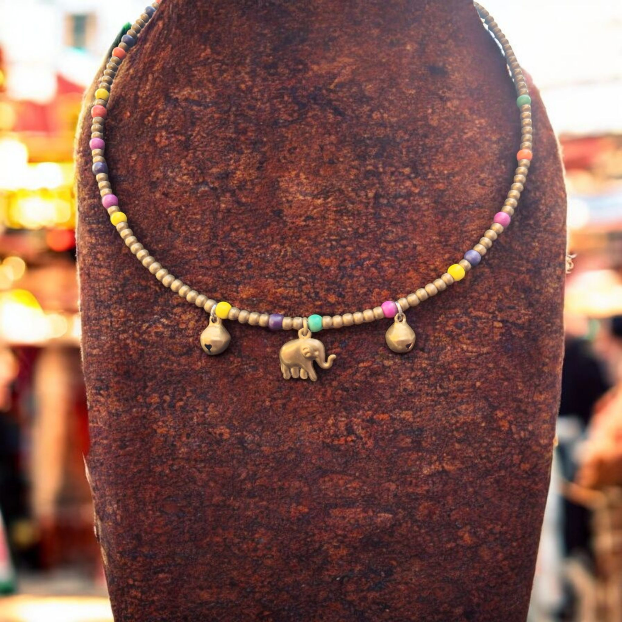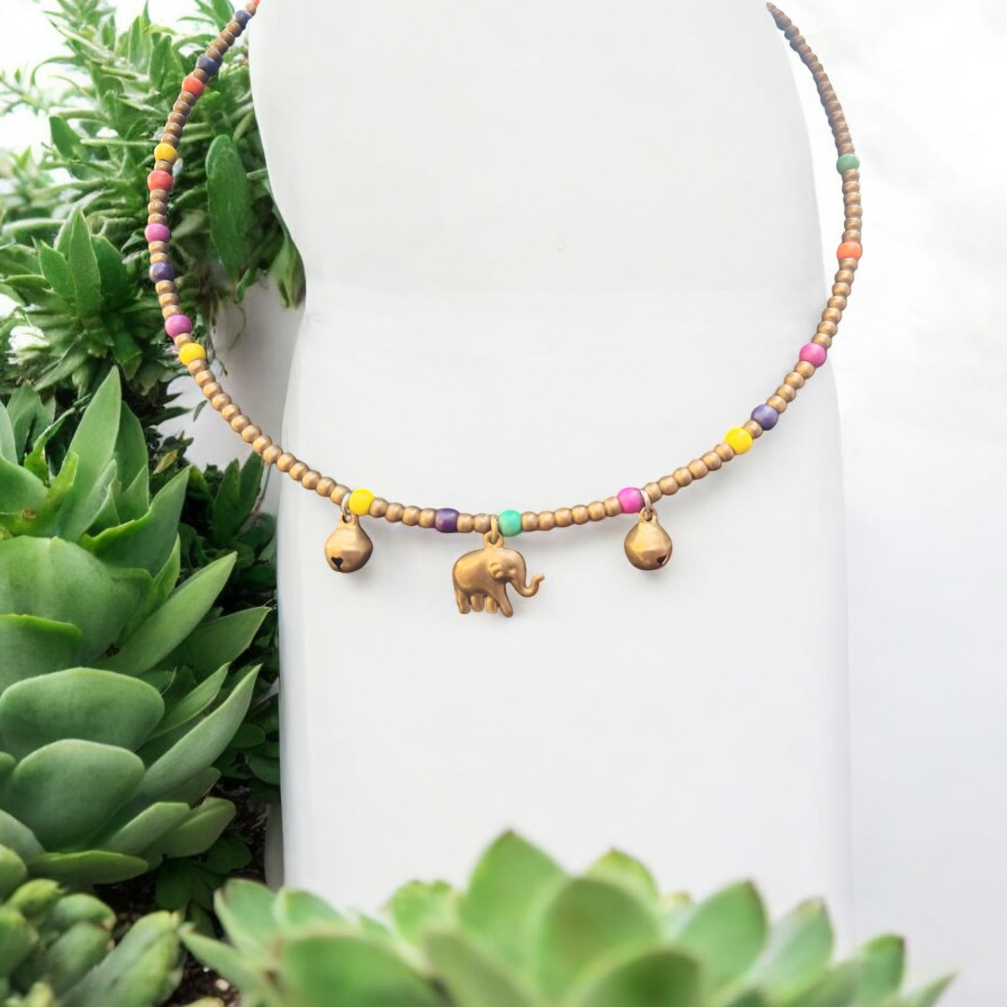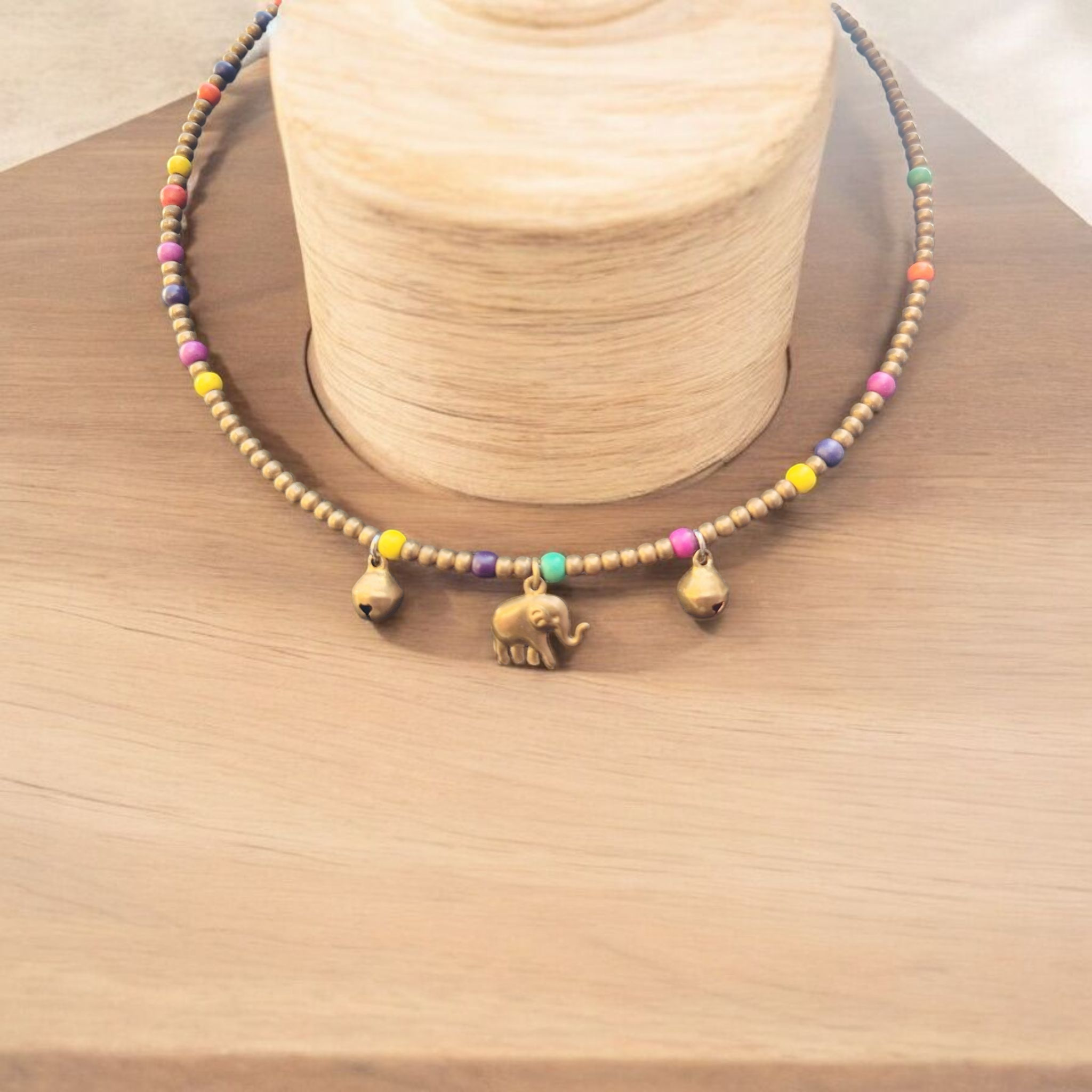 Au centre, un charm éléphant en laiton symbolise la sagesse, la force et la chance, accompagné de deux petits grelots assortis qui ajoutent une touche ludique et délicate à chaque mouvement. Les perles multicolores – dans des tons de jaune, rose, violet et vert menthe – apportent une note lumineuse et estivale à votre tenue.