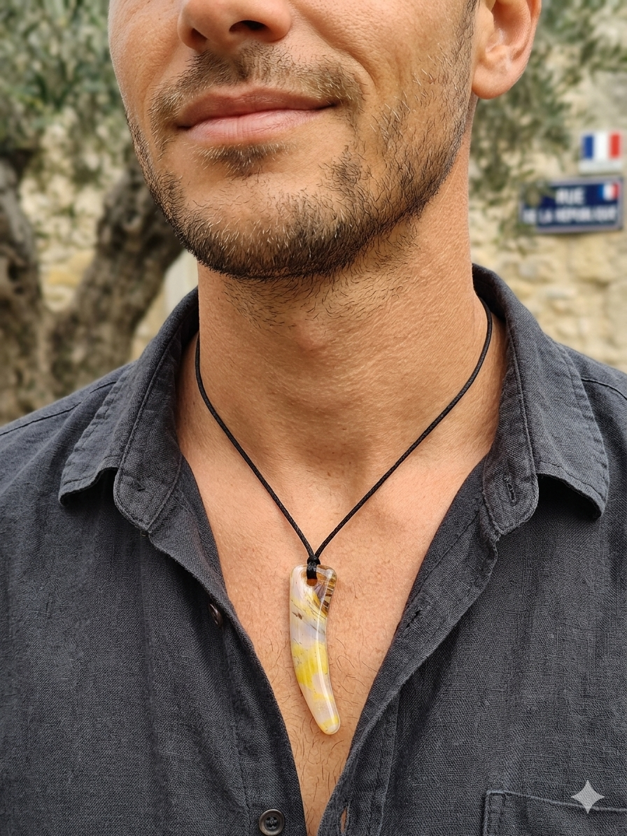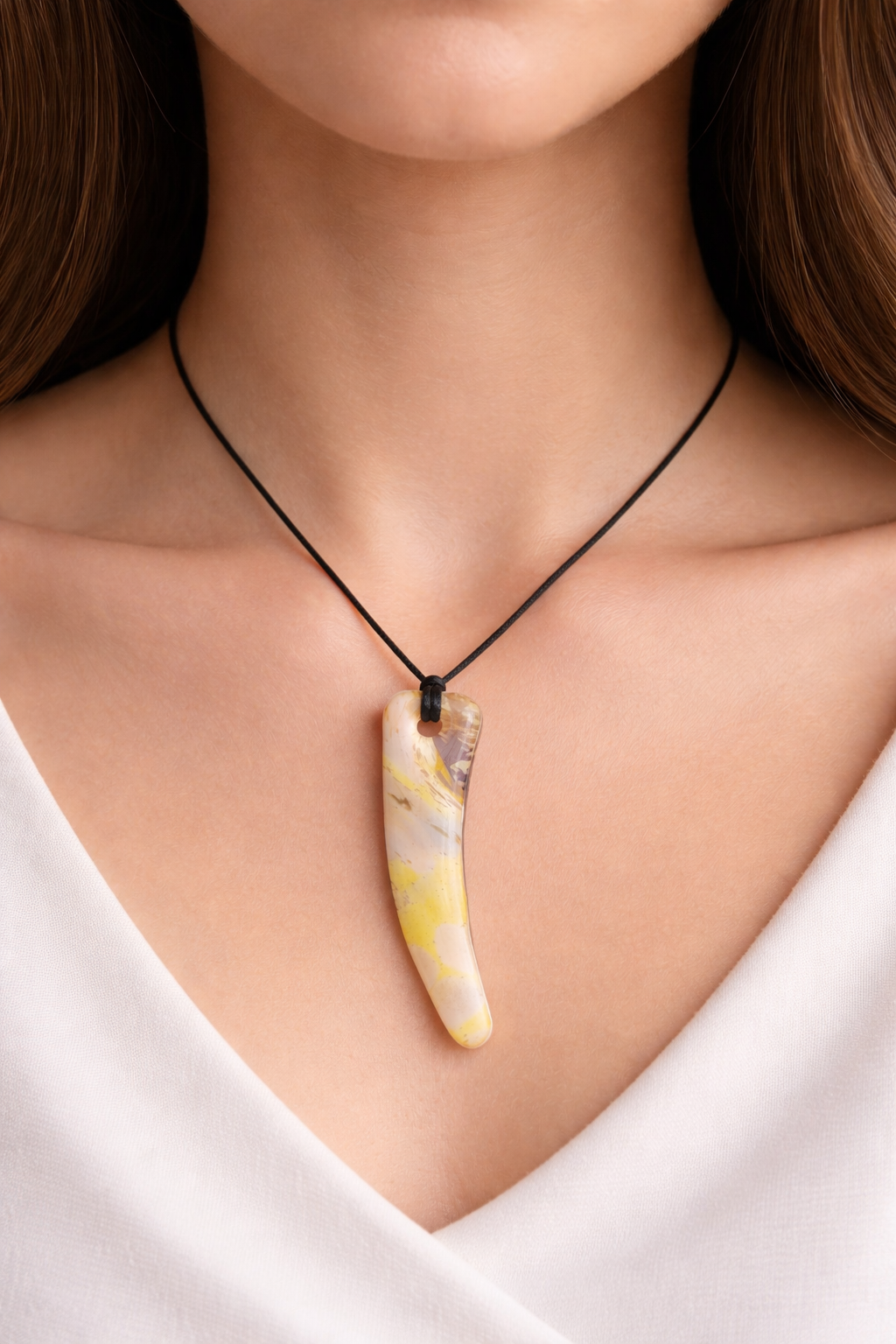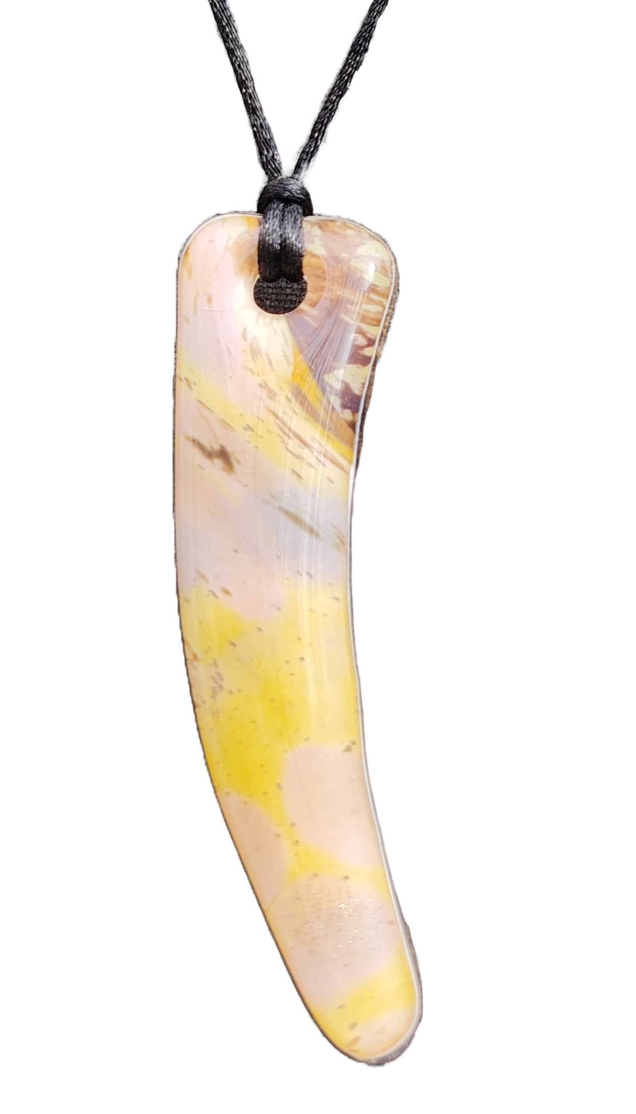 Portez un éclat de nature brute avec Griffe, un collier unique dont le pendentif en verre fait main évoque la puissance et l’élégance des éléments. Sa forme incurvée rappelle une griffe stylisée ou un éclat minéral poli par le temps. Les nuances douces de jaune, crème, brun et beige se mêlent harmonieusement dans une palette chaleureuse, semblable à une pierre précieuse façonnée par la terre.