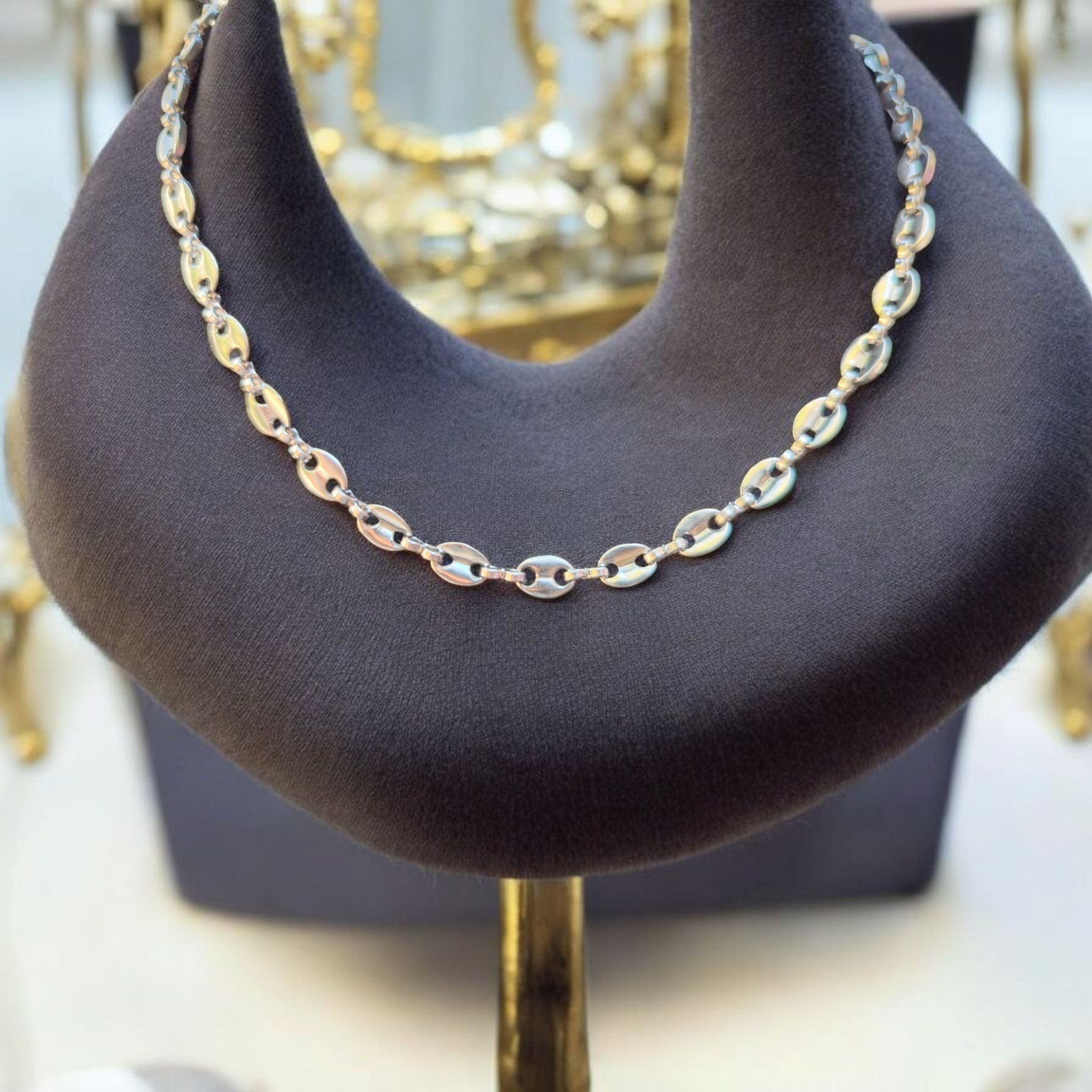 Design Tendance : La maille Graine de Café est un classique de la bijouterie, redevenue un incontournable de la mode actuelle. Elle apporte une touche chic, unisexe et audacieuse à toutes vos tenues.