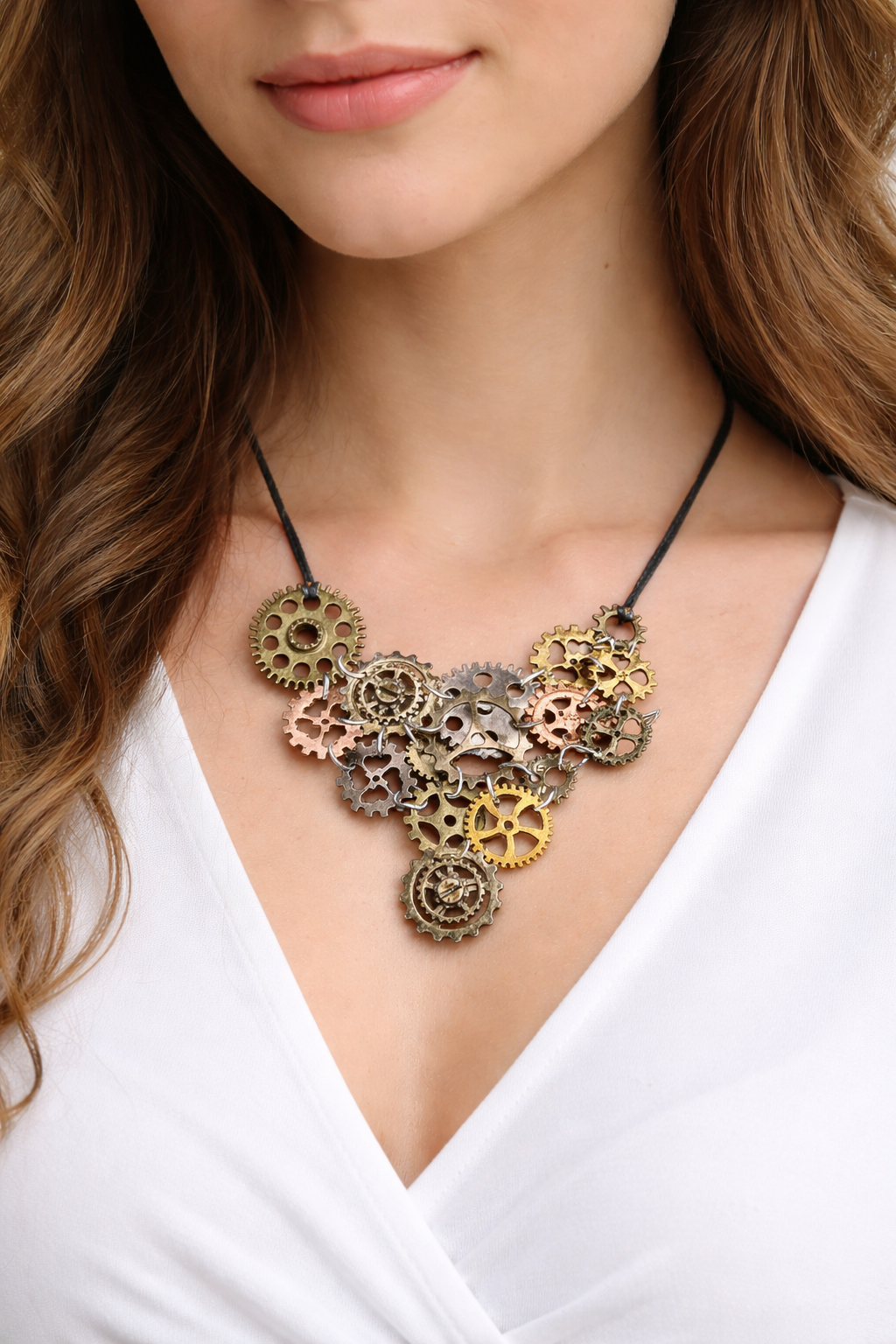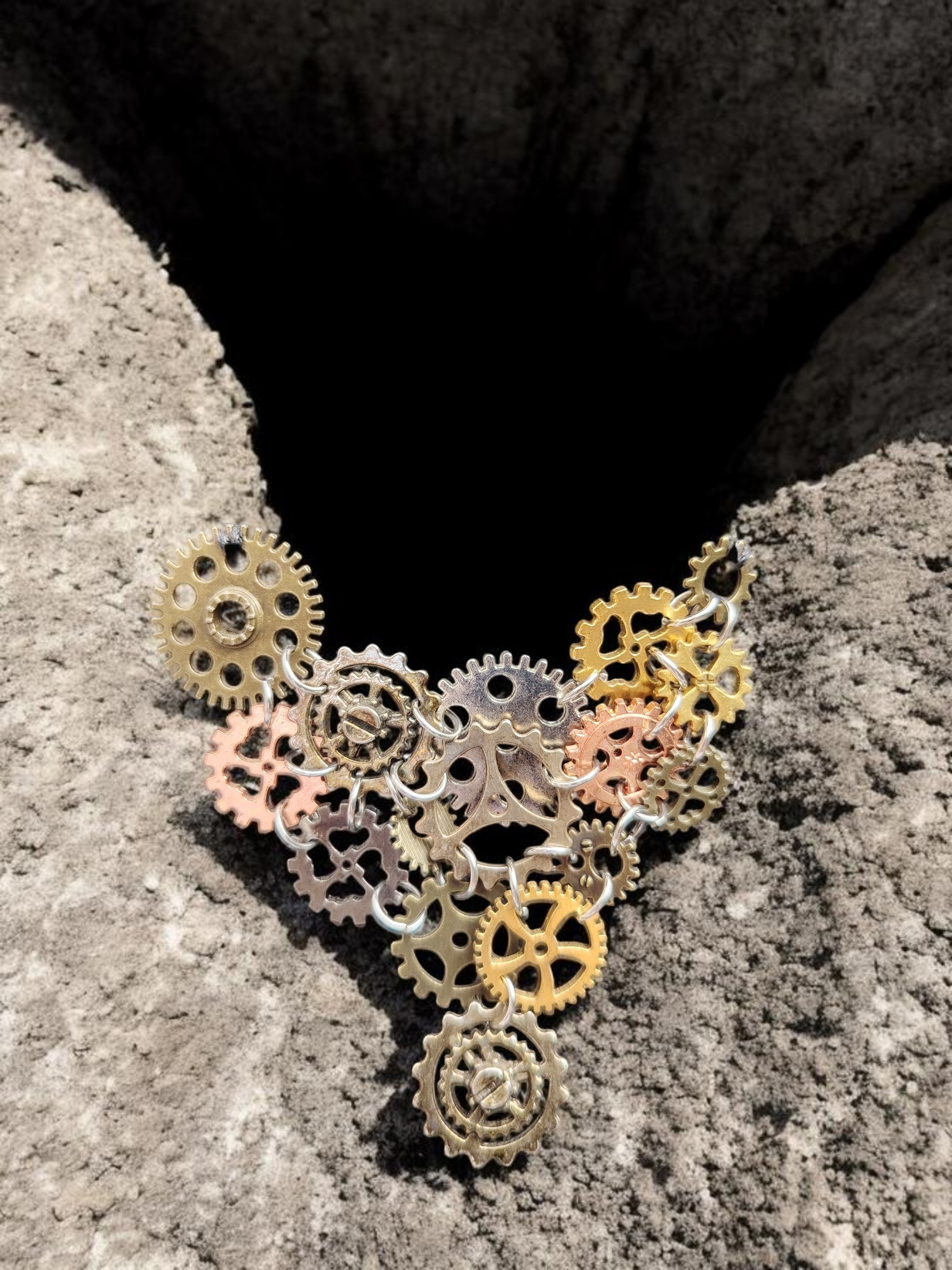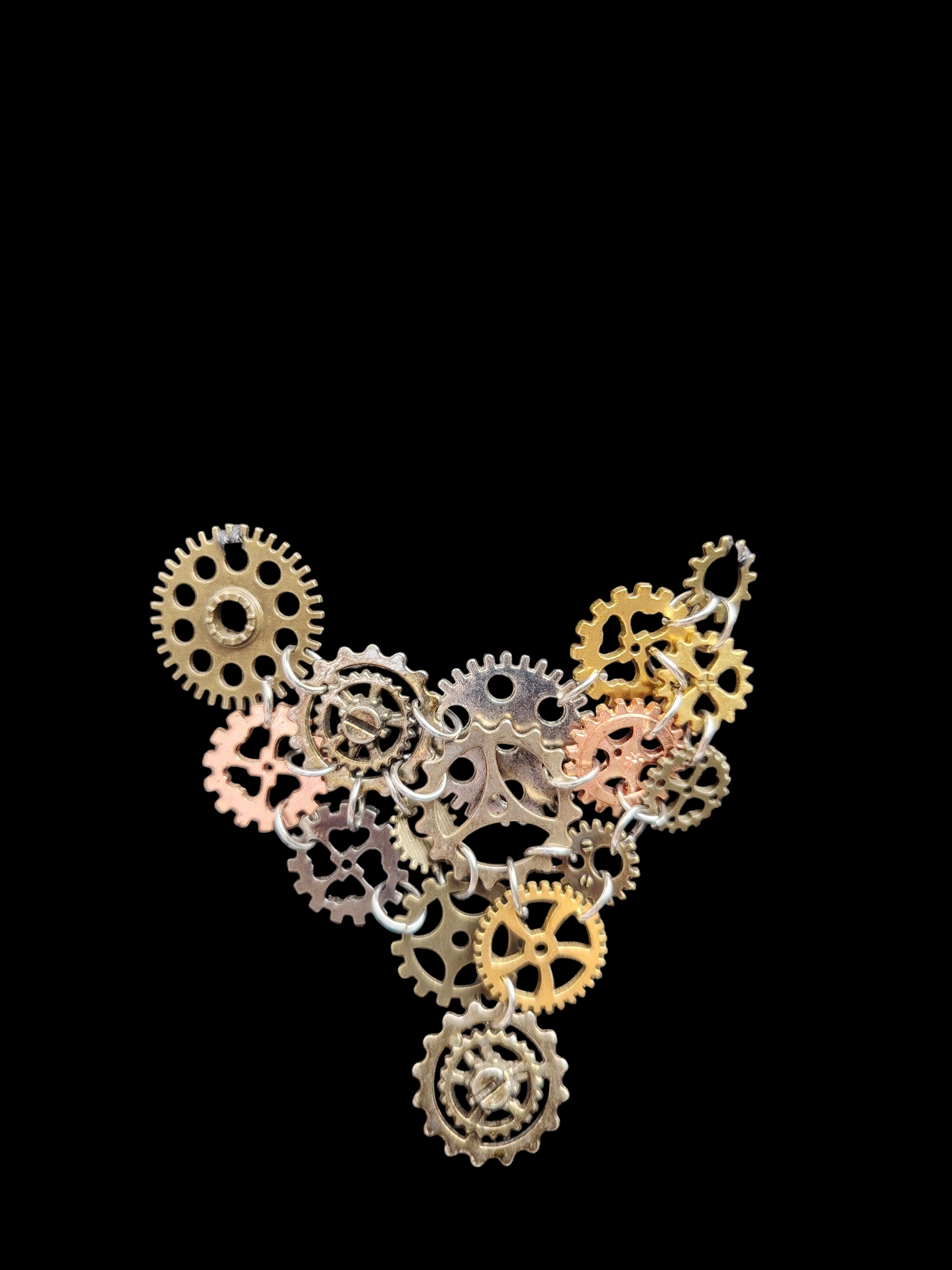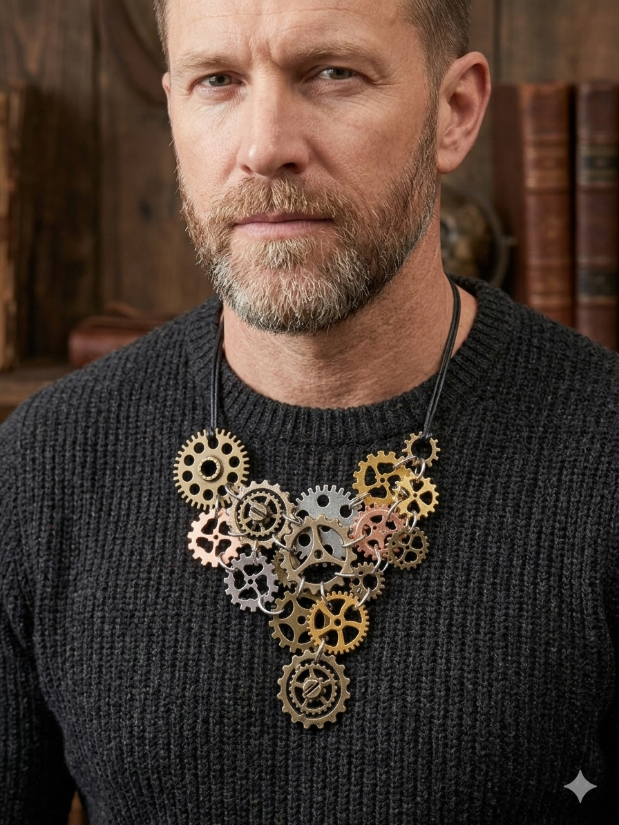 Ce collier unique marie l’élégance du fait main à l’audace du style steampunk. Composé d’un assemblage harmonieux de rouages métalliques aux teintes cuivrées, dorées et argentées, il évoque à la fois le mouvement du temps et la beauté brute de la mécanique. Chaque engrenage, minutieusement choisi et agencé, semble raconter une histoire — celle d’un cœur qui bat au rythme de la créativité.