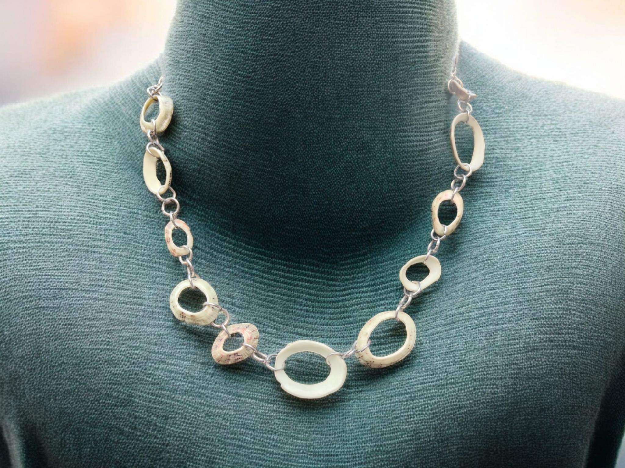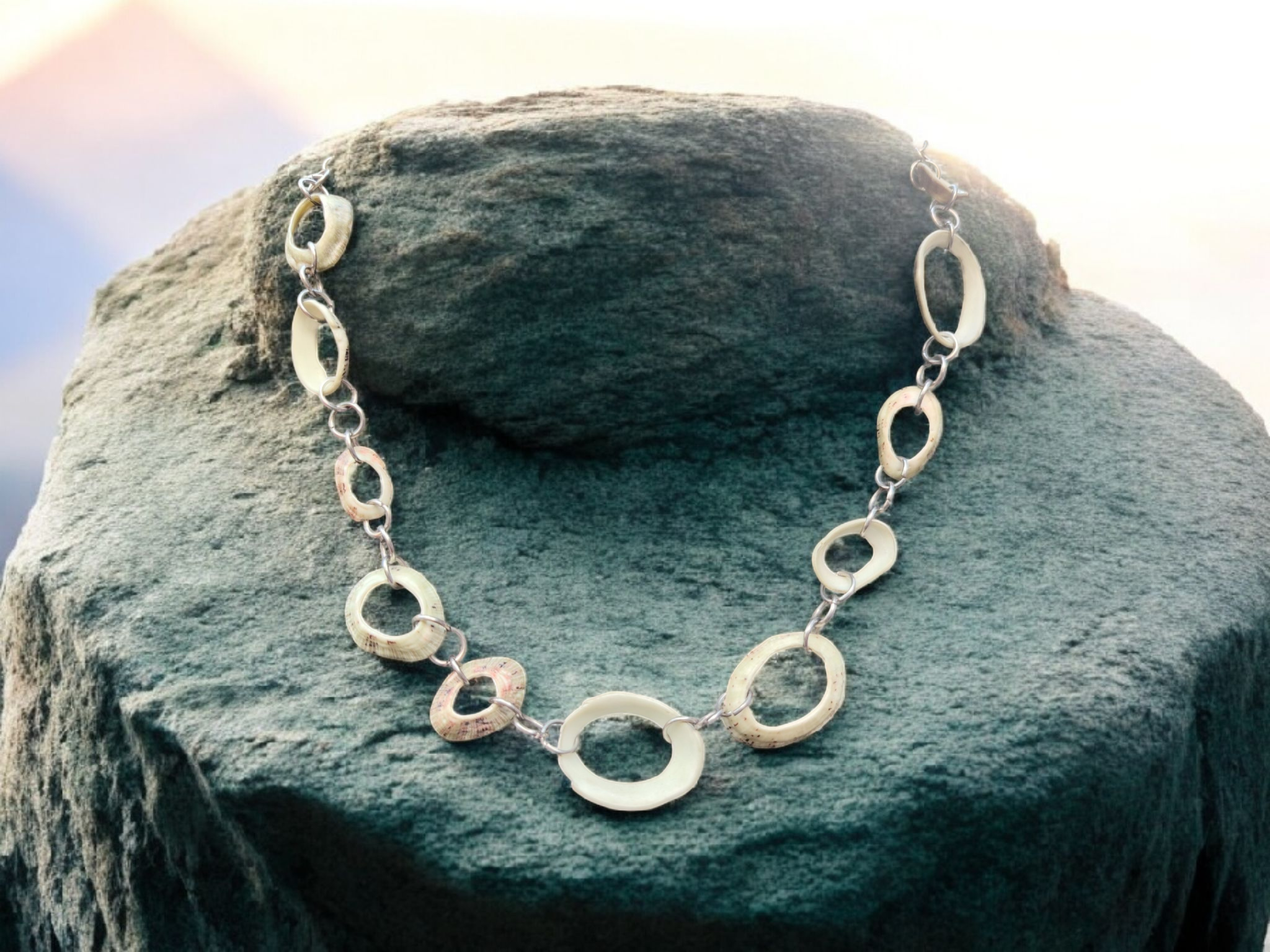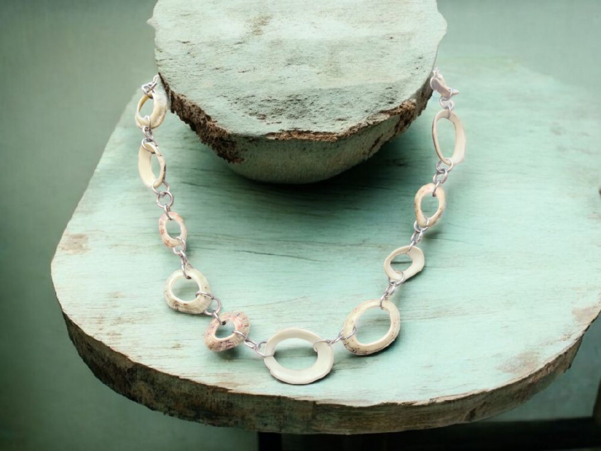 Fabriqué à la main à partir de coquillages naturels soigneusement polis, ce collier de 55 cm allie élégance organique et charme authentique.